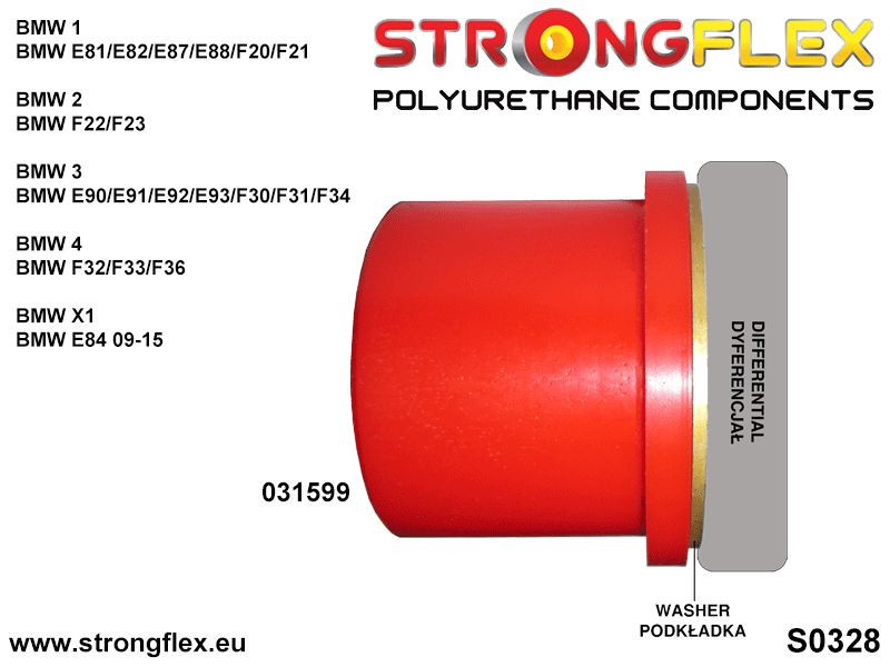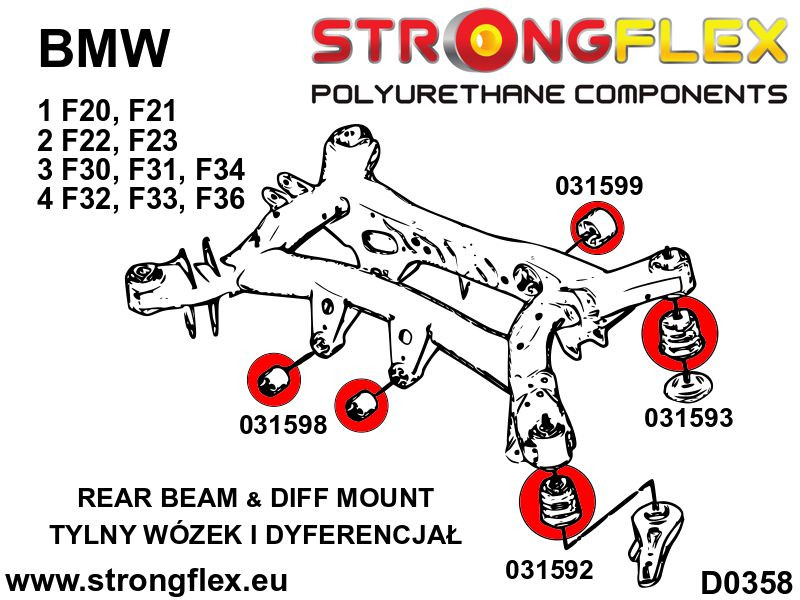 KIT ID: 036051BNazwa: Kompletny zestaw zawieszeniaPasuje do:BMW Seria 1 F20 F21BMW Seria 2 F22 F23BMW Seria 3 F30 F31 F34BMW Seria 4 F32 F33 F36Zestaw zawiera:2x 031948B Tuleja stabilizatora przedniego2x 031949B Tuleja przedniego zawieszenia - przednia2x 031950A Tuleja przedniego zawieszenia - tylna SPORT4x 031966A Tuleja wahacza tylnego – wleczonego SPORT2x 031967A Tuleja wahacza tylnego górnego – przednia SPORT2x 031968A Tuleja górna tylnej zwrotnicy – przednia SPORT2x 031969A Tuleja wahacza tylnego górnego – tylna SPORT2x 031970A Tuleja górna tylnej zwrotnicy – tylna SPORT4x 031971A Tuleja tylnego drążka SPORT2x 031972A Tuleja wahacza tylnego dolnego wewnętrzna SPORT2x 031973B Tuleja stabilizatora tylnego2x 031592B Tuleja tylnego wózka - przednia2x 031593B Tuleja tylnego wózka - tylna2x 031598B Tuleja mocowania tylnego dyferencjału przednia1x 031599B Tuleja mocowania tylnego dyferencjału tylnaUWAGA!Niektóre tuleje w zestawie są tylko w twardości 90ShA (kolor żółty), ponieważ oryginalne tuleje gumowe są wykonane z twardej mieszanki gumy.Zastosowanie tulei o twardości 80ShA (kolor czerwony) pogorszy prowadzenie samochodu względem oryginalnych tulei gumowych.Liczba sztuk w zestawie: 33Schematy:D0357D0358D0360S0328Twardość: 80/90ShAMateriał: POLIURETAN (PUR/PU)Do każdego produktu dodajemy smar!