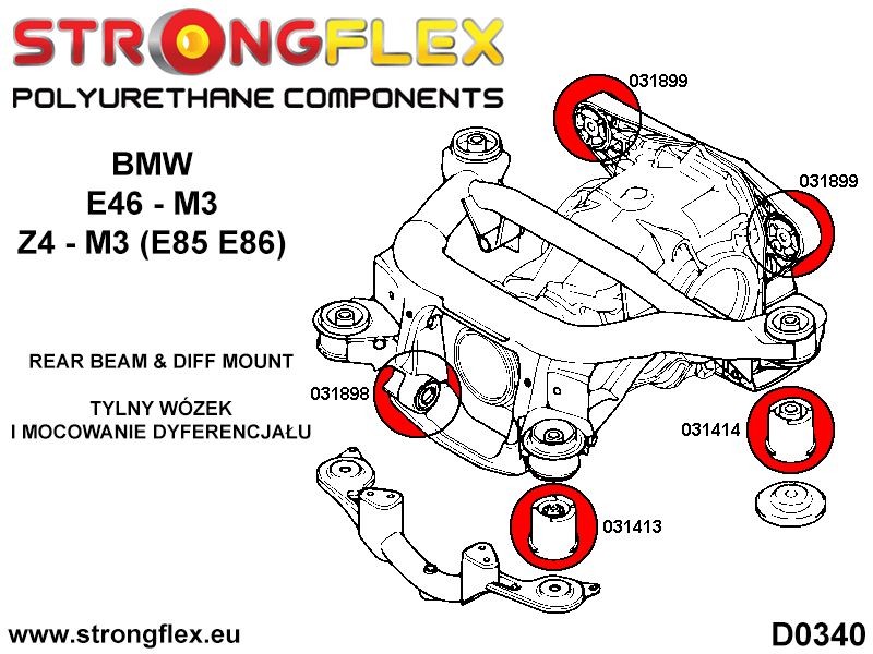 KIT ID: 036238BNazwa: Kompletny zestaw zawieszenia BMW E46 M3Pasuje do:BMW E46 M3Zestaw zawiera:2 x 031248B Tuleja stabilizatora przedniegoDostępne średnice:21,22,23,24,25,26,27,30mm2 x 031516B Tuleja wahacza przedniego tylna 60mm2 x 031173B Tuleja wahacza tylnego wzdłużnego mocowanie nadwozia2 x 031174B Tuleja wahacza tylnego górnego poprzecznego strona wewnętrzna2 x 031176B Tuleja wahacza tylnego dolnego poprzecznego strona wewnętrzna2 x 031586B Tuleja stabilizatora tylnegoDostępne średnice:11,12,13,14,15,16,18,21,22,23mm2 x 031413B Tuleja tylnego wózka przednia2 x 031414B Tuleja tylnego wózka tylna1 x 031898A Tuleja tylnego dyferencjału – przednia M3 SPORT2 x 031899A Tuleja tylnego dyferencjału – tylna M3 SPORTLiczba sztuk w zestawie: 19Liczba sztuk potrzebna na auto: 1Schematy:D0320D0347D0340UWAGA!Niektóre tuleje w zestawie są koloru ŻÓŁTEGO (90ShA), ponieważ oryginalne tuleje są z twardej mieszanki gumy. Zastosowanie tulei CZERWONYCH (80ShA) w niektórych wahaczach może mieć zły wpływ na prowadzenie samochodu.Twardość: 80ShAMateriał: POLIURETAN (PUR/PU)Do każdego produktu dodajemy smar!