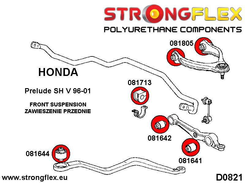 KIT ID: 086206ANazwa: Zestaw zawieszenia SPORTPasuje do:Honda Prelude SH V 96-01Zestaw zawiera:2x 081644B Tuleja przedniego drążka*2x 081642A Tuleja wahacza przedniego dolnego wewnętrzna SPORT2x 081641A Tuleja wahacza przedniego dolnego zewnętrzna SPORT4x 081805A Tuleja wahacza przedniego - górnego SPORT2x 081713A Tuleja stabilizatora przedniego SPORT4x 081743A Tuleja łącznika stabilizatora przedniego SPORT2x 081714A Tuleja stabilizatora tylnego SPORT2x 081753A Tuleja tylnego drążka SPORT*2x 081643A Tuleja wahacza tylnego dolnego wewnętrzna SPORT2x 081646A Tuleja wahacza tylnego dolnego zewnętrzna SPORT2x 081647A Tuleja wahacza tylnego wleczonego przednia SPORT*2x 081648A Tuleja wahacza tylnego wleczonego tylna SPORT4x 081639A Tuleja wahacza górnego SPORTUWAGA!Zestaw pasuje tylko do wersji SH.Wybierz odpowiednią średnicę stabilizatora przed dokonaniem zakupu. Jeżeli potrzebna jest inna średnica tulei stabilizatora prosimy o kontakt.*W celu zamontowania tulei 081644 i 081647 należy wypalić starą tuleję gumową. Nie usuwać zewnętrznej tulei metalowej, musi być użyta do zamontowania tulei poliuretanowej!*Tuleja 081753A nie pasuje do modeli z systemem 4WS (4 koła skrętne).Zaznacz odpowiedni wybór podczas dodawania do koszyka.Liczba sztuk w zestawie: 30/32Schematy:D0821D0823Twardość: 90/80ShAMateriał: POLIURETAN (PUR/PU)Do każdego produktu dodajemy smar!