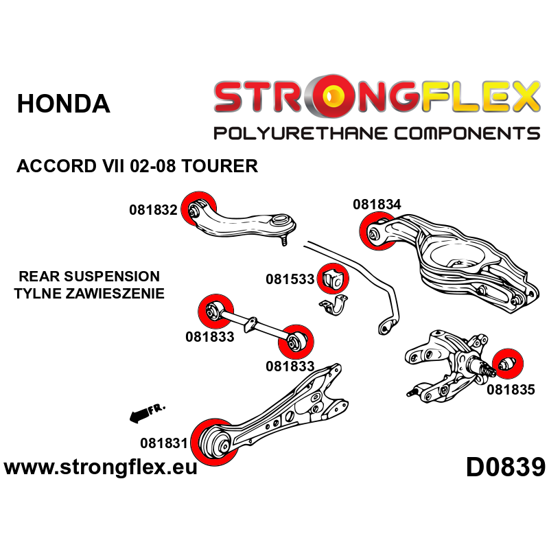 Numer produktu: 086234A Nazwa: Kompletny zestaw zawieszenia SPORT Pasuje do: Honda Accord VII (02-08) Tourer CM Zestaw zawiera: 4x 081819A: Tuleja wahacza przedniego górnego SPORT 2x 081820A: Tuleja wahacza przedniego dolnego – przednia SPORT 2x 081821A: Tuleja wahacza przedniego dolnego – tylna SPORT 2x 081822A: Tuleja wahacza przedniego dolnego – zewnętrzna SPORT 2x 081534A: Tuleja stabilizatora przedniego / tylnego SPORT 2x 081829A: Tuleja przedniego wózka – przednia SPORT 2x 081830A: Tuleja przedniego wózka – tylna SPORT 2x 081831A: Tuleja wahacza tylnego wzdłużnego SPORT 2x 081832A: Tuleja wahacza tylnego górnego SPORT 4x 081833A: Tuleja wahacza tylnego SPORT 2x 081834A: Tuleja wahacza tylnego poprzecznego SPORT 2x 081835A: Tuleja tylnej zwrotnicy SPORT 2x 081533A: Tuleja stabilizatora przedniego / tylnego SPORT 2x 081706A: Tuleja przekładni kierowniczej SPORT 1x 081836A: Tuleja przekładni kierowniczej SPORT Schematy: D0836 D0839 D0838 D0840 Liczba sztuk potrzebna na auto: 1 Liczba sztuk w paczce: 1 Liczba sztuk w zestawie: 33 Twardość: 90Sha Materiał: POLIURETAN (PUR/PU) Do każdego produktu dodajemy smar! Skontaktuj się z nami w celu wyboru średnicy Średnica przód stab. 26mm 28mm 26.5mm Custom Średnica tył stab. 18mm 19mm Custom