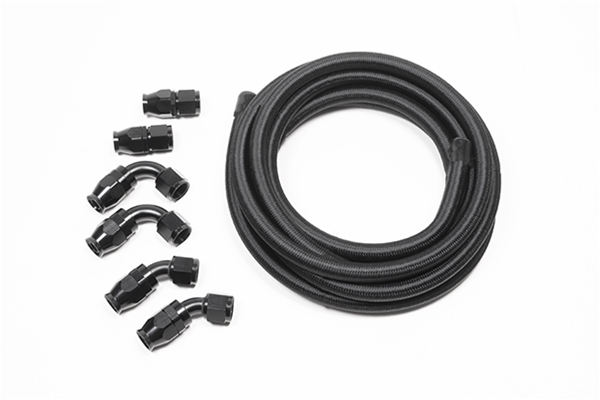 All Radium Engineering PTFE hoses have been successfully tested in-house to 1200psi although PTFE can typically withstand 2500psi+. They are also for extreme temperatures (-94F to +480F). They feature an extruded PTFE (fluoropolymer) core wrapped in a stainless steel wire braided sleeve. The outer coating for the universal DIY ends is braided PET. All hose ends are type-II black anodized aluminum.