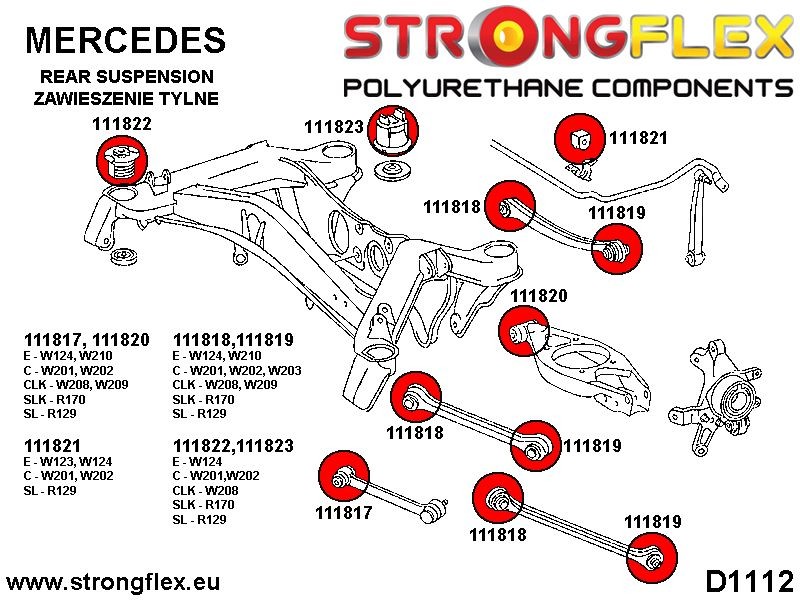 KIT ID: 116240BNazwa: Kompletny zestaw zawieszeniaPasuje do:Mercedes C - W202Zestaw zawiera: 2 x 111814B Tuleja stabilizatora przedniego - wewnętrznaDostępne średnice:22,23,25,28mm2 x 111815B Tuleja stabilizatora przedniego - zewnętrznaDostępne średnice:18,22,23,25,28mm2 x 111857B Tuleja wahacza przedniego - górnego2 x 111858B Tuleja wahacza przedniego dolnego - przednia2 x 111859B Tuleja wahacza przedniego dolnego - tylna2 x 111817A Tuleja tylnego drążka SPORT6 x 111818B Tuleja wahacza tylnego - wewnętrzna6 x 111819B Tuleja wahacza tylnego - zewnętrzna2 x 111820B Tuleja wahacza tylnego dolnego - wewnętrzna2 x 111821B Tuleja stabilizatora tylnegoDostępne średnice:13,14,15,16,17,18,19,20,21,22mm2 x 111822B Tuleja belki tylnej - przednia2 x 111823B Tuleja belki tylnej - tylnaLiczba sztuk w zestawie: 32Liczba sztuk potrzebna na auto: 1Schematy:D1112D1115UWAGA!Wybierając średnicę tulei stabilizatora przedniego 111814 i 111815, pamiętaj o sprawdzeniu wewnętrznej oraz zewnętrznej średnicy stabilizatora.111819 - Podczas montażu należy użyć oryginalną tuleję redukcyjną 13mm ze starego wahacza. Twardość: 80ShAMateriał: POLIURETAN (PUR/PU)Do każdego produktu dodajemy smar!