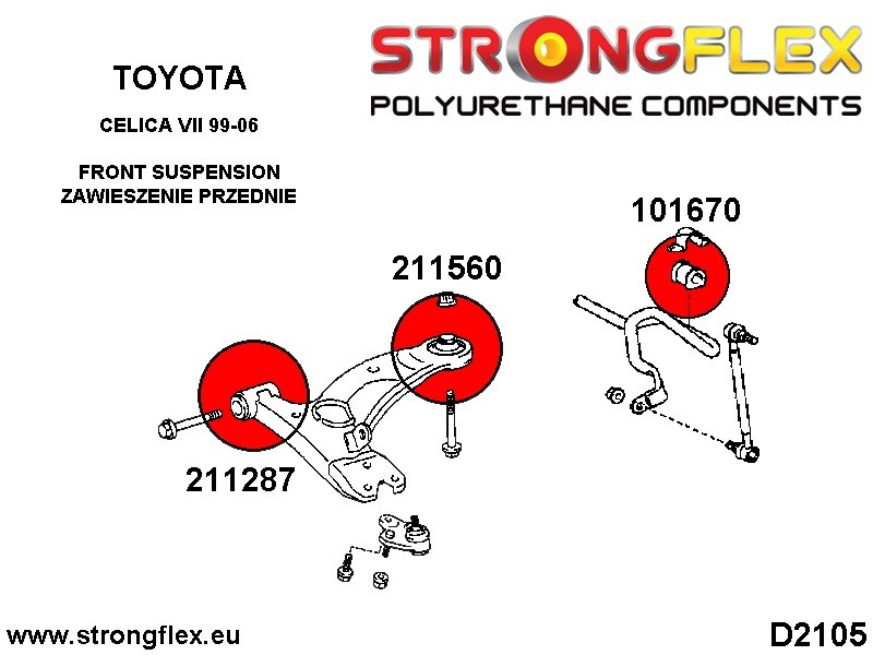 KIT ID: 216181ANazwa: Kompletny zestaw zawieszenia SPORTPasuje do:Toyota Celica VII 99-06Zestaw zawiera:2 x 101670A Tuleja stabilizatora przedniego SPORTDostępne średnice:21mm22mm26,5mm2 x 211287A Tuleja wahacza przedniego przednia SPORT2 x 211560A Tuleja wahacza przedniego tylna SPORT2 x 211568A Tuleja wahacza tylnego przednia SPORT2 x 211569A Tuleja wahacza tylnego wewnętrzna SPORT4 x 211570A Tuleja wahacza tylnego zewnętrzna SPORT4 x 211571A Tuleja wahacza tylnego górnego SPORT2 x 211600A Tuleja stabilizatora tylnego SPORTDostępne średnice:16mm17mm18mm19mm20mm21mm22mmLiczba sztuk w zestawie: 20Liczba sztuk potrzebna na auto: 1Schematy:D2105D2106UWAGA!Przy zamówieniu zawsze należy podawać właściwą średnicę stabilizatora lub wybierać odpowiedni produkt (o zdefiniowanej i opisanej średnicy).UWAGA!W celu zamontowania tulei 211568 należy wypalić starą tuleję gumową. Nie usuwać zewnętrznej tulei metalowej, musi być użyta do zamontowania tulei poliuretanowej!Twardość: 90ShAMateriał: POLIURETAN (PUR/PU)Do każdego produktu dodajemy smar!
