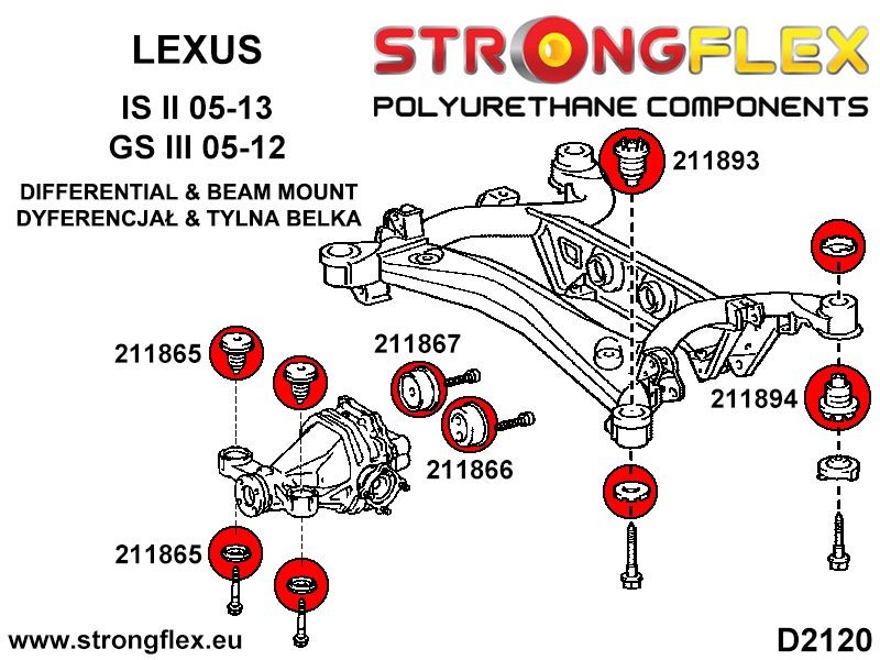 KIT ID: 216235ANazwa: Kompletny zestaw zawieszenia SPORTPasuje do:Lexus IS II 05-13Lexus GS III 05-12Zestaw zawiera:4 x 211884A Tuleja wahacza przedniego górnego SPORT2 x 211885A Tuleja stabilizatora przedniego SPORTDostępne średnice:27mm2 x 211886A Tuleja wahacza przedniego - przednia SPORT2 x 211887A Tuleja wahacza przedniego - tylna SPORT2 x 211888A Tuleja tylnego dolnego drążka SPORT4 x 211889A Tuleja wahacza tylnego - górnego SPORT2 x 211890A Tuleja tylnego górnego drążka SPORT4 x 211891A Tuleja wahacza tylnego wleczonego SPORT2 x 211837A Tuleja wahacza tylnego dolnego wewnętrzna SPORT2 x 211892A Tuleja stabilizatora tylnego SPORTDostępne średnice:14mm2 x 211893A Tuleja belki tylnej – przednia SPORT2 x 211894A Tuleja belki tylnej - tylna SPORT2 x 211865A Tuleja tylnego dyferencjału - przednia SPORT2 x 211866A Tuleja tylnego dyferencjału - tylna SPORT2 x 211867A Tuleja tylnego dyferencjału - tylna SPORTLiczba sztuk w zestawie: 34Liczba sztuk potrzebna na auto: 1Schematy:D2118D2119D2120Twardość: 90ShAMateriał: POLIURETAN (PUR/PU)Do każdego produktu dodajemy smar!