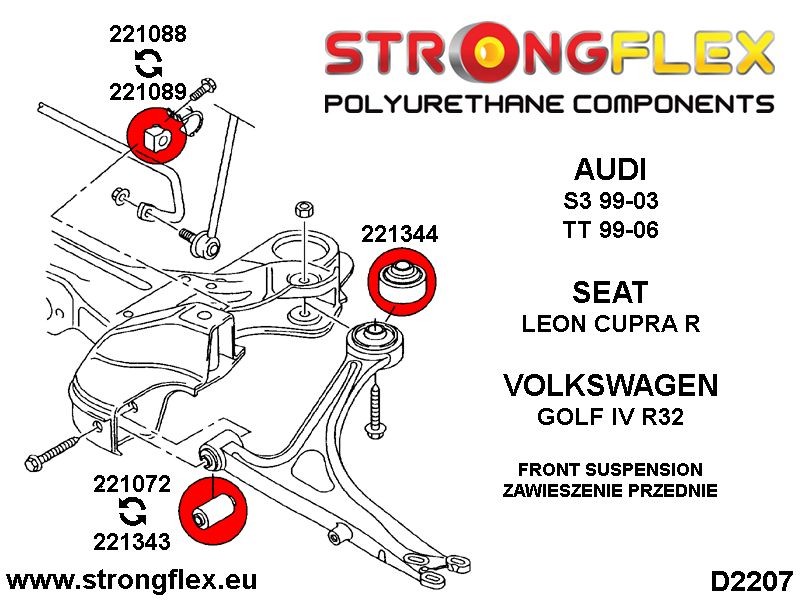 KIT ID: 226121BNazwa: Kompletny zestaw zawieszeniaPasuje do:Audi S3 99-03Audi TT 99-03 QuattroSeat Leon & Cupra R 4x4 99-05Volkswagen Golf IV R32Zestaw zawiera:2 x 221088B Tuleja stabilizatora przedniegolub2 x 221089B Tuleja stabilizatora przedniegoDostępne średnice:15,19,20,21,23mm2 x 221072B Tuleja wahacza przedniego - przednia (30mm)lub2 x 221343B Tuleja wahacza przedniego - przednia (45mm)2 x 221344B Tuleja wahacza przedniego - tylna4 x 221371B Tuleja wahacza tylnego poprzecznego - wewnętrzna4 x 221940A Tuleja tylnej zwrotnicy SPORT2 x 221372B Tuleja wahacza tylnego dolnego wleczonego mocowanie nadwozia2 x 221445B Tuleja stabilizatora tylnegoDostępne średnice:12,13,14,15,16,17,18,19mm2 x 221862B Tuleja tylnego dyferencjału - przednia2 x 221863B Tuleja tylnego dyferencjału - tylna4 x 221864B Tuleja belki tylnejLiczba sztuk w zestawie: 26Liczba sztuk potrzebna na auto: 1Schematy:S2201S2202D2207D2208UWAGA!Zestaw pasuje wyłącznie do wahaczy stalowych odlewanych! Występują dwa rodzaje tulei przednich wahacza przedniego, późniejsze modele miały tuleje większe Ø45mm (221343), natomiast modele wcześniejsze wyposażone były w tuleje mniejsze Ø30mm (221072). Nim złożą Państwo zmówienie, proszę dokładnie sprawdzić, jaką tuleję macie Państwo w swoim samochodzie (Patrz zdjęcie S2201)! Występują dwa rodzaje tulei przedniego stabilizatora. STARY TYP - 221088 LUB NOWY TYP - 221089 Przed zakupem sprawdź typ tulei oraz średnicę. Patrz zdjęcie S2202 Tuleja 221940A występuje tylko w twardości 90ShA (kolor żółty), ponieważ oryginalna tuleja gumowa jest wykonana z twardej mieszanki gumy. Zastosowanie tulei o twardości 80ShA (kolor czerwony) pogorszy prowadzenie samochodu względem oryginalnej tulei gumowej.Twardość: 80ShAMateriał: POLIURETAN (PUR/PU)Do każdego produktu dodajemy smar!