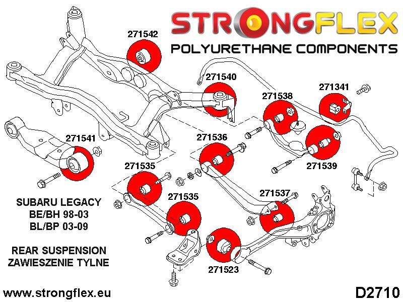 Prod ID: 276159ANazwa: Kompletny zestaw tulei tylnego zawieszenia SPORTPasuje do:Subaru Legacy/Outback BE BH 98-03Baja 02-06Zestaw zawiera:271523A x 2 Tuleja wahacza tylnego wleczonego przednia SPORT271535A x 4 Tuleja wahacza tylnego dolnego przedniego SPORT271536A x 2 Tuleja wahacza tylnego dolnego wewnętrzna SPORT271537A x 2 Tuleja wahacza tylnego dolnego zewnętrzna SPORT271538A x 2 Tuleja wahacza tylnego górnego wewnętrzna SPORT271539A x 2 Tuleja wahacza tylnego górnego zewnętrzna SPORT271540A x 4 Tuleja belki tylnej SPORT271541B x 2 Tuleja tylnego dyferencjału - przednia271542B x 2 Tuleja tylnego dyferencjału - tylna 271341A x 2 Tuleja stabilizatora tylnego SPORTUWAGA: zmierz średnicę stabilizatora przed złożeniem zamówienia.Liczba sztuk w paczce: 24Liczba sztuk potrzebna na auto: 1Schematy:D2710 Zawieszenie tylne Poliuretan Subaru Legacy BE BH 98-03, BL BP 03-09, Liberty BE BH 98-03, BL BP 03-09Twardość: 90ShAMateriał: POLIURETAN (PUR/PU)Do każdego produktu dodajemy smar!