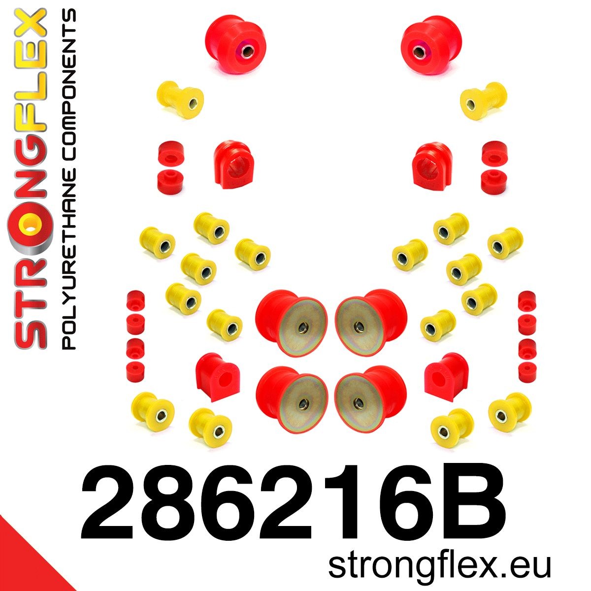 KIT ID: 286216BNazwa: Kompletny zestaw zawieszenia R32Pasuje do:Nissan Skyline R32Zestaw zawiera:2 x 281400B Tuleja stabilizatora przedniegoDostępne średnice:25,27mm2 x 281265B Tuleja przekładka łącznika stabilizatora przedniego2x 281263A Tuleja wahacza przedniego dolnego 31.6mm SPORTlub2x 281397A Tuleja wahacza przedniego dolnego 35mm SPORT2 x 281262B Tuleja przedniego drążka reakcyjnegolub2 x 281788B Tuleja przedniego drążka reakcyjnego GT-R12 x 281218A Tuleja wahacza tylnego górnego SPORT4 x 281267A Tuleja wahacza tylnego dolnego wewnętrzna SPORT2 x 281268B Tuleja stabilizatora tylnegoDostępne średnice:15,18mm2 x 281269B Tuleja przekładka łącznika stabilizatora tylnego4 x 281270B Tuleja tylnego wózkaLiczba sztuk w zestawie: 32Liczba sztuk potrzebna na auto: 1Schematy:D2821D2805UWAGA! Występują dwa rodzaje tulei przednich wahacza przedniego, Ø31,6mm (281263) i Ø35mm (281397). Nim złożą Państwo zmówienie, proszę dokładnie sprawdzić, jaką tuleję macie Państwo w swoim samochodzie.W celu zamontowania tulei należy wypalić starą tuleję gumową.Nie usuwać zewnętrznej tulei metalowej, musi być użyta do zamontowania tulei poliuretanowej!UWAGA!Tuleja 281788 pasuje tylko do modelu GT-R 4x4. Długość tulei 83mm. Przed zakupem sprawdź wymiar.Twardość: 80/90ShAMateriał: POLIURETAN (PUR/PU)Do każdego produktu dodajemy smar!