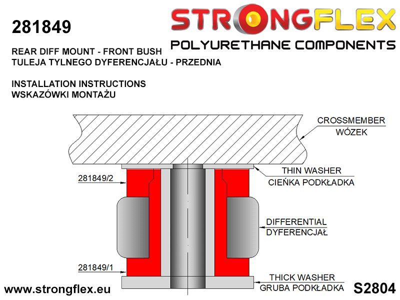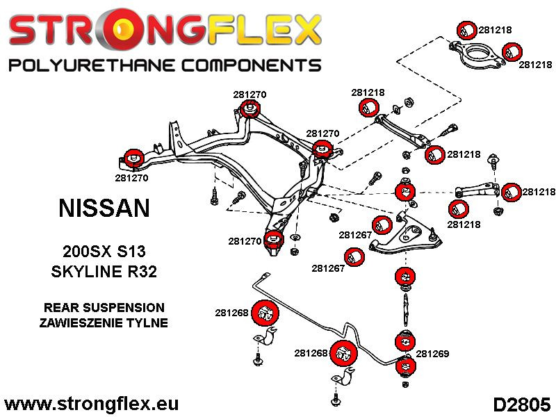 KIT ID: 286218ANazwa: Kompletny zestaw zawieszenia SPORTPasuje do:Nissan 300ZX Z32 90-96Zestaw zawiera:2 x 281262A Tuleja przedniego drążka reakcyjnego SPORT2 x 281957A Tuleja wahacza przedniego górnego - górna SPORT2 x 281958A Tuleja wahacza przedniego górnego - dolna SPORT2 x 281397A Tuleja wahacza przedniego dolnego 35mm SPORT2 x 281207A Tuleja stabilizatora przedniego SPORT8 lub 12 x 281218A Tuleja wahacza tylnego SPORT4 x 281267A Tuleja wahacza tylnego dolnego SPORT2 x 281268A Tuleja stabilizatora tylnego SPORT4 x 281269A Tuleja przekładka łącznika stabilizatora tylnego SPORT4 x 281270A Tuleja tylnego wózka SPORT2 x 281959A Tuleja tylnego amortyzatora - dolna SPORT1 x 281261A Tuleje przekładni kierowniczej SPORT2 x 281849A Tuleja tylnego dyferencjału - przednia SPORT2 x 281850A Tuleja tylnego dyferencjału - tylna SPORTUWAGA!281397AW celu zamontowania tulei należy wypalić starą tuleję gumową.Nie usuwać zewnętrznej tulei metalowej, musi być użyta do zamontowania tulei poliuretanowej!281218AZ systemem Hicas 8szt, bez HICAS 12szt281261AŚrednica 45mm, 48mm lub 50mm.281959ATuleja pasuje tylko do aluminiowej zwrotnicy i do amortyzatora z odpowiednim mocowaniem (patrz D2823)Liczba sztuk w zestawie: 37/43Schematy:D2822D2823D2803D2805D2820S2804Twardość: 90ShAMateriał: POLIURETAN (PUR/PU)Do każdego produktu dodajemy smar!