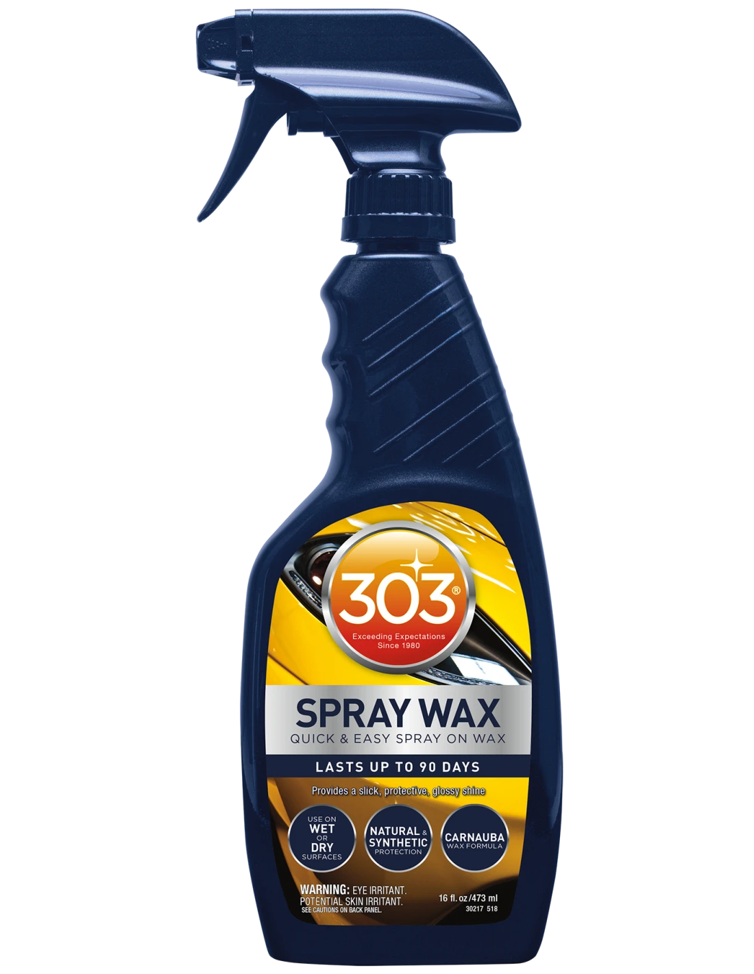 303 Spray Wax Najszybszy nabłyszczający wosk w płynie Nie pozostawia smug, ściera się łatwo i czysto Formuła zawiera naturalny wosk Carnauba Zabezpiecza przed promieniami UV 303® Automotive Spray Wax to najszybszy nabłyszczający wosk w płynie dla Twojego samochodu. To również delikatnie czyszcząca formuła, która usuwa z lakieru ślady po zaschniętej wodzie, kurz i inne niewielkie zabrudzenia. Pozostawia przy tym ochronną warstwę wosku, która osiąga trwałość aż do 90 dni. Zapewnia również ponadprzeciętną ochronę przed promieniami UV, zapobiegając blaknięciu lakieru. Sposób użycia: Dla najlepszego efektu stosować na czyste powierzchnie. Produkt może być aplikowany zarówno na mokre jak i suche powierzchnie. Spryskaj powierzchnię lakieru. Rozprowadź na powierzchni lakieru używając czystego ręcznika z mikrofibry. Dla najlepszego rezultatu delikatnie wypoleruj powierzchnię drugim, czystym ręcznikiem z mikrofibry. 303 Automotive Spray Wax można bezpiecznie stosować do następujących powierzchni: Chrom, Stal nierdzewna i aluminium Lakier bezbarwny Lakier i włókno szklane Plastiki teksturowane i przezroczyste Dostępne pojemności: 473ml