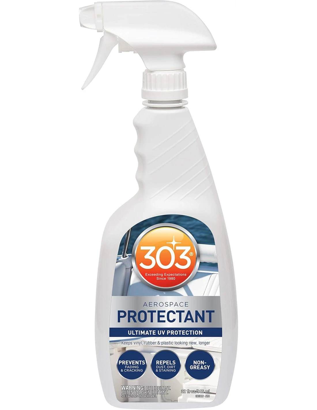 Silne filtry UV zapobiegają blaknięciu, pękaniu i przedwczesnemu starzeniu się Schnie do czystego, naturalnego wykończenia Przywraca utracony kolor i połysk Łatwy w użyciu: wystarczy spryskać i wytrzeć do sucha Bezpieczny i skuteczny na: winylu, włóknie węglowym, gumie, plastiku i wykończonej tapicerce skórzanej Żaden inny produkt nie zapewnia tak dużej ochrony łodzi i sprzętu wodnego. Użyj Aerospace Protectant, aby utrzymać siedzenia, żagle, kadłub i okna łodzi w kolorze i czystości. Marine Aerospace Protectant to najwyższej jakości środek ochronny przeznaczony do ochrony łodzi i sprzętu marinistycznego przed szkodliwym działaniem codziennej ekspozycji na promienie UV. Jest również bezpieczny do stosowania na sprzęcie i odzieży outdoorowej. Po prostu spryskaj i wytrzyj do sucha, aby przywrócić kolor i połysk, odstraszyć plamy i zapobiec blaknięciu nawet w najtrudniejszych warunkach morskich i najbardziej słonecznym klimacie. Aerospace Marine pomoże nawet utrzymać sprzęt wędkarski w czystości i zapobiegnie sklejaniu się pontonów podczas przechowywania. A ponieważ jest w 100% wolny od olejów silikonowych i destylatów ropy naftowej, Aerospace jest bezpieczny do stosowania na wszystkich materiałach outdoorowych — winylu, gumie, włóknie szklanym i innych. Sposób użycia:Stosować wyłącznie na czystych powierzchniach. Aby uzyskać najlepsze rezultaty, należy użyć 303® Multi-Surface Cleaner. Używaj poza bezpośrednim działaniem promieni słonecznych, spryskaj powierzchnię środkiem 303® Aerospace Protectant i wytrzyj do sucha. Jeśli pojawią się smugi, użyto zbyt dużej ilości produktu. Nadmiar usuń mokrym ręcznikiem, natychmiast wytrzyj do sucha. Uwaga: ten produkt nie wysycha na powietrzu. Dodatkowe polerowanie suchą szmatką zwiększa przyczepność, hydrofobowość i trwałość. Nakładać co 3-5 tygodni, aby uzyskać maksymalną ochronę przed promieniowaniem UV. Doskonały do stosowania na różnych powierzchniach, takich jak: winyl, tapicerka skórzana, tworzywa sztuczne, guma syntetyczna i naturalna, PVC, żelkot i włókno szklane. Idealny do: pontonów Hypalon, mokrych/suchych skafandrów, opon, uszczelek bocznych, gumowych pokryć dachowych RV EDPM (dla własnego bezpieczeństwa nigdy nie chodź po mokrym dachu), kasków, daszków i gogli. Nie stosować na niewykończonych skórach (takich jak zamsz), tkaninach (płótno), podłogach, panelach wskaźników lub reflektorach. Nie stosować na: przezroczystych plastikach. 303 Aerospace Protectant ma wiele zastosowań, w tym: Wnętrza łodzi: Spryskaj winylowe siedzenia łodzi, aby zapobiec ich blaknięciu i pękaniu w sezonie żeglarskim. Pomoże również utrzymać je w czystości przed kurzem, piaskiem i pomoże zapobiec tym okropnym plamom od kremu przeciwsłonecznego Dachy bimini łodzi: Chroń swój pokrowiec łodzi przez cały rok przed szkodliwymi promieniami UV (które mogą powodować blaknięcie/pękanie) w miesiącach letnich, a zimą zachowa giętkość materiału i zapobiegnie jego wysychaniu i pękaniu. 303 Aerospace Protectant pomoże również ułatwić usuwanie/szczotkowanie nagromadzonego śniegu i lodu. Odbojniki łodzi: Stosuj na odbojnikach łodzi, aby chronić je przed szkodliwymi promieniami UV (które mogą powodować blaknięcie/pękanie) w miesiącach letnich. Meble ogrodowe: Chroń swoje plastikowe, metalowe lub wiklinowe meble ogrodowe przed blaknięciem, pękaniem i kredowaniem. Pomoże również odpychać kurz, brud i zanieczyszczenia, które mogą szybko gromadzić się na twoich meblach podczas przyjemnego sezonu grillowego Pojemność: 473 ml
