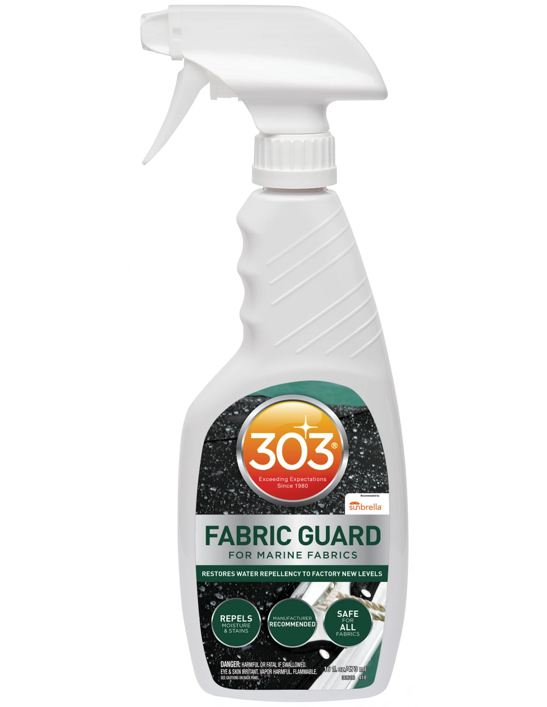 303 Marine Fabric Guard Marine Fabric Guard tworzy silną tarczę, która zwiększa właściwości hydrofobowe i chroni przed plamami z oleju i wody. Do użytku na materiałowe pokrowce na łodzie, markizy, żagle dakronowe. Po zastosowaniu na czyste i suche tkaniny, przywraca utraconą hydrofobowość i odporność na plamy. Z Marine Fabric Guard utrzymaj swoje ulubione tkaniny czyste i lśniące przez wiele lat. Bezpieczny dla włókien syntetycznych i naturalnych w środowisku morskim Chroni zarówno przed plamami na bazie wody, jak i oleju Nie zmienia koloru tkaniny, jej właściwości, palności ani oddychalności Zalecany przez Sunbrella, wiodącego producenta tkanin zewnętrznych Dodatkowe informacje: Produkt w płynie i sprayu jest łatwopalny, trzymaj produkt i impregnowany artykuł (do wyschnięcia) z dala od ciepła, iskier lub otwartego ognia. Nie palić tytoniu podczas stosowania 303® Fabric Guard. Rozpylać aż do równomiernego zwilżenia, nakładając na siebie spryskane obszary. UWAGA: Zmniejszone pokrycie, gdy stosowane z wałkiem malarskim lub pędzlem. Stosuj na tkaniny w temperaturze powyżej 70°F/21°C. (Dla szybszego schnięcia/utwardzania i najlepszych rezultatów, stosować w pełnym słońcu). Chronić przed deszczem/rosą, aż do całkowitego utwardzenia. Utwardzanie: 12-24 godzin w zależności od temperatury. Jeżeli te czynności zostały wykonane prawidłowo, materiał będzie w tym momencie hydrofobowy. 303 Fabric Guard będzie wymagał ponownego nałożenia w zależności od ekspozycji materiału na światło słoneczne i warunki pogodowe; polej materiał wodą, aby określić potrzebę ponownego nałożenia produktu. Pojemność: 473ml