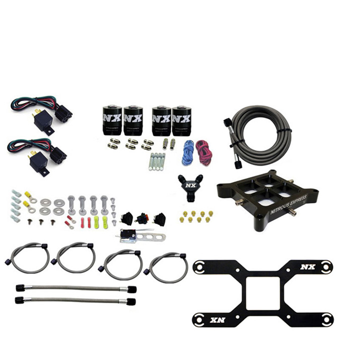 This crossbar nitrous system includes more than the standard crossbar nitrous kit. It includes a custom solenoid bracket, billet aluminum y fittings, braided stainless solenoid to plate lines, nickel plated fittings, wide open throttle switch, master arming switch, 40 Amp relay and relay harness.