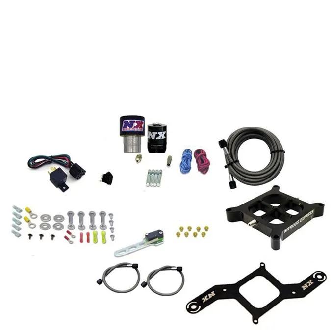 NX Single Entry Billet Crossbar nitrous plate systems provide the crossbar spray pattern that everyone loves in a package that is legal for racing classes that allow only one nitrous and one fuel jet. With no spray bars to sag, rotate or disrupt airflow, this is truly the Next Generation in cross bar nitrous plate technology.This system includes a 10lb nitrous bottle with the billet aluminum Lightning 500 bottle valve. This valve not only looks great; It is packed with features including two integrated gauge ports, 5/8 siphon tube, a large .500 orifice and an improved flow path with only one 45 degree turn. The Lightning bottle valve looks great, flows great and weighs nearly one full pound less than our old style brass valve. This system is designed for 4150 flange manifolds and includes: This system is designed for 4150 flange manifolds and includes: 15178 (.178") Nitrous and 15301L Fuel Lightning Solenoids Custom solenoid bracket High flow braided stainless solenoid to plate lines nickel plated fittings wide open throttle switch 6AN Feedline Master arming switch Amp relay and relay harness Jetting for 250-650HP If you have an aftermarket engine management system that is capable of adding nitrous enrichment fuel and want this system DRY (no fuel components), please contact us. Instructions PDF