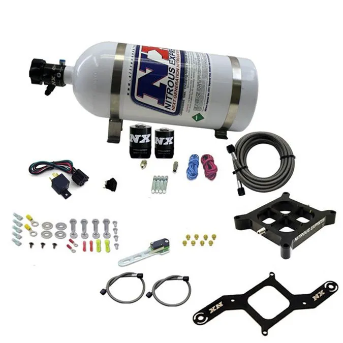 NX Single Entry Billet Crossbar nitrous plate systems provide the crossbar spray pattern that everyone loves in a package that is legal for racing classes that allow only one nitrous and one fuel jet. With no spray bars to sag, rotate or disrupt airflow, this is truly the Next Generation in cross bar nitrous plate technology. This system includes a 10lb nitrous bottle with the billet aluminum Lightning 500 bottle valve. This valve not only looks great; It is packed with features including two integrated gauge ports, 5/8 siphon tube, a large .500 orifice and an improved flow path with only one 45 degree turn. The Lightning bottle valve looks great, flows great and weighs nearly one full pound less than our old style brass valve. This crossbar nitrous system includes more than the standard crossbar nitrous kit. It includes a custom solenoid bracket, High flow braided stainless solenoid to plate lines, nickel plated fittings, wide open throttle switch, master arming switch, 40 Amp relay and relay harness. This system is designed for 4150 flange manifolds and includes jetting for 250-750HP If you have an aftermarket engine management system that is capable of adding nitrous enrichment fuel and want this system DRY (no fuel components), please contact us. THE NITRO BOTTLE IS EMPTY! Instructions PDF