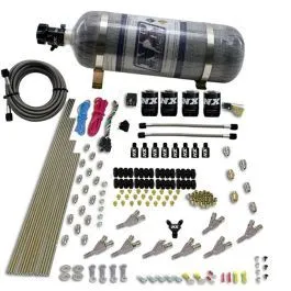 8 Cylinder S.T.D Annular Nozzle Direct Port 4 Solenoids Carburted Applications This system includes 8 of the NX Straight Through Design (STD) Nozzles, 2 NX Lightning series nitrous solenoids, 2 NX Lightning series fuel solenoids, anodized aluminum distribution blocks, 3/16 stainless hard lines, nickel plated fittings, Jetting for 200-500HP, 6AN nitrous feed lines, a high flow 6AN Y-fitting, a wide open throttle switch, 40 Amp relays and relay harnesses, master arming switch, stainless bottle brackets and a 10lb nitrous bottle with the NX Lightning bottle valve. This system includes the latest technology and the best components available. For you tech hungry junkies we will provide some details explaining what makes this nitrous system so great. The key to maximizing nitrous horsepower is to keep the nitrous in a dense liquid form until it is injected into the engine. Sharp bends in the nitrous flow path cause the nitrous flow to become turbulent which causes gaseous bubbles to form in the flowing nitrous. Dense liquid nitrous makes more power than gaseous nitrous Period! This NX nitrous system contains the key components that ensure you are getting maximum power per pound of nitrous used. Read on and we will explain. NX Lightning solenoids feature an improved flow path that allows nitrous / fuel to enter above the seat and exit out the bottom for flow unmatched by any other solenoid on the market. Lightning nitrous solenoids feature an integrated purge port which allows you to connect a purge valve directly to the body of the nitrous solenoid. Purging through the body of the solenoid eliminates the air pocket between the purge valve and the solenoid orifice. Lightning fuel solenoids feature a fuel bypass port which allows you to connect a small return line to the tank. This eliminates trapped air between the fuel pressure regulator and the fuel solenoid which eliminates the lean spike associated with other solenoids. Lightning Series solenoids feature CNC aluminum bodies topped with Carbon Fiber cans for the ultimate in weight savings. Nitrous Express only uses the highest quality, made in the USA components in its solenoids. Do not be fooled by low price come-ons, the solenoids are the most important component of a nitrous system. THE NITRO BOTTLE IS EMPTY! Instructions PDF