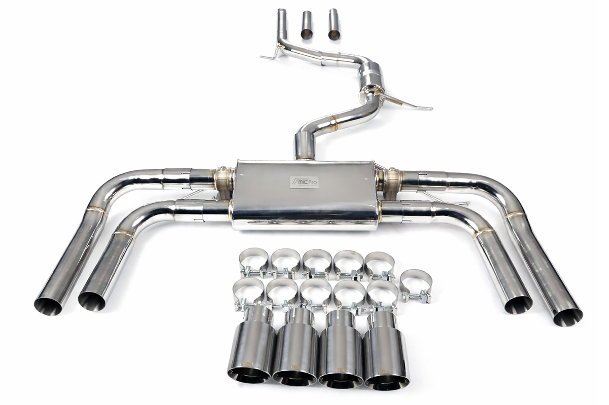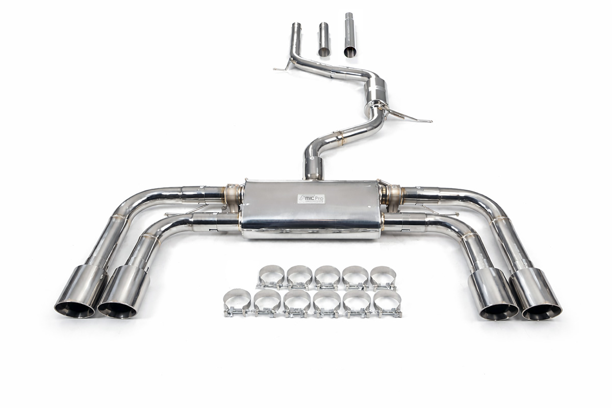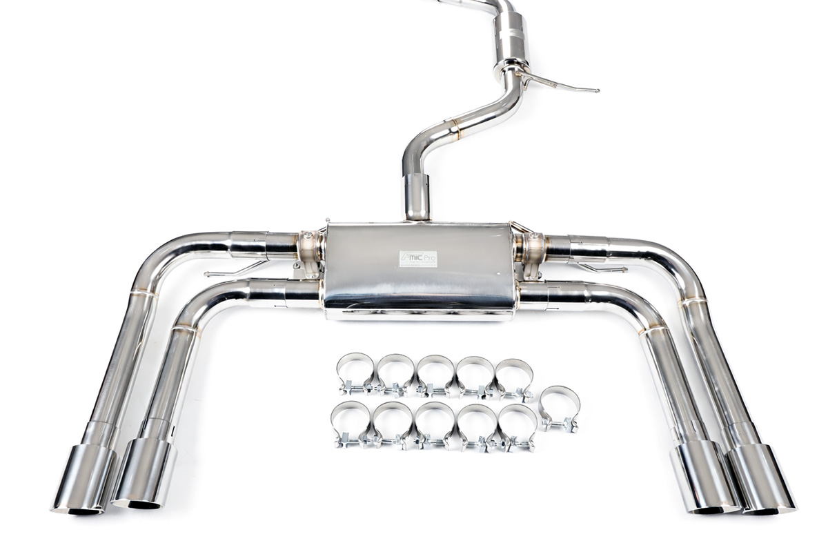 Aktywny układ wydechowy z klapami Cat-Back FMIC.Pro Audi A3 8V 2.0 TSI 2012-2020Dedykowany układ wydechowy FMIC.Pro typu cat-back został zaprojektowany w celu poprawy przepływu spalin oraz uzyskania wyraźnie bardziej sportowej charakterystyki dźwiękowej. Zastosowana średnica orurowania 63mm / 2.5” oraz konfiguracja tłumików zapewniają głębszy, bardziej nasycony dźwięk pod obciążeniem, przy zachowaniu komfortu podczas spokojnej jazdy -szczególnie w trybie zamkniętych klap. Układ wykonano w całości ze stali nierdzewnej SS304, odpornej na korozję i pracę w warunkach wysokiej temperatury. Orurowanie gięte na obrabiarkach CNC zapewnia powtarzalną geometrię oraz precyzyjne dopasowanie do seryjnych mocowań. Dzięki temu montaż jest prosty i odbywa na zasadzie plug & play. Połączenia spawane wykonywane są metodą TIG w osłonie argonu, dzięki czemu spoiny są czyste, estetyczne i w pełni szczelne - kluczowe dla niezawodności układu wydechowego. W miejscach połączeń kołnierzowych zastosowano flansze obrabiane w technologii CNC o grubości 10 mm. Zapewniają one wysoką sztywność połączenia, ograniczają ryzyko odkształceń wynikających z cykli termicznych i umożliwiają równomierny docisk uszczelnienia na całej powierzchni. Układ wyposażony jest w zintegrowane elektryczne klapy, umożliwiające zmianę drogi przepływu spalin w tylnej sekcji: Tryb zamknięty – spaliny przechodzą przez pełną sekcję tłumienia, co zapewnia bardziej stonowane brzmienie i wysoki komfort w codziennej eksploatacji. Tryb otwarty – spaliny omijają tłumik końcowy, co skutkuje głośniejszym, bardziej bezpośrednim i sportowym brzmieniem. Rozwiązanie to pozwala dopasować charakterystykę układu wydechowego do warunków oraz preferencji kierowcy. Sterowanie klapami odbywa się za pomocą dołączonego kontrolera oraz dwóch pilotów, umożliwiających szybkie przełączanie trybów pracy w dowolnym momencie. Dla uzyskania maksymalnego potencjału układu wydechowego FMIC.Pro zalecane jest połączenie układu cat-back z downpipe’em o zwiększonej przepustowości (szczególnie w jednostkach turbodoładowanych).Liczba końcówek wydechowych: 4 okrągłe Średnica: 63mm / 2.5” Silnik: EA888 Gen 3 R4 2.0 Turbo Dedykowany do:-Audi A3 2.0 TFSI (8V) 2012-2020