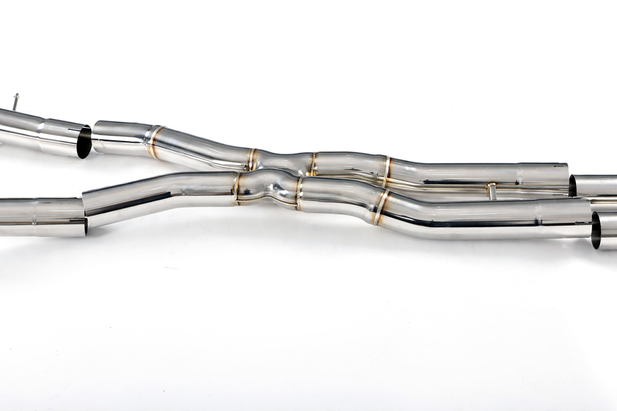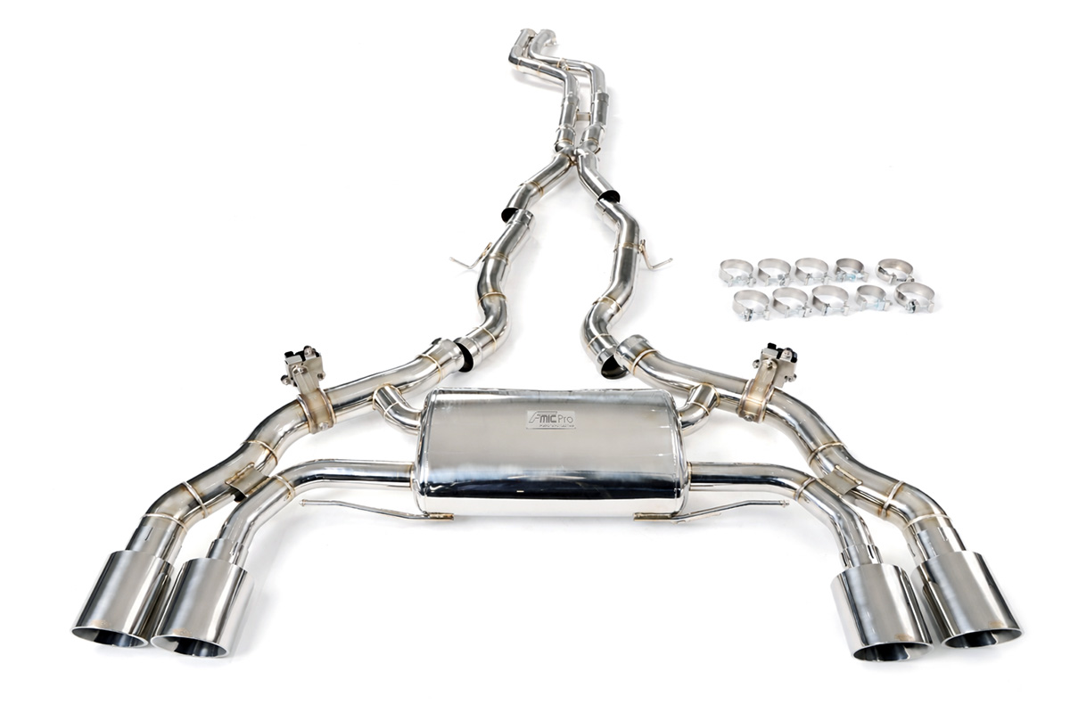 Aktywny układ wydechowy z klapami Cat-Back FMIC.Pro BMW X3M X4M F97 F98 3.0L S58 2019-2023 Dedykowany układ wydechowy FMIC.Pro typu cat-back został zaprojektowany w celu poprawy przepływu spalin oraz uzyskania wyraźnie bardziej sportowej charakterystyki dźwiękowej. Zastosowana średnica orurowania 70mm / 2.75” oraz konfiguracja tłumików zapewniają głębszy, bardziej nasycony dźwięk pod obciążeniem, przy zachowaniu komfortu podczas spokojnej jazdy -szczególnie w trybie zamkniętych klap. Układ wykonano w całości ze stali nierdzewnej SS304, odpornej na korozję i pracę w warunkach wysokiej temperatury. Orurowanie gięte na obrabiarkach CNC zapewnia powtarzalną geometrię oraz precyzyjne dopasowanie do seryjnych mocowań. Dzięki temu montaż jest prosty i odbywa na zasadzie plug & play. Połączenia spawane wykonywane są metodą TIG w osłonie argonu, dzięki czemu spoiny są czyste, estetyczne i w pełni szczelne - kluczowe dla niezawodności układu wydechowego. W miejscach połączeń kołnierzowych zastosowano flansze obrabiane w technologii CNC o grubości 10 mm. Zapewniają one wysoką sztywność połączenia, ograniczają ryzyko odkształceń wynikających z cykli termicznych i umożliwiają równomierny docisk uszczelnienia na całej powierzchni. Układ wyposażony jest w zintegrowane elektryczne klapy, umożliwiające zmianę drogi przepływu spalin w tylnej sekcji: Tryb zamknięty – spaliny przechodzą przez pełną sekcję tłumienia, co zapewnia bardziej stonowane brzmienie i wysoki komfort w codziennej eksploatacji. Tryb otwarty – spaliny omijają tłumik końcowy, co skutkuje głośniejszym, bardziej bezpośrednim i sportowym brzmieniem. Rozwiązanie to pozwala dopasować charakterystykę układu wydechowego do warunków oraz preferencji kierowcy. Sterowanie klapami odbywa się za pomocą dołączonego kontrolera oraz dwóch pilotów, umożliwiających szybkie przełączanie trybów pracy w dowolnym momencie. Dla uzyskania maksymalnego potencjału układu wydechowego FMIC.Pro zalecane jest połączenie układu cat-back z downpipe’em o zwiększonej przepustowości (szczególnie w jednostkach turbodoładowanych).Liczba końcówek wydechowych: 4 okrągłe Średnica: 70mm / 2.75” Silnik: 3.0 Twin-Turbo R6 (S58B30T0) Dedykowany do:-BMW X3M (F97) 3.0T S58 480 KM 600 Nm 2019-2023 -BMW X4M (F98) 3.0T S58 480 KM 600 Nm 2019-2023