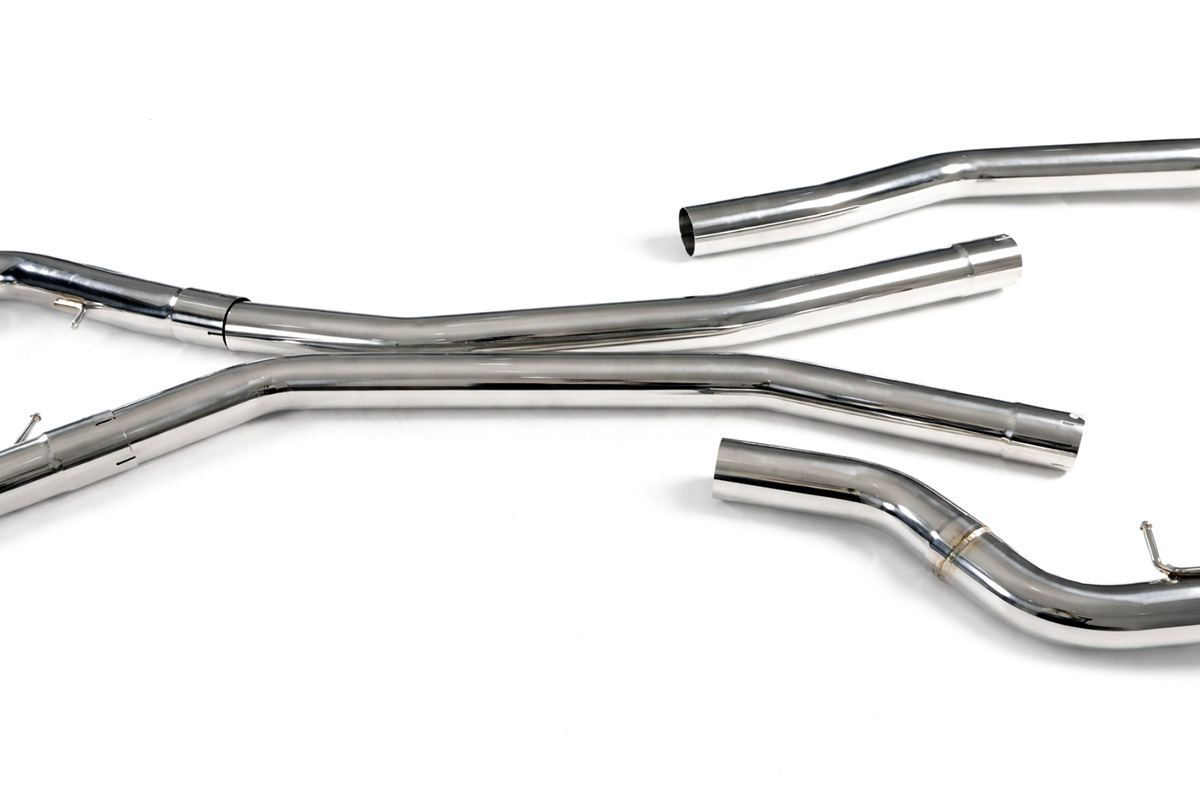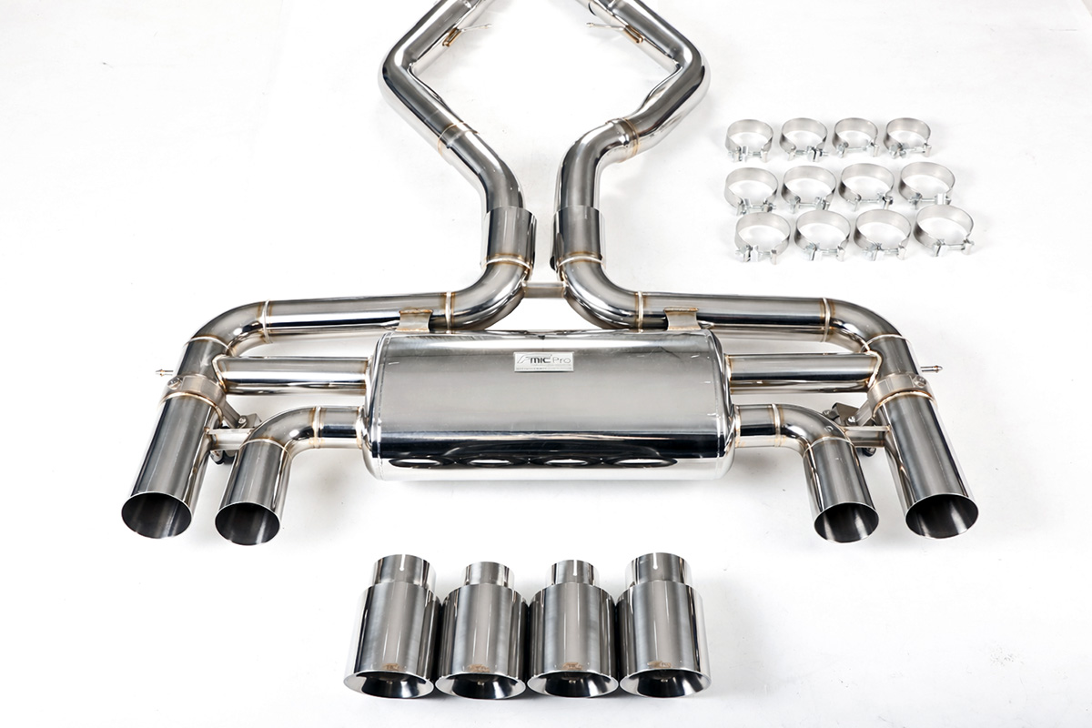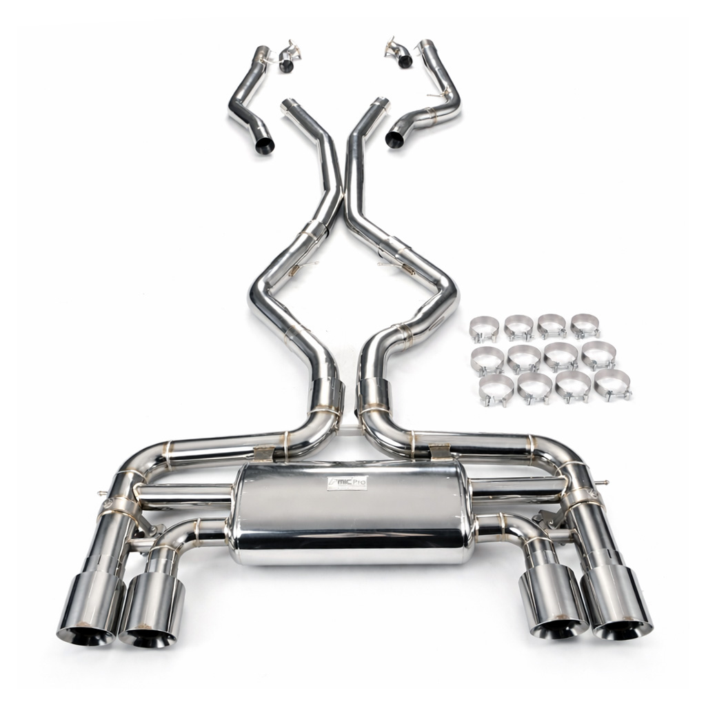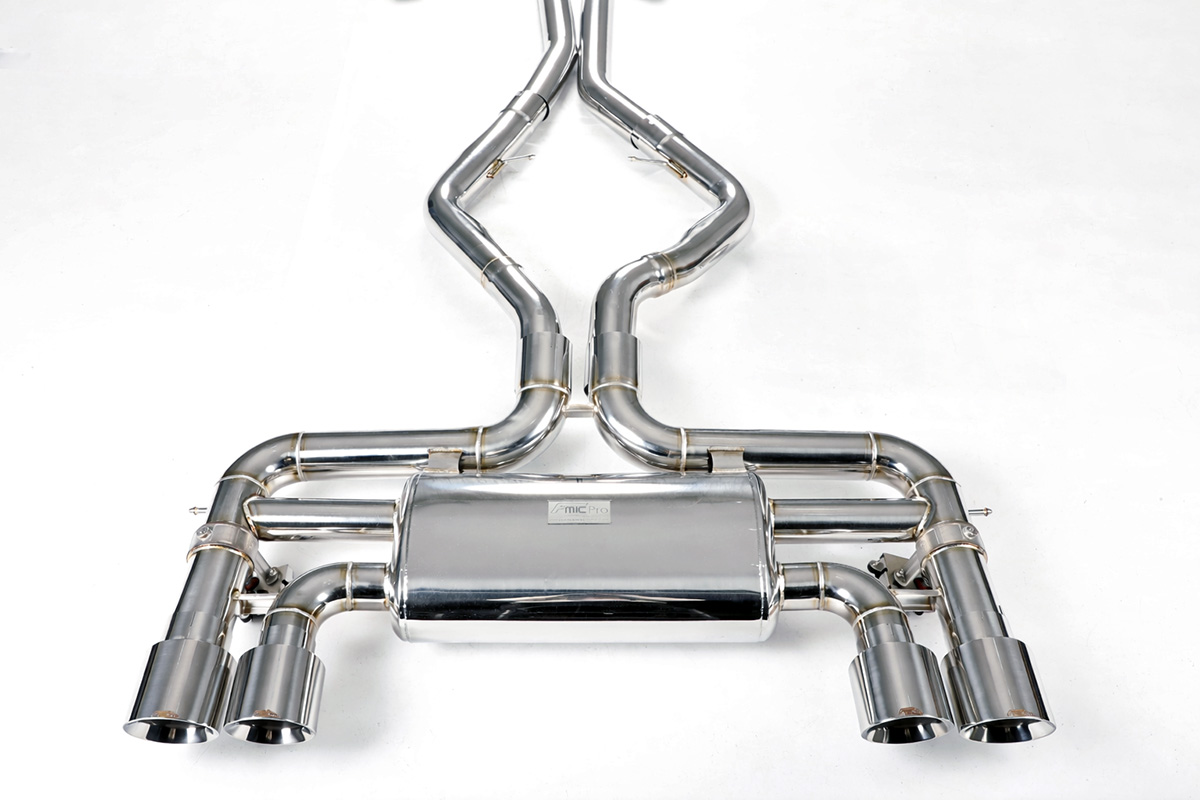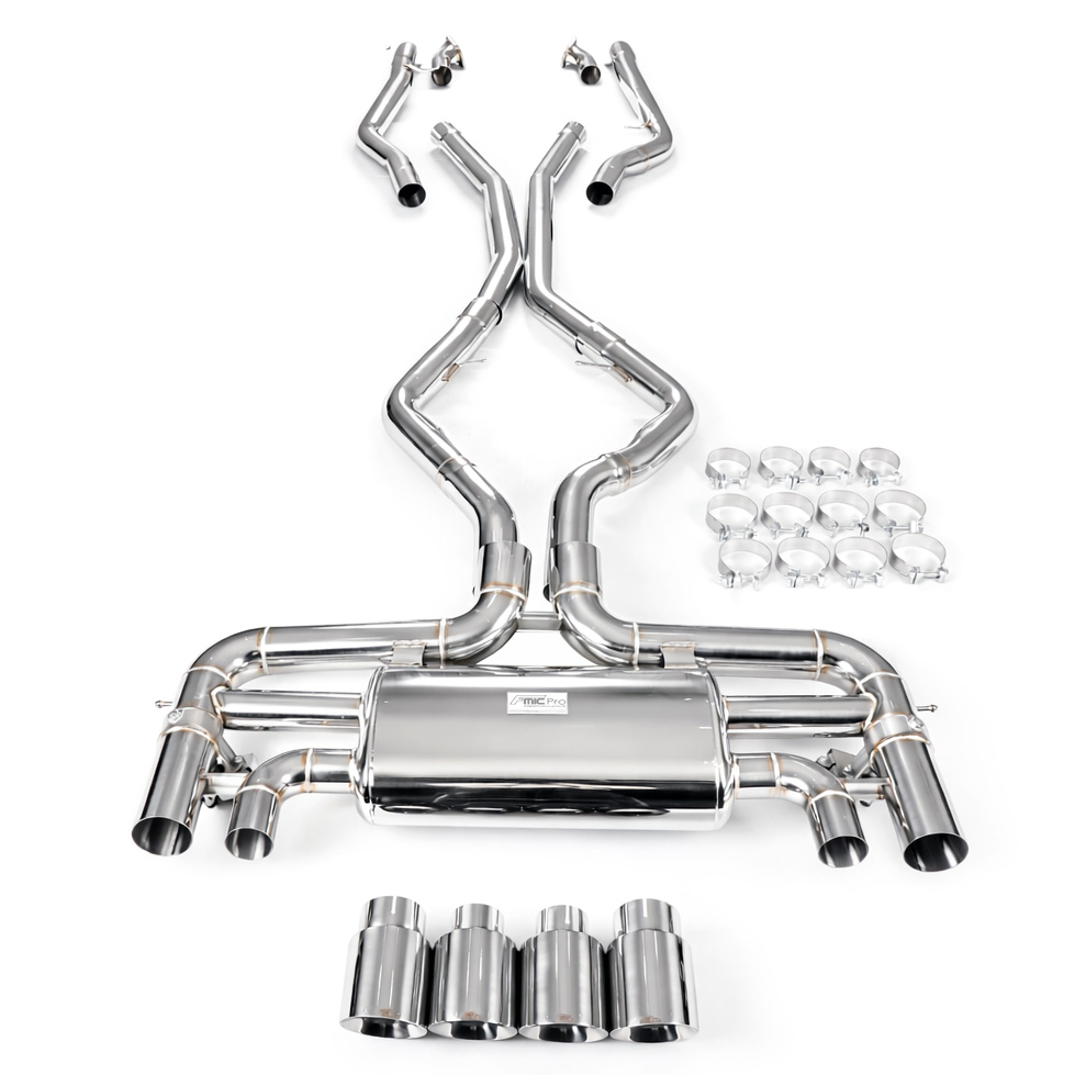 Aktywny układ wydechowy z klapami Cat-Back FMIC.Pro BMW X5M X6M F85 F86 4.4T S63 2015-2019 Dedykowany układ wydechowy FMIC.Pro typu cat-back został zaprojektowany w celu poprawy przepływu spalin oraz uzyskania wyraźnie bardziej sportowej charakterystyki dźwiękowej. Zastosowana średnica orurowania 76mm / 3.0” oraz konfiguracja tłumików zapewniają głębszy, bardziej nasycony dźwięk pod obciążeniem, przy zachowaniu komfortu podczas spokojnej jazdy -szczególnie w trybie zamkniętych klap. Układ wykonano w całości ze stali nierdzewnej SS304, odpornej na korozję i pracę w warunkach wysokiej temperatury. Orurowanie gięte na obrabiarkach CNC zapewnia powtarzalną geometrię oraz precyzyjne dopasowanie do seryjnych mocowań. Dzięki temu montaż jest prosty i odbywa na zasadzie plug & play. Połączenia spawane wykonywane są metodą TIG w osłonie argonu, dzięki czemu spoiny są czyste, estetyczne i w pełni szczelne - kluczowe dla niezawodności układu wydechowego. W miejscach połączeń kołnierzowych zastosowano flansze obrabiane w technologii CNC o grubości 10 mm. Zapewniają one wysoką sztywność połączenia, ograniczają ryzyko odkształceń wynikających z cykli termicznych i umożliwiają równomierny docisk uszczelnienia na całej powierzchni. Układ wyposażony jest w zintegrowane elektryczne klapy, umożliwiające zmianę drogi przepływu spalin w tylnej sekcji: Tryb zamknięty – spaliny przechodzą przez pełną sekcję tłumienia, co zapewnia bardziej stonowane brzmienie i wysoki komfort w codziennej eksploatacji. Tryb otwarty – spaliny omijają tłumik końcowy, co skutkuje głośniejszym, bardziej bezpośrednim i sportowym brzmieniem. Rozwiązanie to pozwala dopasować charakterystykę układu wydechowego do warunków oraz preferencji kierowcy. Sterowanie klapami odbywa się za pomocą dołączonego kontrolera oraz dwóch pilotów, umożliwiających szybkie przełączanie trybów pracy w dowolnym momencie. Dla uzyskania maksymalnego potencjału układu wydechowego FMIC.Pro zalecane jest połączenie układu cat-back z downpipe’em o zwiększonej przepustowości (szczególnie w jednostkach turbodoładowanych).Liczba końcówek wydechowych: 4 okrągłe Średnica: 76mm / 3.0” Silnik: 4.4 Twin-Turbo V8 (S63B44T2) Dedykowany do:-BMW X5M (F85) 4.4T V8 S63 2015-2019 -BMW X6M (F86) 4.4T V8 S63 2015-2019