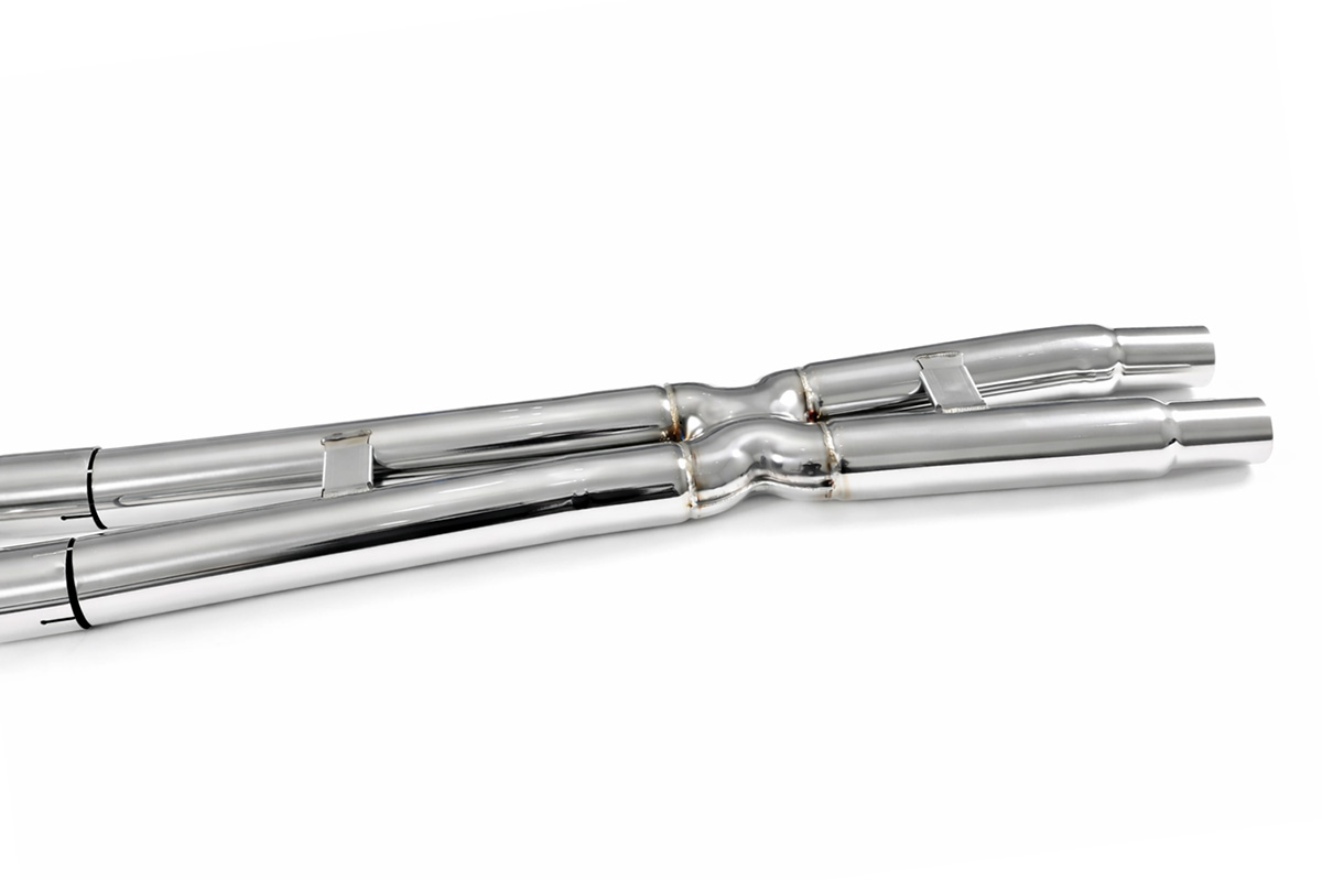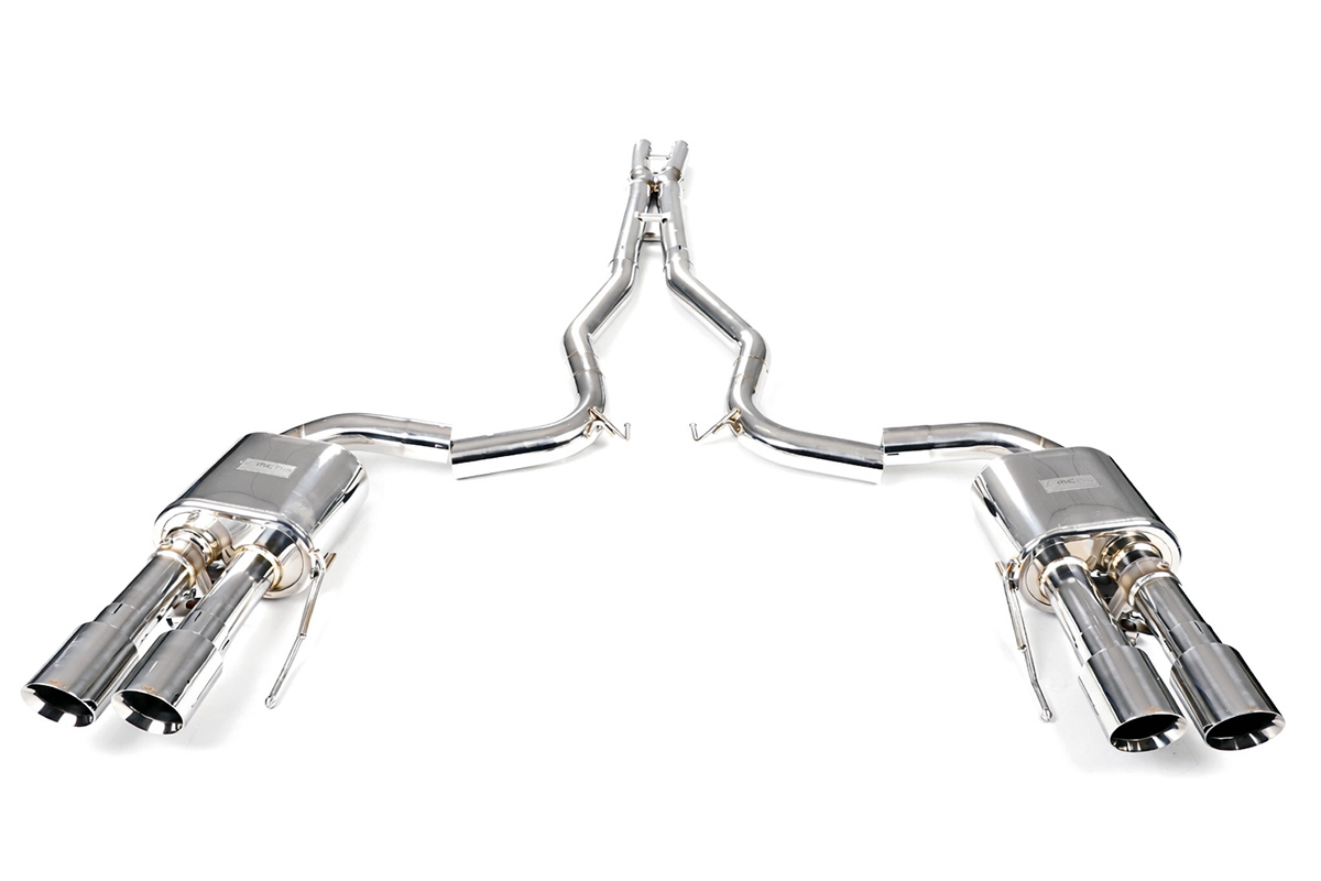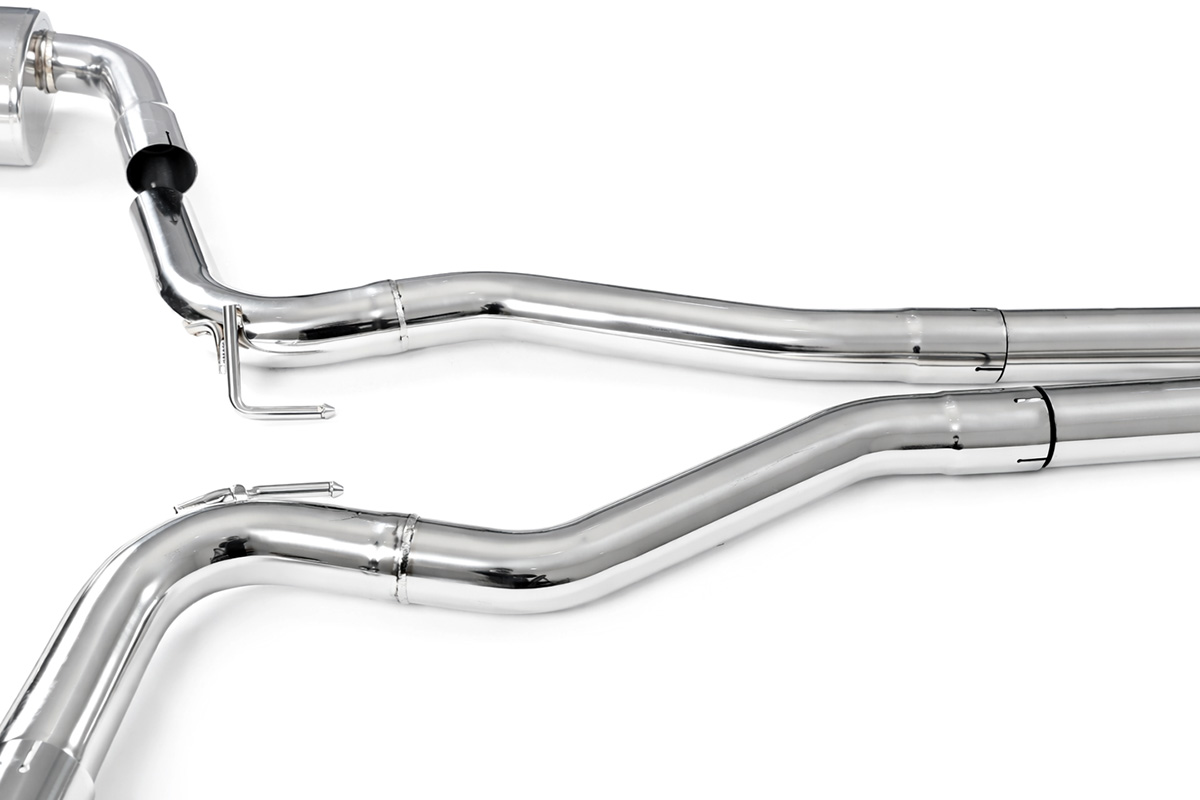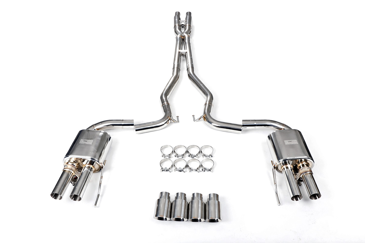 Aktywny układ wydechowy z klapami Cat-Back FMIC.Pro Ford Mustang GT 5.0 V8 S550 2018-2023 Dedykowany układ wydechowy FMIC.Pro typu cat-back został zaprojektowany w celu poprawy przepływu spalin oraz uzyskania wyraźnie bardziej sportowej charakterystyki dźwiękowej. Zastosowana średnica orurowania 70mm / 2.75” oraz konfiguracja tłumików zapewniają głębszy, bardziej nasycony dźwięk pod obciążeniem, przy zachowaniu komfortu podczas spokojnej jazdy -szczególnie w trybie zamkniętych klap. Układ wykonano w całości ze stali nierdzewnej SS304, odpornej na korozję i pracę w warunkach wysokiej temperatury. Orurowanie gięte na obrabiarkach CNC zapewnia powtarzalną geometrię oraz precyzyjne dopasowanie do seryjnych mocowań. Dzięki temu montaż jest prosty i odbywa na zasadzie plug & play. Połączenia spawane wykonywane są metodą TIG w osłonie argonu, dzięki czemu spoiny są czyste, estetyczne i w pełni szczelne - kluczowe dla niezawodności układu wydechowego. W miejscach połączeń kołnierzowych zastosowano flansze obrabiane w technologii CNC o grubości 10 mm. Zapewniają one wysoką sztywność połączenia, ograniczają ryzyko odkształceń wynikających z cykli termicznych i umożliwiają równomierny docisk uszczelnienia na całej powierzchni. Układ wyposażony jest w zintegrowane elektryczne klapy, umożliwiające zmianę drogi przepływu spalin w tylnej sekcji: Tryb zamknięty – spaliny przechodzą przez pełną sekcję tłumienia, co zapewnia bardziej stonowane brzmienie i wysoki komfort w codziennej eksploatacji. Tryb otwarty – spaliny omijają tłumik końcowy, co skutkuje głośniejszym, bardziej bezpośrednim i sportowym brzmieniem. Rozwiązanie to pozwala dopasować charakterystykę układu wydechowego do warunków oraz preferencji kierowcy. Sterowanie klapami odbywa się za pomocą dołączonego kontrolera oraz dwóch pilotów, umożliwiających szybkie przełączanie trybów pracy w dowolnym momencie. Dla uzyskania maksymalnego potencjału układu wydechowego FMIC.Pro zalecane jest połączenie układu cat-back z downpipe’em o zwiększonej przepustowości (szczególnie w jednostkach turbodoładowanych).Liczba końcówek wydechowych: 4 okrągłe Średnica: 70mm / 2.75” Silnik: 5.0 V8 Ti-VCT Coyote Dedykowany do:- Ford Mustang GT Coupe (S550 Facelift) 2018-2023 - Ford Mustang GT Convertible (S550 Facelift) 2018-2023