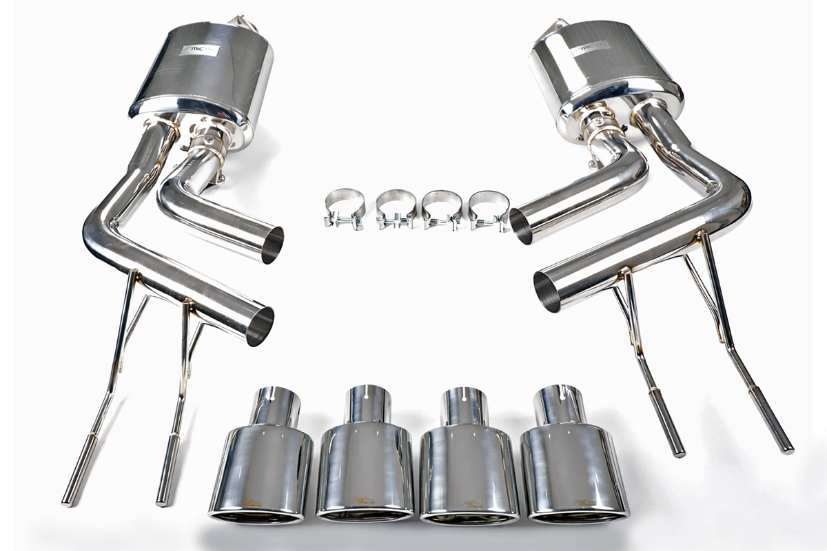 Aktywny układ wydechowy z klapami Cat-Back FMIC.Pro Mercedes Benz G Class G500 G550 G63 W463 2012-2018 Dedykowany układ wydechowy FMIC.Pro typu cat-back został zaprojektowany w celu poprawy przepływu spalin oraz uzyskania wyraźnie bardziej sportowej charakterystyki dźwiękowej. Zastosowana średnica orurowania 63mm / 2,5” oraz konfiguracja tłumików zapewniają głębszy, bardziej nasycony dźwięk pod obciążeniem, przy zachowaniu komfortu podczas spokojnej jazdy -szczególnie w trybie zamkniętych klap. Układ wykonano w całości ze stali nierdzewnej SS304, odpornej na korozję i pracę w warunkach wysokiej temperatury. Orurowanie gięte na obrabiarkach CNC zapewnia powtarzalną geometrię oraz precyzyjne dopasowanie do seryjnych mocowań. Dzięki temu montaż jest prosty i odbywa na zasadzie plug & play. Połączenia spawane wykonywane są metodą TIG w osłonie argonu, dzięki czemu spoiny są czyste, estetyczne i w pełni szczelne - kluczowe dla niezawodności układu wydechowego. W miejscach połączeń kołnierzowych zastosowano flansze obrabiane w technologii CNC o grubości 10 mm. Zapewniają one wysoką sztywność połączenia, ograniczają ryzyko odkształceń wynikających z cykli termicznych i umożliwiają równomierny docisk uszczelnienia na całej powierzchni. Układ wyposażony jest w zintegrowane elektryczne klapy, umożliwiające zmianę drogi przepływu spalin w tylnej sekcji: Tryb zamknięty – spaliny przechodzą przez pełną sekcję tłumienia, co zapewnia bardziej stonowane brzmienie i wysoki komfort w codziennej eksploatacji. Tryb otwarty – spaliny omijają tłumik końcowy, co skutkuje głośniejszym, bardziej bezpośrednim i sportowym brzmieniem. Rozwiązanie to pozwala dopasować charakterystykę układu wydechowego do warunków oraz preferencji kierowcy. Sterowanie klapami odbywa się za pomocą dołączonego kontrolera oraz dwóch pilotów, umożliwiających szybkie przełączanie trybów pracy w dowolnym momencie. Dla uzyskania maksymalnego potencjału układu wydechowego FMIC.Pro zalecane jest połączenie układu cat-back z downpipe’em o zwiększonej przepustowości (szczególnie w jednostkach turbodoładowanych).Liczba końcówek wydechowych: 4 okrągłe Średnica: 63mm / 2,5” Silniki: 5.5 V8 (M273), 4.0 V8 Biturbo (M176), 5.5 V8 Bi-Turbo (M157) Dedykowany do: -Mercedes G500/550 (W463) 5.5 V8 (M273) 2012-2015 -Mercedes G500/550 (W463) 4.0 V8 Biturbo (M176) 2015-2018 -Mercedes-AMG G63 (W463) 5.5 V8 Biturbo (M157) 2012-2018