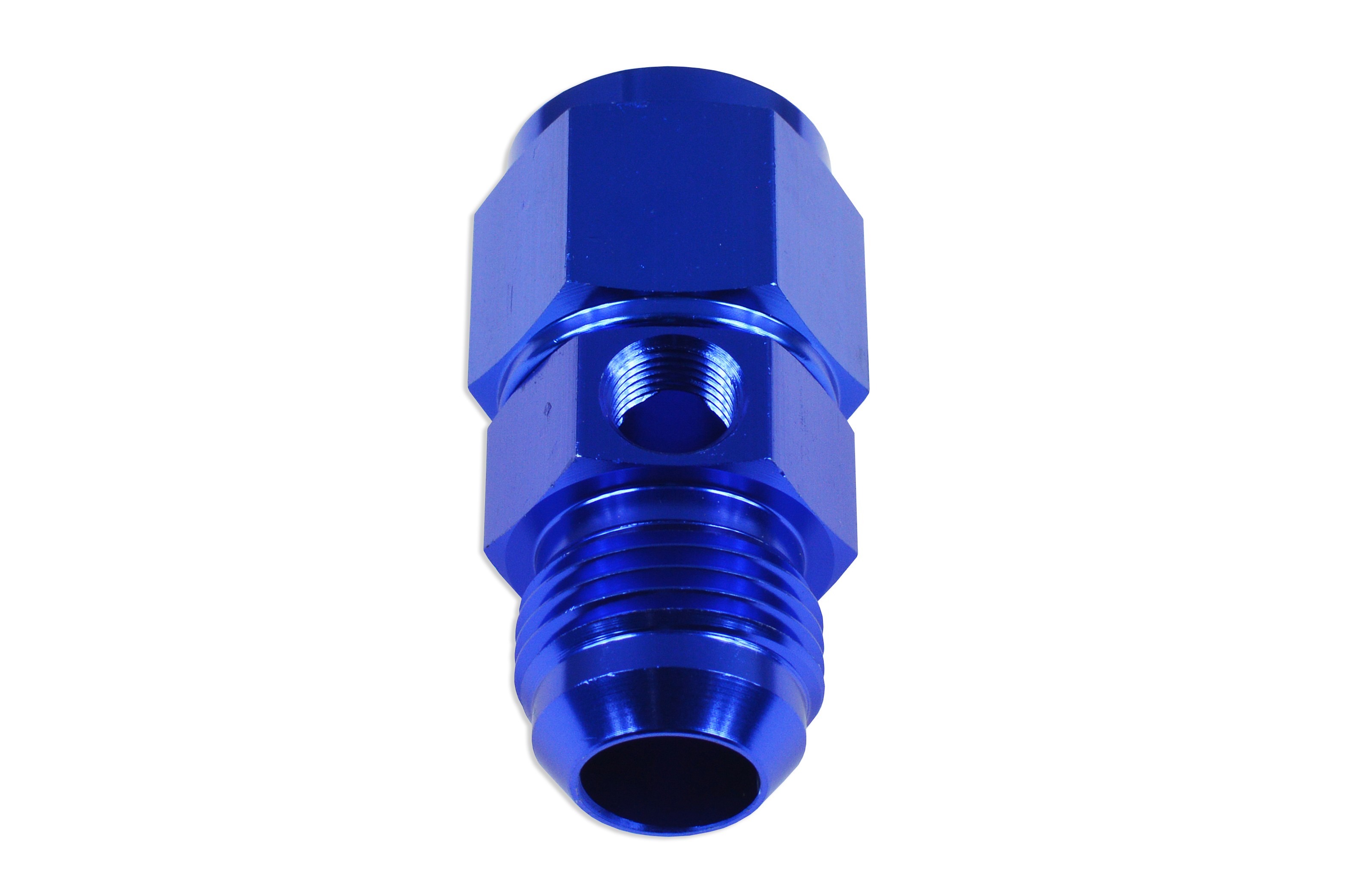 Nypel żeńsko-męski z gwintem AN4 z dodatkowym wyjściem na czujnik z gwintem żeńskim 1/8 NPT. Nyple są wielokrotnego użytku.
