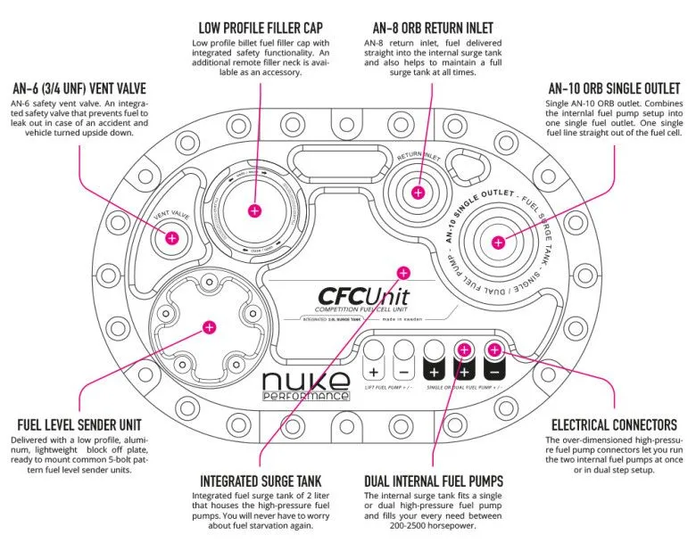 ATL Saver Cells is lightweight FIA FT3 -1999 approved fuel cells for all major racing and motorsports associations. The well-known Saver Cells, constructed from a unique, tough plastic alloy, in combination with the Nuke Performance CFC Unit - drop-in fuel pump hanger with integrated surge tank functionality. Safe and easy, this is the optimal "all in one" solution for all motorsports applications.  FIA FT3-1999 approved fuel cell  Available in several sizes, for all needs  Integrated 2 liter Fuel Surge Tank function  Full foam baffling for petrol and E85  Fits single or dual high-pressure fuel pumps  New high-profile CFC Unit that fits all ATL fuel cells  Low profile fuel filler cap with integrated roll-over valve  AN-10 ORB outlet / AN-8 ORB return The ATL Saver Cells are suitable for use with carburetor based fuel systems and with the integrated high-profile CFC Unit from Nuke Performance, which eliminates the need for an external surge tank which is other needed when running a fuel cell, it is a perfect use for fuel injected systems. Our selection of saver cells come with yellow foam for petrol and E85. Integrated 2 liter surge tank, billet fuel pump hanger for 1-2 fuel pumps The cells come delivered with the new Nuke Performance high profile CFC Unit as fill plate replacement. The new high-profile CFC Unit is the perfect solution for a simplified high-performing fuel system where safety is of uttermost importance. This setup eliminates the need for a space-consuming external surge tank. With all the needed fuel pumps mounted within the fuel cell itself, this is the only thing you need. This frees up space and weight and increases safety as fewer fuel line fittings are necessary and no external fuel pumps are used. Internal high-pressure fuel pumps, for any need between 200 - 2000hp The ATL fuel cells are delivered with the unique Nuke Performance CFC Unit with an integrated Fuel Surge Tank function and fit a single or dual high-pressure fuel pump from Deatschwerks, AEM, Ti Automotive, Walbro, Bosch, Fuelab, Aeromotive, and many more. It fits all common 39mm fuel pumps as well as the larger Deatschwerks DW400, Walbro GST450/520, Bosch BR540, and Aeromotive Stealth 450. This solution is ready to deliver steady fuel flow for demands anywhere between 200-2000 horsepower without fuel starvation, even during demanding driving conditions, thanks to the internal surge tank and the in-tank foam baffling. The Nuke Performance high-profile Competition Fuel Cell Unit fits most common fuel pumps. Together with the Nuke Performance fuel pump mounting kits, it has never been this easy to set up a high-performance fuel system. How to mount fuel pumps within the ATL Saver cell and surge tank? The single fuel pump mounted in the fuel cell functions as a pickup fuel pump that ensures that the high-pressure fuel pumps within the oversized 2 liter (0.53 gallons) surge tank always have enough fuel to maximize fuel flow and minimize the risk of starvation that can seriously harm your engine. For more information, view the product manual. The high-profile edition CFC Unit is delivered with everything you need to install the fuel pumps of your selection, but we recommend adding one of our fuel pump mounting kits for optimal functionality. All fuel pumps are securely mounted in all conditions thanks to the billet fuel pump brackets. Made for all type of motorsports use and in a wide variation The new high-profile edition of the Nuke Performance Competition Fuel Cell Unit comes ready for AN-10 ORB outlet and AN-8 ORB return inlet and with a wide variety of sizes available to choose from. The use of the oversized, high flow AN-10 ORB outlet combines the internal fuel pumps into one single fuel line and minimizes the need for external equipment, hoses, and fittings. The included rollover protected vent fitting is of AN-6 (3/4 UNF) and can be swapped for AN-6 to AN-10 when needed. Outlet and return AN-6, AN-8, AN-10, and AN-12 fittings are sold separately as accessories. Outlet fittings : AN-10 ORB to AN-6 Male Part # : 700-04-108 AN-10 ORB to AN-8 Male Part # : 700-04-109 AN-10 ORB to AN-10 Male Part # : 700-04-110 AN-10 ORB to AN-12 Male Part # : 700-04-111 Return fittings : AN-8 ORB to AN-6 Male Part # : 700-04-104 AN-8 ORB to AN-8 Male Part # : 700-04-105 AN-8 ORB to AN-10 Male Part # : 700-04-106 AN-8 ORB to AN-12 Male Part # : 700-04-107 Full foam baffling in affordable FIA approved fuel cell The ATL saver cells is FIA FT3-1999 approved for all major motorsports worldwide, but if used within FIA or FT3 motorsports it must be cased in the aluminum container. When placing an order, select if you want to add the container to your order. Not recommended to build your own container without consulting ATL as any sizing issues may invalidate the warranty. ATL Container 30 liter Part #: 150-SA-AA-041 ATL Container 40 liter Part #: 150-SA-AA-051 ATL Container 45 liter Part #: 150-SA-AA-061 ATL Container 60 liter Part #: 150-SA-AA-071 ATL Container 80 liter Part #: 150-SA-AA-101 ATL Well Cell, the FIA approved fuel cell that fits straight into your spare tire compartment equipped with the CFC Unit Changing from a stock fuel tank to an aftermarket, FIA-approved fuel cell has never been this easy. The ATL "well cell" of 45liter fits straight into your spare tire compartment and houses the Nuke Performance CFC Unit. For this fuel cell, there is no aluminum container available, but when using the stock compartment you only need to add a lid of some kind, and you are set. How does the Nuke Performance Competition Fuel Cell Unit work? The CFC Unit works as a fuel pump hanger with an integrated surge tank for motorsports applications where safety and functionality are of uttermost importance. It is designed to mount directly to an aftermarket fuel cell with a standardized 24-bolt pattern. For more information about the functionality of the CFC Unit, view our Youtube video explaining its functions or visit our FAQ g