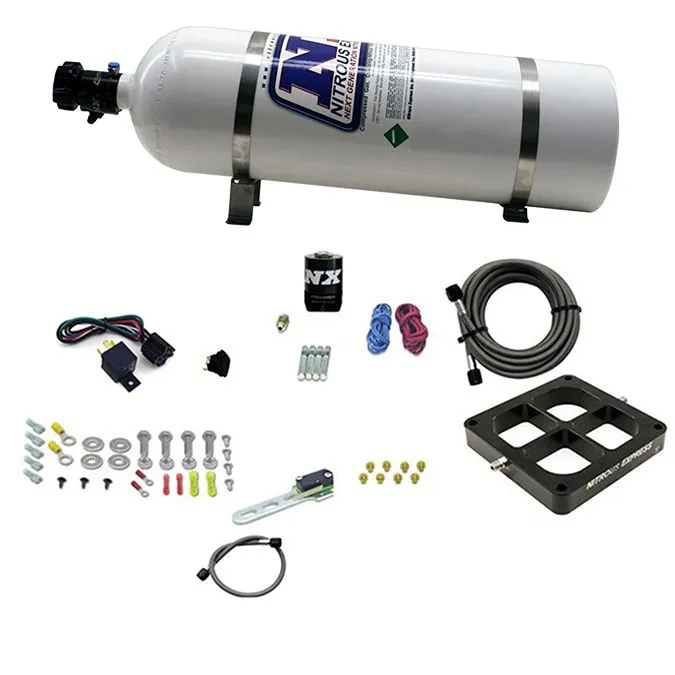 Billet Crossbar Plate System Dry Single Stage 100-500HP 4500 Flange 15LB Bottle The Nitrous Express Dry Billet Crossbar Plate System is set up for those running an aftermarket EFI system with capabilities of nitrous fuel enrichment. This system is the quickest and easiest way to add nitrous. Nitrous Express will provide the necessary PPH(Pounds Per Hour) flow data to easily tune your aftermarket EFI Systems fuel enrichment. This system is quick to install, simple to tune and capable of spraying the most horsepower of any nitrous plate on the market! This system comes complete with a Billet Crossbar nitrous plate, billet and carbon fiber Lightning series solenoids, solenoid bracket, billet y fittings and distribution blocks, stainless braided nitrous lines, wide open throttle switch, master arming switches, and all the necessary hardware and electrical to complete the system. This system is offered in 3 different setups for both 4150 and 4500 flange intakes. Single stage - This is a single dry stage of nitrous capable of spraying up to 500 horsepower. Dual Stage - This system is capable of dual-stage operation with the first spraying up to 500 horsepower and the second able to spray up to 400 horsepower for a combined potential of 900 rear-wheel horsepower! Quad Stage - This is the highest horsepower nitrous plate system on the market and capable of spraying 4 completely separate stages of nitrous. The first two stages can spray 500 horsepower each! The last two stages can spray 400 horsepower each for a combined 1,800 rear-wheel horsepower! THE NITRO BOTTLE IS EMPTY!