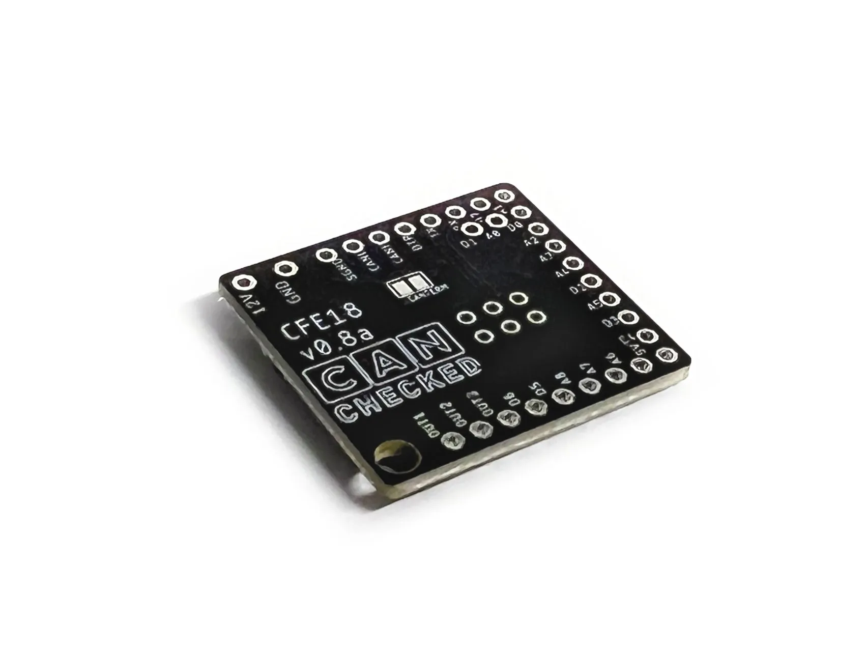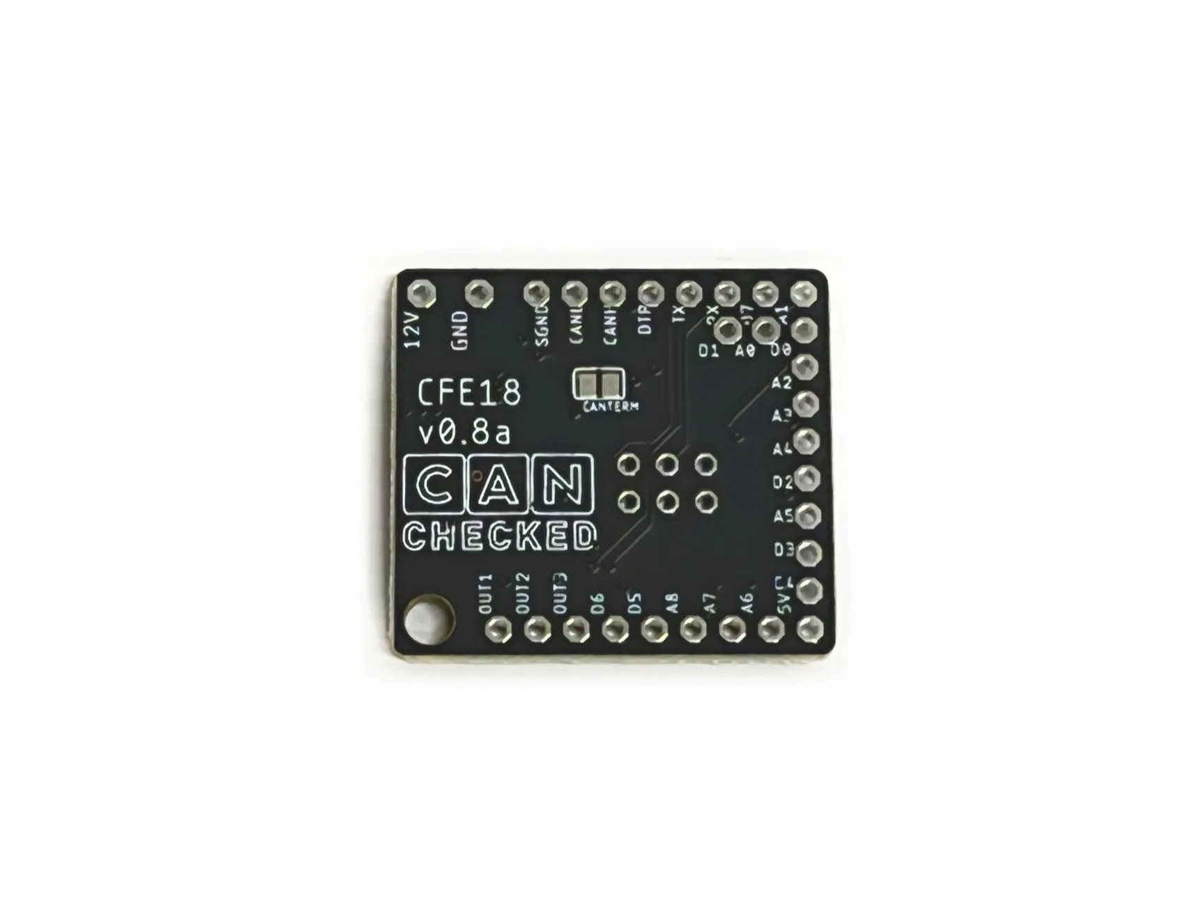 CFE18 – Moduł przełączników CAN Bus CFE18 to skrót od „Can Bus Function Extension”, często określany również jako „Can Switch Board”. Jakie korzyści przynosi to rozwiązanie? Podłączanie urządzeń do magistrali CAN w pojeździe może stanowić wyzwanie, szczególnie w zastosowaniach motorsportowych. W przypadku kierownic wyścigowych często konieczne jest umieszczenie elektroniki wewnątrz ich konstrukcji i przesyłanie sygnałów z przełączników lub potencjometrów (trimpotów) poprzez CAN Bus. Firma CANchecked oferuje niewielki moduł rozszerzający, wyposażony w 17 wejść: 8 wejść cyfrowych (low side) do obsługi przełączników, 9 wejść analogowych (0-5V) do podłączenia czujników lub potencjometrów. Dodatkowo moduł posiada zintegrowany przetwornik napięcia, umożliwiający podłączenie do instalacji 12V w pojeździe. Specyfikacja sprzętowa CFE18 Płytka o kompaktowych wymiarach 29 × 27 mm może być łatwo zamontowana nawet w ograniczonej przestrzeni. Rozstaw pinów wynosi 2,54 mm, a dla linii zasilania 3,81 mm, co zwiększa bezpieczeństwo połączeń. Dla ułatwienia montażu przewidziano otwór montażowy, umożliwiający przykręcenie modułu. Terminacja magistrali CAN Na płytce znajduje się zworka lutownicza, umożliwiająca terminację magistrali CAN. Po jej zamknięciu aktywowana zostaje rezystancja terminująca 120 Ω. W ustawieniu fabrycznym zworka pozostaje otwarta. Zastosowanie w motorsporcie Jednym z głównych zastosowań CFE18 jest integracja z kierownicami wyścigowymi. Dzięki czterem przewodom w spiralnym kablu można przesyłać wiele sygnałów wejściowych przez magistralę CAN, co znacznie upraszcza okablowanie i zwiększa niezawodność systemu. Opcje podłączenia Do modułu CFE18 można podłączyć: przełączniki (cyfrowe wejścia low side), potencjometry (trimpoty), czujniki – np. ciśnienia oleju, paliwa, doładowania czy przeciwciśnienia spalin. Dodatkowo moduł może zostać umieszczony w dedykowanej obudowie w zależności od specyficznych wymagań instalacji. Wyjścia cyfrowe Moduł CFE18 posiada trzy cyfrowe wyjścia (low side), które mogą obsługiwać obciążenie do 500 mA każde. Aby aktywować wyjście, należy wysyłać ramki CAN Bus co 100 ms. Można skonfigurować identyfikator CAN oraz czas wygaszenia wyjść (domyślnie po 500 ms braku sygnału następuje dezaktywacja). 0 = nieaktywne 1 = aktywne Filtracja sygnałów analogowych (AIN Smoothing) Jeśli sygnały analogowe wykazują zbyt duże wahania, można je programowo wygładzić. Funkcję tę można indywidualnie skonfigurować dla każdego wejścia. Sygnały są analizowane domyślnie 20 razy na sekundę (20 Hz). W przypadku ustawienia współczynnika wygładzania na 4, moduł oblicza średnią z 16 ostatnich pomiarów. Zmniejsza to wahania wartości, ale również nieznacznie opóźnia reakcję na zmiany. Optymalną konfigurację należy dostosować do konkretnych wymagań systemu. Wszystkie ustawienia są konfigurowane za pośrednictwem CAN Bus.