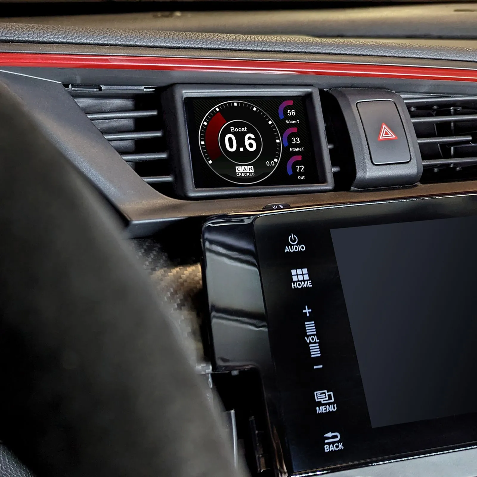 The vehicle-specific CANchecked MFD32 Gen2 for your Honda Civic Type R FK8 - perfectly integrated and all data always in view The MFD32 Gen2 transforms your air vent into an intelligent display with features you don't want to miss. Our displays are designed so that they can be installed by anyone. For most displays there are illustrated installation instructions, so you can install your display yourself without the need of any workshop. Key Features Perfect integration: The vehicle-specific bezel still allows airflow past the display Can Bus: Readout of in-depth vehicle data such as manufacturer diagnostic tools Gear display: Directly via Can Bus or calculated from speed and rpm Touchscreen: Navigate through pages using intuitive swipe gestures Customization: Design your own pages, add your own pictures or start animation Additional inputs: Connect up to 4 analog inputs and an ethanol sensor directly to the display Can Switching: Use your display as a keypad and send your own can messages to the bus Customizable Alarms: Customizable alarms can be easily configured and activated. For example, get a big warning message when the exhaust gas temperature is above 900 degrees Logging: Log and save your data to the internal SD card for later analysis. Performance Meter: Measure your 0-100, 100-200 and 0-200 times with the integrated performance meter without any additional hardware. DTC*: Read and clear the errors of engine control unit, transmission, ABS and all-wheel drive Dimming*: Your display automatically dims along with the instrument panel Different views Configure your own page or choose from several predefined views: The display is delivered with predefined sample pages Creation of own pages possible and wished Up to ten pages possible 20 different widget types (e.g. sensor value, analogue pointer, YT diagram, speed bar, round display, vertical/horizontal bar) Widgets can be scaled in size and positioned using drag and drop Colours of the widgets fully adjustable Up to 64 widgets per page Display Setup Software - DSS With the CANchecked DSS you can fully customize your display. With the integrated log viewer you can download and view log files. Furthermore, a Can-Logger is integrated. The heart is the integrated TRI Editor with which you can adjust the sensors (no matter if Can Bus or internal): Assign min-/max-values for warnings and change the names of your sensors. Supported values Many customers always ask: Which values can I get from my ECU. The answer: ALL. We have reverse-engineered the data for most engines here and can offer in-depth data. Our display supports Can Bus data query (UDS, TP2, manufacturer specific protocols) as well as data query via K-Line (ISO 9141). By default, your display is delivered with predefined TRI/TRX files. In the files, all sensors are defined, which are queried. These are different from engine to engine. Here is an extract of what is possible: Temperatures: Exhaust temperature, coolant temperature, oil temperature, intake temperature, outside temperature, gasoline temperature, DSG-temperature. Pressures: Boost pressure, ambient pressure, fuel pressure pre-feed pump, rail pressure actual/target. Lambda/mixture Lambda value, injection time, short term lambda adjustment, long term lambda adjustment Other RPM, air mass, vehicle speed, throttle angle, total ignition angle, ignition angle retraction per cylinder, N75 timing in %, terminal 30 voltage, torque, gear, diesel specific values If values are missing, they can be added later. Scope of delivery Included with every delivery MFD32 Gen2 data display integrated in the ventilation insert for LHD vehicles vehicle-specific connection cable Quickstart Guide USB data cable SD card (pre-installed to the display) SD card adapter Display foil (to prevent reflections) Connection and extension Any sensors can be connected via the four analog inputs - we support linear 0-5V as well as NTC sensors.Our in-house CANchecked sensors are stored in the TRI-/TRX-files by default and only need to be connected: AIN1: Temperature sensor (NTC01) AIN2: Transducer for exhaust gas temperature sensor type K (TCC01) AIN3: Pressure sensor 0-10 Bar (FLP01) AIN4: boost pressure sensor 0-5,5 Bar absolute (BST01) For the connection you can use our pre-assembled AIN wiring harness. Beside the analog sensors you can also connect our external shift light with eight LEDs. This can flash in different colors and the speed limits and colors can be configured directly on the display. You connect the ethanol sensor directly to the display. You need a pullup resistor (10K) between 5V and the signal. Then you can view and log the ethanol content and temperature directly on the display. Advanced functions With the Math-Channels you can calculate sensors with each other. The User-Table gives you the possibility to generate further sensors with 2D or 3D maps. Optional accessories CC24000 SLM08 - external switching lightning module CC22780 ANC04 - four-way AIN-harness CC22100 CBD08 - eight-way Can Distribution Hub CC22902 NTC01 - temperature sensor for liquids 1/8 inch NPT CC22903 TCC01 - type K converter 0-1250°C CC22901 FLP01 - Pressure sensor 0-10 Bar (145psi) M10x1 CC22900 BST01 - Pressure sensor 0-5,5 Bar absolute (80psi) *not available on all protocols