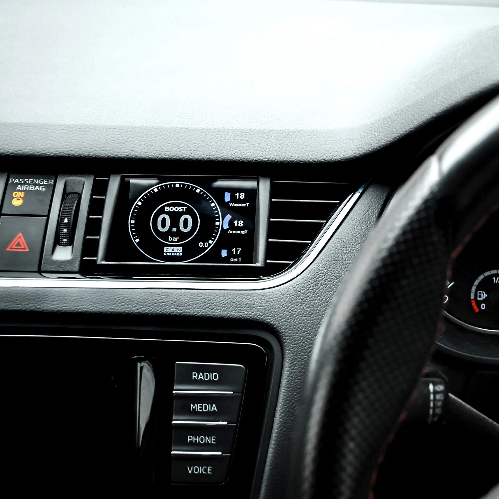 The vehicle-specific CANchecked MFD32 Gen2 for your Skoda Octavia III (5E) - perfectly integrated and all data always in view The MFD32 Gen2 transforms your air vent into an intelligent display with features you don't want to miss. Our displays are designed so that they can be installed by anyone. For most displays there are illustrated installation instructions, so you can install your display yourself without the need of any workshop. Key Features Perfect integration: The vehicle-specific bezel still allows airflow past the display Can Bus: Readout of in-depth vehicle data such as manufacturer diagnostic tools Gear display: Directly via Can Bus or calculated from speed and rpm Touchscreen: Navigate through pages using intuitive swipe gestures Customization: Design your own pages, add your own pictures or start animation Additional inputs: Connect up to 4 analog inputs and an ethanol sensor directly to the display Can Switching: Use your display as a keypad and send your own can messages to the bus Customizable Alarms: Customizable alarms can be easily configured and activated. For example, get a big warning message when the exhaust gas temperature is above 900 degrees Logging: Log and save your data to the internal SD card for later analysis. Performance Meter: Measure your 0-100, 100-200 and 0-200 times with the integrated performance meter without any additional hardware. DTC*: Read and clear the errors of engine control unit, transmission, ABS and all-wheel drive Dimming*: Your display automatically dims along with the instrument panel Different views Configure your own page or choose from several predefined views: The display is delivered with predefined sample pages Creation of own pages possible and wished Up to ten pages possible 20 different widget types (e.g. sensor value, analogue pointer, YT diagram, speed bar, round display, vertical/horizontal bar) Widgets can be scaled in size and positioned using drag and drop Colours of the widgets fully adjustable Up to 64 widgets per page Display Setup Software - DSS With the CANchecked DSS you can fully customize your display. With the integrated log viewer you can download and view log files. Furthermore, a Can-Logger is integrated. The heart is the integrated TRI Editor with which you can adjust the sensors (no matter if Can Bus or internal): Assign min-/max-values for warnings and change the names of your sensors. Supported values Many customers always ask: Which values can I get from my ECU. The answer: ALL. We have reverse-engineered the data for most engines here and can offer in-depth data. Our display supports Can Bus data query (UDS, TP2, manufacturer specific protocols) as well as data query via K-Line (ISO 9141). By default, your display is delivered with predefined TRI/TRX files. In the files, all sensors are defined, which are queried. These are different from engine to engine. Here is an extract of what is possible: Temperatures: Exhaust temperature, coolant temperature, oil temperature, intake temperature, outside temperature, gasoline temperature, DSG-temperature. Pressures: Boost pressure, ambient pressure, fuel pressure pre-feed pump, rail pressure actual/target. Lambda/mixture Lambda value, injection time, short term lambda adjustment, long term lambda adjustment Other RPM, air mass, vehicle speed, throttle angle, total ignition angle, ignition angle retraction per cylinder, N75 timing in %, terminal 30 voltage, torque, gear, diesel specific values If values are missing, they can be added later. Scope of delivery Included with every delivery MFD32 Gen2 data display integrated in the ventilation insert for RHD vehicles vehicle-specific connection cable Quickstart Guide USB data cable SD card (pre-installed to the display) SD card adapter Display foil (to prevent reflections) Connection and extension Any sensors can be connected via the four analog inputs - we support linear 0-5V as well as NTC sensors.Our in-house CANchecked sensors are stored in the TRI-/TRX-files by default and only need to be connected: AIN1: Temperature sensor (NTC01) AIN2: Transducer for exhaust gas temperature sensor type K (TCC01) AIN3: Pressure sensor 0-10 Bar (FLP01) AIN4: boost pressure sensor 0-5,5 Bar absolute (BST01) For the connection you can use our pre-assembled AIN wiring harness. Beside the analog sensors you can also connect our external shift light with eight LEDs. This can flash in different colors and the speed limits and colors can be configured directly on the display. You connect the ethanol sensor directly to the display. You need a pullup resistor (10K) between 5V and the signal. Then you can view and log the ethanol content and temperature directly on the display. Advanced functions With the Math-Channels you can calculate sensors with each other. The User-Table gives you the possibility to generate further sensors with 2D or 3D maps. Optional accessories CC24000 SLM08 - external switching lightning module CC22780 ANC04 - four-way AIN-harness CC22100 CBD08 - eight-way Can Distribution Hub CC22902 NTC01 - temperature sensor for liquids 1/8 inch NPT CC22903 TCC01 - type K converter 0-1250°C CC22901 FLP01 - Pressure sensor 0-10 Bar (145psi) M10x1 CC22900 BST01 - Pressure sensor 0-5,5 Bar absolute (80psi) *not available on all protocols