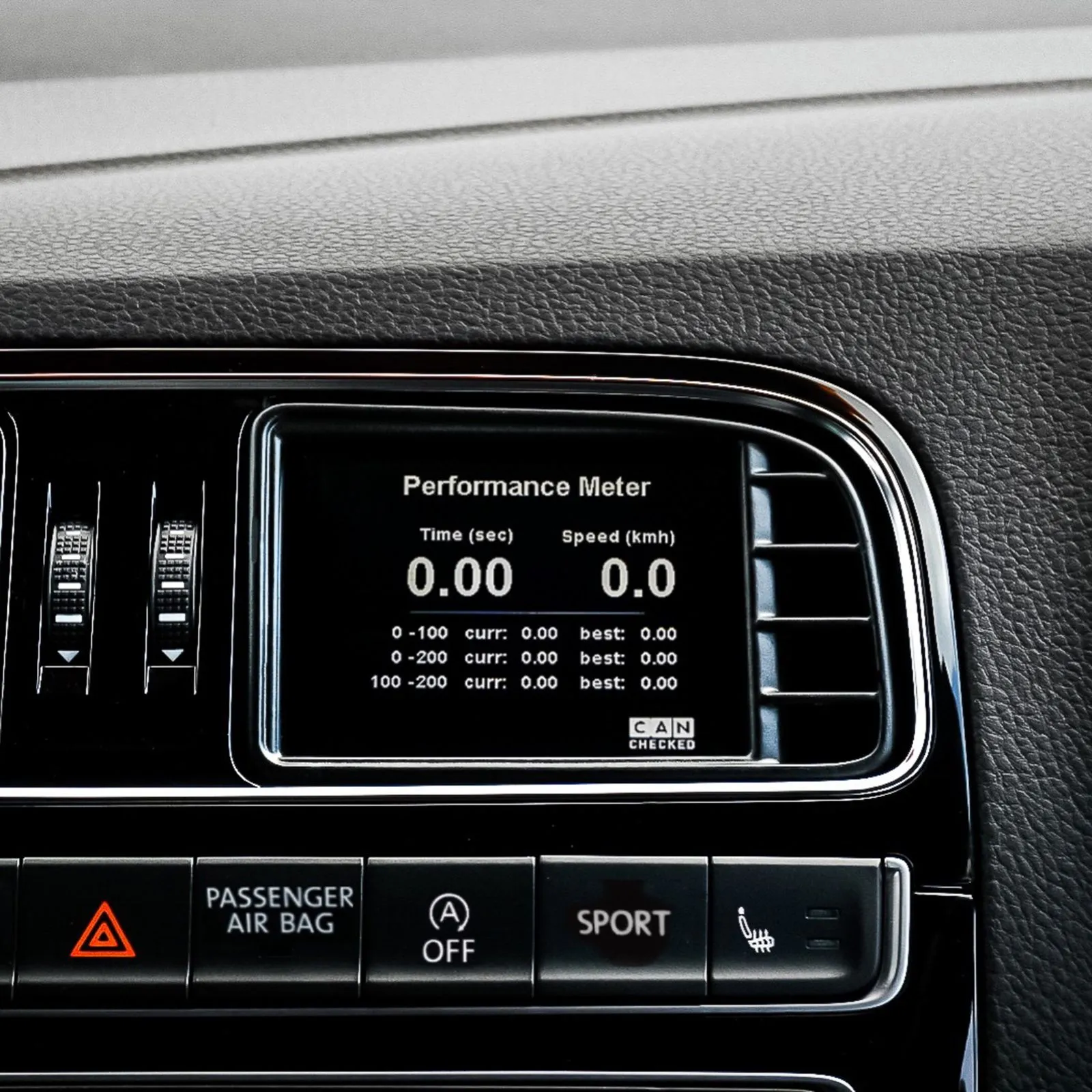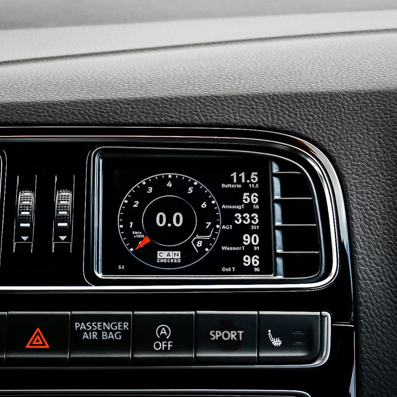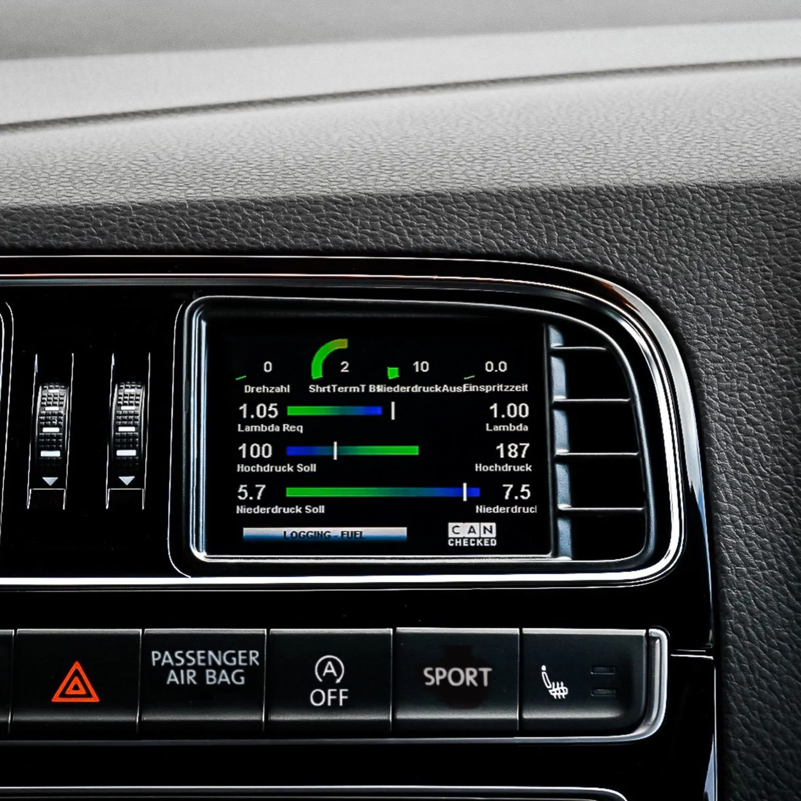 The vehicle-specific CANchecked MFD32 Gen2 for your VW Polo MK5 6C - perfectly integrated and all data always in view The MFD32 Gen2 transforms your air vent into an intelligent display with features you don't want to miss. Our displays are designed so that they can be installed by anyone. For most displays there are illustrated installation instructions, so you can install your display yourself without the need of any workshop. Key Features Perfect integration: The vehicle-specific bezel still allows airflow past the display Can Bus: Readout of in-depth vehicle data such as manufacturer diagnostic tools Gear display: Directly via Can Bus or calculated from speed and rpm Touchscreen: Navigate through pages using intuitive swipe gestures Customization: Design your own pages, add your own pictures or start animation Additional inputs: Connect up to 4 analog inputs and an ethanol sensor directly to the display Can Switching: Use your display as a keypad and send your own can messages to the bus Customizable Alarms: Customizable alarms can be easily configured and activated. For example, get a big warning message when the exhaust gas temperature is above 900 degrees Logging: Log and save your data to the internal SD card for later analysis. Performance Meter: Measure your 0-100, 100-200 and 0-200 times with the integrated performance meter without any additional hardware. DTC*: Read and clear the errors of engine control unit, transmission, ABS and all-wheel drive Dimming*: Your display automatically dims along with the instrument panel Different views Configure your own page or choose from several predefined views: The display is delivered with predefined sample pages Creation of own pages possible and wished Up to ten pages possible 20 different widget types (e.g. sensor value, analogue pointer, YT diagram, speed bar, round display, vertical/horizontal bar) Widgets can be scaled in size and positioned using drag and drop Colours of the widgets fully adjustable Up to 64 widgets per page Display Setup Software - DSS With the CANchecked DSS you can fully customize your display. With the integrated log viewer you can download and view log files. Furthermore, a Can-Logger is integrated. The heart is the integrated TRI Editor with which you can adjust the sensors (no matter if Can Bus or internal): Assign min-/max-values for warnings and change the names of your sensors. Supported values Many customers always ask: Which values can I get from my ECU. The answer: ALL. We have reverse-engineered the data for most engines here and can offer in-depth data. Our display supports Can Bus data query (UDS, TP2, manufacturer specific protocols) as well as data query via K-Line (ISO 9141). By default, your display is delivered with predefined TRI/TRX files. In the files, all sensors are defined, which are queried. These are different from engine to engine. Here is an extract of what is possible: Temperatures: Exhaust temperature, coolant temperature, oil temperature, intake temperature, outside temperature, gasoline temperature, DSG-temperature. Pressures: Boost pressure, ambient pressure, fuel pressure pre-feed pump, rail pressure actual/target. Lambda/mixture Lambda value, injection time, short term lambda adjustment, long term lambda adjustment Other RPM, air mass, vehicle speed, throttle angle, total ignition angle, ignition angle retraction per cylinder, N75 timing in %, terminal 30 voltage, torque, gear, diesel specific values If values are missing, they can be added later. Scope of delivery Included with every delivery MFD32 Gen2 data display integrated in the ventilation insert for RHD vehicles vehicle-specific connection cable Quickstart Guide USB data cable SD card (pre-installed to the display) SD card adapter Display foil (to prevent reflections) Connection and extension Any sensors can be connected via the four analog inputs - we support linear 0-5V as well as NTC sensors.Our in-house CANchecked sensors are stored in the TRI-/TRX-files by default and only need to be connected: AIN1: Temperature sensor (NTC01) AIN2: Transducer for exhaust gas temperature sensor type K (TCC01) AIN3: Pressure sensor 0-10 Bar (FLP01) AIN4: boost pressure sensor 0-5,5 Bar absolute (BST01) For the connection you can use our pre-assembled AIN wiring harness. Beside the analog sensors you can also connect our external shift light with eight LEDs. This can flash in different colors and the speed limits and colors can be configured directly on the display. You connect the ethanol sensor directly to the display. You need a pullup resistor (10K) between 5V and the signal. Then you can view and log the ethanol content and temperature directly on the display. Advanced functions With the Math-Channels you can calculate sensors with each other. The User-Table gives you the possibility to generate further sensors with 2D or 3D maps. Optional accessories CC24000 SLM08 - external switching lightning module CC22780 ANC04 - four-way AIN-harness CC22100 CBD08 - eight-way Can Distribution Hub CC22902 NTC01 - temperature sensor for liquids 1/8 inch NPT CC22903 TCC01 - type K converter 0-1250°C CC22901 FLP01 - Pressure sensor 0-10 Bar (145psi) M10x1 CC22900 BST01 - Pressure sensor 0-5,5 Bar absolute (80psi) *not available on all protocols