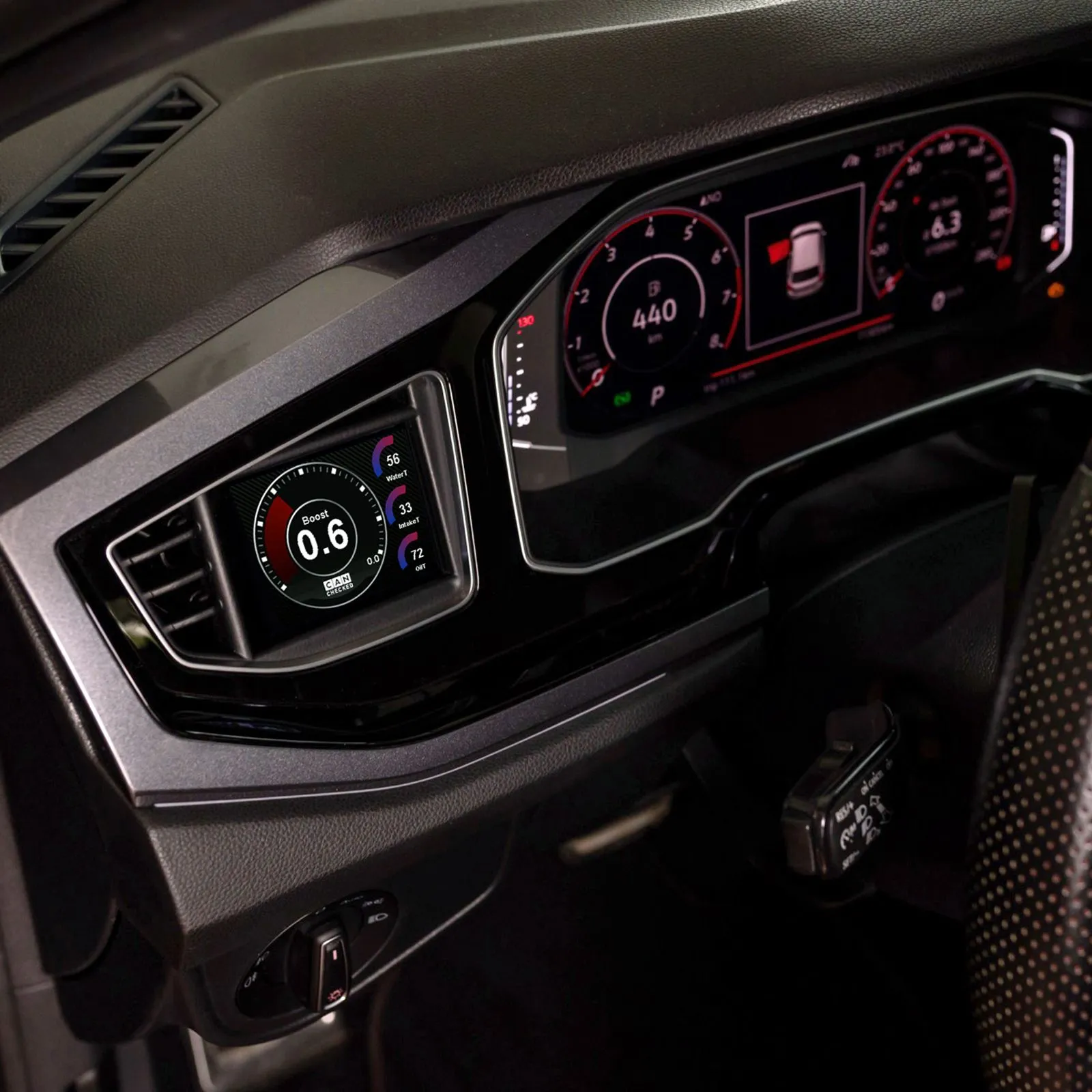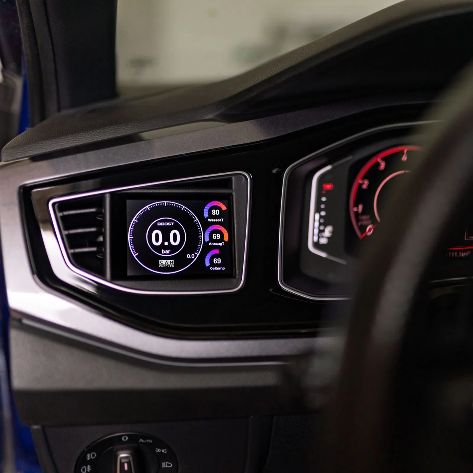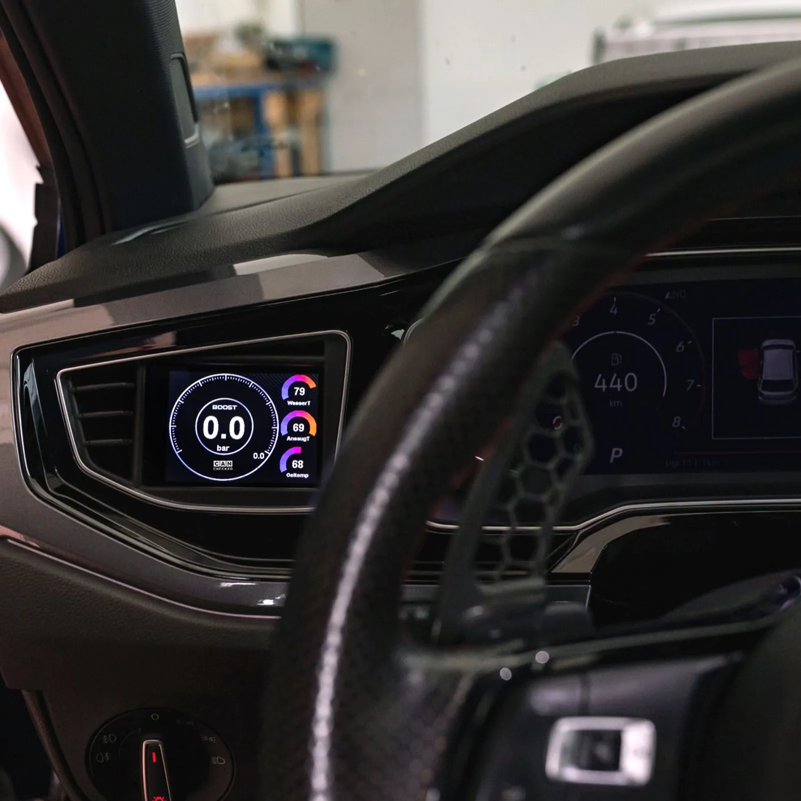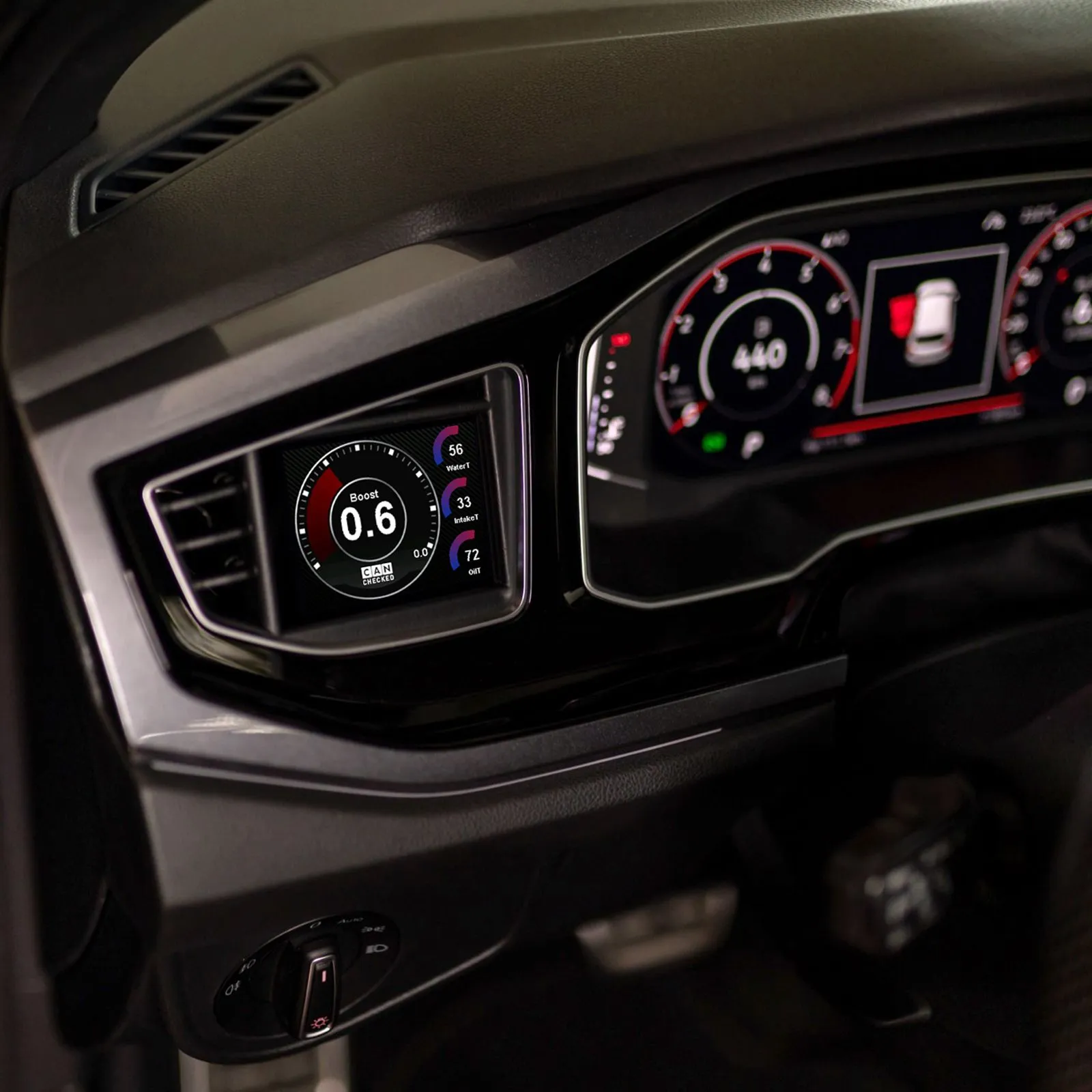 The vehicle-specific CANchecked MFD32 Gen2 for your VW Polo MK6 (Typ AW) - perfectly integrated and all data always in view The MFD32 Gen2 transforms your air vent into an intelligent display with features you don't want to miss. Our displays are designed so that they can be installed by anyone. For most displays there are illustrated installation instructions, so you can install your display yourself without the need of any workshop. Key Features Perfect integration: The vehicle-specific bezel still allows airflow past the display Can Bus: Readout of in-depth vehicle data such as manufacturer diagnostic tools Gear display: Directly via Can Bus or calculated from speed and rpm Touchscreen: Navigate through pages using intuitive swipe gestures Customization: Design your own pages, add your own pictures or start animation Additional inputs: Connect up to 4 analog inputs and an ethanol sensor directly to the display Can Switching: Use your display as a keypad and send your own can messages to the bus Customizable Alarms: Customizable alarms can be easily configured and activated. For example, get a big warning message when the exhaust gas temperature is above 900 degrees Logging: Log and save your data to the internal SD card for later analysis. Performance Meter: Measure your 0-100, 100-200 and 0-200 times with the integrated performance meter without any additional hardware. DTC*: Read and clear the errors of engine control unit, transmission, ABS and all-wheel drive Dimming*: Your display automatically dims along with the instrument panel Different views Configure your own page or choose from several predefined views: The display is delivered with predefined sample pages Creation of own pages possible and wished Up to ten pages possible 20 different widget types (e.g. sensor value, analogue pointer, YT diagram, speed bar, round display, vertical/horizontal bar) Widgets can be scaled in size and positioned using drag and drop Colours of the widgets fully adjustable Up to 64 widgets per page Display Setup Software - DSS With the CANchecked DSS you can fully customize your display. With the integrated log viewer you can download and view log files. Furthermore, a Can-Logger is integrated. The heart is the integrated TRI Editor with which you can adjust the sensors (no matter if Can Bus or internal): Assign min-/max-values for warnings and change the names of your sensors. Supported values Many customers always ask: Which values can I get from my ECU. The answer: ALL. We have reverse-engineered the data for most engines here and can offer in-depth data. Our display supports Can Bus data query (UDS, TP2, manufacturer specific protocols) as well as data query via K-Line (ISO 9141). By default, your display is delivered with predefined TRI/TRX files. In the files, all sensors are defined, which are queried. These are different from engine to engine. Here is an extract of what is possible: Temperatures: Exhaust temperature, coolant temperature, oil temperature, intake temperature, outside temperature, gasoline temperature, DSG-temperature. Pressures: Boost pressure, ambient pressure, fuel pressure pre-feed pump, rail pressure actual/target. Lambda/mixture Lambda value, injection time, short term lambda adjustment, long term lambda adjustment Other RPM, air mass, vehicle speed, throttle angle, total ignition angle, ignition angle retraction per cylinder, N75 timing in %, terminal 30 voltage, torque, gear, diesel specific values If values are missing, they can be added later. Scope of delivery Included with every delivery MFD32 Gen2 data display integrated in the ventilation insert for LHD vehicles vehicle-specific connection cable Quickstart Guide USB data cable SD card (pre-installed to the display) SD card adapter Display foil (to prevent reflections) Connection and extension Any sensors can be connected via the four analog inputs - we support linear 0-5V as well as NTC sensors.Our in-house CANchecked sensors are stored in the TRI-/TRX-files by default and only need to be connected: AIN1: Temperature sensor (NTC01) AIN2: Transducer for exhaust gas temperature sensor type K (TCC01) AIN3: Pressure sensor 0-10 Bar (FLP01) AIN4: boost pressure sensor 0-5,5 Bar absolute (BST01) For the connection you can use our pre-assembled AIN wiring harness. Beside the analog sensors you can also connect our external shift light with eight LEDs. This can flash in different colors and the speed limits and colors can be configured directly on the display. You connect the ethanol sensor directly to the display. You need a pullup resistor (10K) between 5V and the signal. Then you can view and log the ethanol content and temperature directly on the display. Advanced functions With the Math-Channels you can calculate sensors with each other. The User-Table gives you the possibility to generate further sensors with 2D or 3D maps. Optional accessories CC24000 SLM08 - external switching lightning module CC22780 ANC04 - four-way AIN-harness CC22100 CBD08 - eight-way Can Distribution Hub CC22902 NTC01 - temperature sensor for liquids 1/8 inch NPT CC22903 TCC01 - type K converter 0-1250°C CC22901 FLP01 - Pressure sensor 0-10 Bar (145psi) M10x1 CC22900 BST01 - Pressure sensor 0-5,5 Bar absolute (80psi) *not available on all protocols
