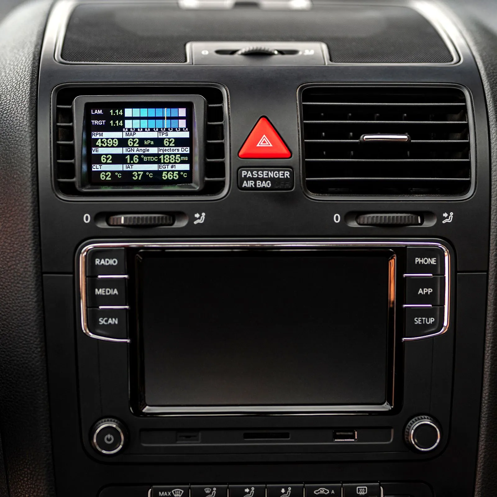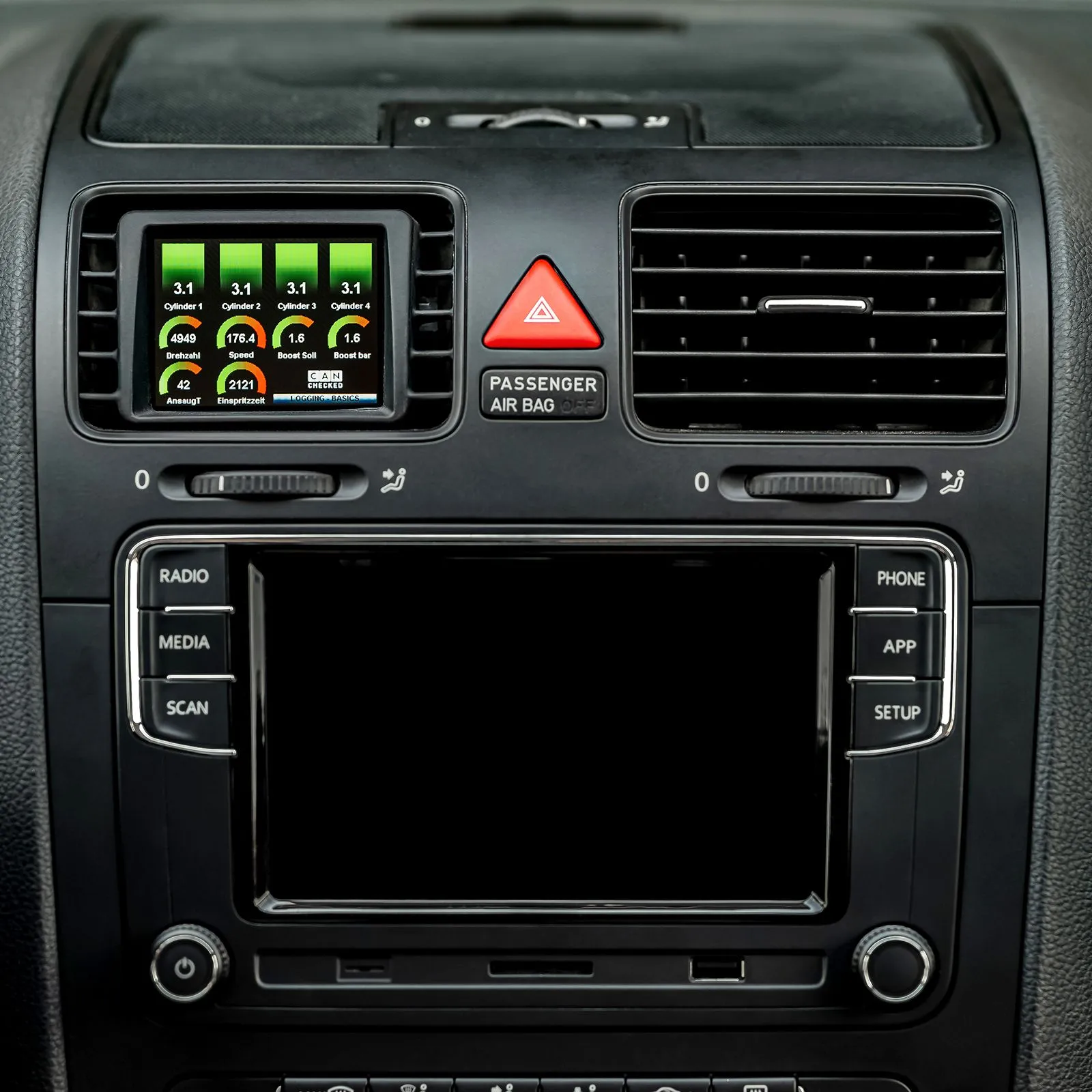 CANchecked Wielofunkcyjny Wyświetlacz MFD28 Gen2 do Volkswagen Golf MK5 1K 2003–2008 Pojazdowy, dedykowany CANchecked Multi Function Display MFD28 Gen2 do Volkswagen Golf MK5 (1K, 2003–2008) to wyświetlacz idealnie zintegrowany z wnętrzem auta. Zastępuje seryjny nawiew inteligentnym ekranem, który zapewnia stały dostęp do kluczowych parametrów pracy silnika i pojazdu. Dzięki przemyślanej konstrukcji oraz ilustrowanej instrukcji montażu, urządzenie można zainstalować samodzielnie – bez konieczności wizyty w warsztacie. Najważniejsze cechy Perfekcyjna integracja: dedykowana ramka zachowuje przepływ powietrza przez nawiew mimo zabudowy wyświetlaczem. Can Bus: odczyt zaawansowanych danych pojazdu na poziomie fabrycznych narzędzi diagnostycznych. Wskazanie biegu: bezpośrednio z CAN lub na podstawie prędkości i obrotów silnika. Ekran dotykowy: nawigacja po stronach za pomocą intuicyjnych gestów. Personalizacja: możliwość tworzenia własnych stron, dodawania grafik i animacji startowych. Dodatkowe wejścia: do 4 wejść analogowych oraz możliwość bezpośredniego podłączenia czujnika etanolu. Can Switching: wykorzystanie wyświetlacza jako „klawiatury” wysyłającej własne ramki CAN do magistrali. Konfigurowalne alarmy: łatwe ustawienie progów ostrzegawczych, np. komunikat przy temperaturze spalin powyżej 900°C. Rejestrowanie danych: logowanie i zapis parametrów na wewnętrznej karcie SD. Performance Meter: pomiar czasów 0–100, 100–200 oraz 0–200 km/h bez dodatkowego osprzętu. DTC*: odczyt i kasowanie błędów sterownika silnika, skrzyni biegów, ABS oraz napędu 4x4. Automatyczne ściemnianie*: automatyczne dopasowanie jasności wyświetlacza do podświetlenia zestawu wskaźników. Różne widoki fabrycznie wgrane przykładowe strony, możliwość stworzenia do 10 własnych stron, 20 typów widgetów (np. wartość czujnika, wskaźnik analogowy, wykres, pasek prędkości, okrągły wskaźnik, pionowy/poziomy bargraf), skalowanie i swobodne rozmieszczanie widgetów metodą „przeciągnij i upuść”, pełna regulacja kolorów widgetów, do 64 widgetów na jednej stronie. Display Setup Software – DSS Z pomocą CANchecked DSS można w pełni dopasować działanie wyświetlacza do swojego auta: pobieranie i przegląd logów w wbudowanym log viewerze, zintegrowany CAN-Logger do zapisu ramek, edytor TRI do konfiguracji wszystkich czujników (zarówno z CAN, jak i wejść analogowych), ustawianie wartości minimalnych i maksymalnych dla alarmów, zmiana nazw czujników. Obsługiwane wartości Częste pytanie klientów: „Jakie wartości mogę odczytać z ECU?” Odpowiedź: wszystkie, które sterownik silnika udostępnia. Dla większości silników dane zostały zrewersowane (reverse engineering), dzięki czemu możliwy jest szczegółowy odczyt parametrów. Wyświetlacz obsługuje zapytania po CAN (UDS, TP2, protokoły producentów). Domyślnie urządzenie dostarczane jest z wgranymi plikami TRI/TRX, w których zdefiniowane są czujniki odczytywane w danym silniku. Pomiędzy jednostkami wartości mogą się różnić. Przykładowo: Temperatury: temperatura spalin, płynu chłodzącego, oleju, powietrza dolotowego, temperatura zewnętrzna, temperatura paliwa, temperatura DSG. Ciśnienia: ciśnienie doładowania, ciśnienie atmosferyczne, ciśnienie paliwa z pompy wstępnej, ciśnienie na listwie (wartość aktualna/docelowa). Lambda / mieszanka: wartość lambda, czas wtrysku, krótkoterminowe i długoterminowe korekty. Inne: obroty silnika, masa powietrza, prędkość pojazdu, kąt otwarcia przepustnicy, całkowity kąt wyprzedzenia zapłonu, korekta zapłonu na cylinder, wysterowanie N75 w %, napięcie na zacisku 30, moment obrotowy, aktualny bieg, wartości specyficzne dla silników wysokoprężnych. Brakujące wartości można dodać później. Zawartość zestawu W każdym zestawie znajdują się: MFD28 Gen2 – wyświetlacz danych zintegrowany z wkładką nawiewu dla pojazdów LHD i RHD, dedykowana wiązka pojazdowa, instrukcja szybkiego uruchomienia (Quickstart Guide), przewód USB, karta SD (wstępnie zainstalowana w wyświetlaczu), adapter karty SD, folia ochronna na ekran (ogranicza odblaski). Podłączenia i rozszerzenia Do czterech wejść analogowych można podłączyć dowolne czujniki – obsługiwane są: czujniki liniowe 0–5 V, czujniki NTC. Czujniki CANchecked są domyślnie zapisane w plikach TRI/TRX – wystarczy je podłączyć: AIN1: czujnik temperatury NTC01, AIN2: przetwornik typu K do czujnika temperatury spalin TCC01, AIN3: czujnik ciśnienia 0–10 bar FLP01, AIN4: czujnik ciśnienia doładowania 0–5,5 bar absolute BST10. Do podłączenia można wykorzystać gotową wiązkę AIN. Dodatkowo: możliwość podłączenia zewnętrznego shift-light z 8 diodami LED – różne kolory i progi obrotów konfigurowane bezpośrednio na wyświetlaczu, możliwość bezpośredniego podłączenia czujnika etanolu – wymagany rezystor pull-up 10 kΩ pomiędzy 5V a sygnałem; następnie zawartość etanolu oraz temperatura mogą być wyświetlane i logowane na ekranie. Funkcje zaawansowane Math-Channels: obliczanie nowych wartości na podstawie danych z różnych czujników, User-Table: tworzenie dodatkowych czujników w oparciu o mapy 2D lub 3D. Akcesoria opcjonalne CC24000 SLM08 – zewnętrzny moduł shift-light, CC22780 ANC04 – czterodrożna wiązka AIN, CC22100 CBD08 – ośmiokanałowy hub magistrali CAN, CC22902 NTC01 – czujnik temperatury cieczy 1/8" NPT, CC22903 TCC01 – konwerter typu K 0–1250°C, CC22901 FLP01 – czujnik ciśnienia 0–10 bar (145 psi), M10×1, CC22900 BST10 – czujnik ciśnienia względnego 6,5 bar (95 psi). * funkcje niedostępne w każdym protokole.
