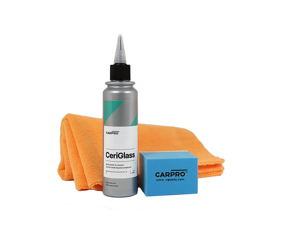 CeriGlass KIT Innowacyjny środek do polerowania szkła, zaprojektowany w oparciu o nano komponenty. Dzięki niemu pozbędziesz się trudnych do usunięcia wodnych zacieków, które przywierają do powierzchni. CeriGlass składa się z delikatnych środków ściernych, które z łatwością głęboko czyszczą i polerują szklane powierzchnie. Produkt ten szybko usuwa plamy z kwaśnego deszczu, osadu drogowego, odporne na usuwanie ptasie odchody oraz wszelkie irytujące zewnętrzne zabrudzenia. CeriGlass potrafi także usunąć niewielkie zarysowania. Pozostawia powierzchnie idealnie czystą i lśniącą. Można go aplikować ręcznie lub przy pomocy maszyny. Nie zawiera szkodliwych substancji dla rąk. Zalety: Nie odkształca powierzchni. Idealny od restaurowania szyb. Można stosować w celu odświeżenia I wyczyszczenia chromowanych i metalowych powierzchni. Można aplikować ręcznie lub przy pomocy maszyny. Nie należy stosować na pomalowanych lub przyciemnianych szklanych powierzchniach. Idealny do polerowania szkła organicznego oraz do odnawiania reflektorów Nadaje się do usuwania zarysowań po wycieraczkach oraz drobnych wgłębień. Wskazówki dotyczące aplikacji: Przed użyciem należy dobrze wstrząsnąć butelkę. Nałożyć niewielką ilość produktu na czystą szmatkę do polerowania szkła lub nasz ręczny aplikator do szkła. Należy dobrze zabezpieczyć gumowe uszczelki oraz elementy karoserii za pomocą nylonu taka by nie zabrudzić jej pyłem. Rozprowadź środek kolistymi ruchami. Dobrze spłucz wodą. Wytrzyj do sucha mikrofibrą. Środki ostrożności: Zalecamy przetestować środek na małej powierzchni, aby upewnić się, że jej nie rysuje. Aby osiągnąć najlepszy rezultat, należy aplikować środek w zacienionym miejscu oraz na zimną szybę. Zaleca się nakładanie maski ochronnej na twarz w trakcie polerowania mechanicznego, aby uniknąć wdychania pyłu polerskiego. Zestaw zawiera: CarPro Ceriglass 150 ml Aplikator piankowy z filcem 1szt Mikrofibra 40x40cm
