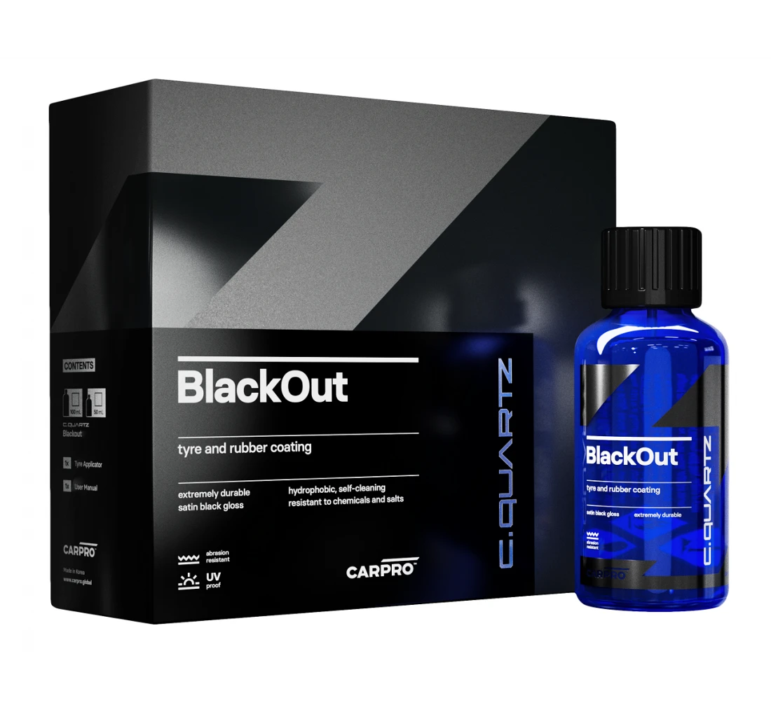 CQuartz Black Out Produkt wykorzystujący technologię polisiloksanów połączoną z żywicą akrylową na bazie wody, dzięki czemu zapewnia długotrwałą ochronę i satynowe wykończenie. Produkt można stosować na oponach, elementach gumowych i nielakierowanej żywicy. Powłoka jest o wiele trwalsza niż tradycyjne dressingi do opon, a dzięki bazie wodnej nie pozostawia lepkiej powierzchni (jak w przypadku produktów na bazie silikonów), co zapobiega nadmiernemu przywieraniu brudu. Unikalna formuła produktu spowalnia proces starzenia gumy i zabezpiecza przed szkodliwym działaniem promieniowania UV. BlackOut przywraca głębię i połysk nielakierowanym elementom z żywicy. Najważniejsze cechy: Samoczyszcząca, hydrofobowa, odporna na działanie soli i chemii Odporna na promieniowanie UV Zapewnia czarne satynowe wykończenie Nie zawiera lotnych związków organicznych Aplikacja powłoki: Dokładnie umyć opony za pomocą CarPro MultiX. Wysuszyć opony. Wstrząsnąć butelką przed otwarciem. Nanieść BlackOut na aplikator do opon. Zaaplikować powłokę na boczne ścianki opony. Pozostawić powłokę do wyschnięcia na 1 godzinę w temperaturze 25 °C lub 2 godziny w 15 °C. Zalecamy stosowanie wentylatora jako urządzenie wspomagające suszenie (w szczególności w niższych temperaturach). W celu zaaplikowania drugiej warstwy, powtórzyć powyższe czynności. Dane techniczne: Czas schnięcia: 4 godziny Czas pełnego schnięcia: 12 godzin Unikać chemii przez pierwsze 3 dni. Zalecana temperatura aplikacji: 15 - 30 °C Trwałość: +/- 6 miesięcy Pojemność: 50ml