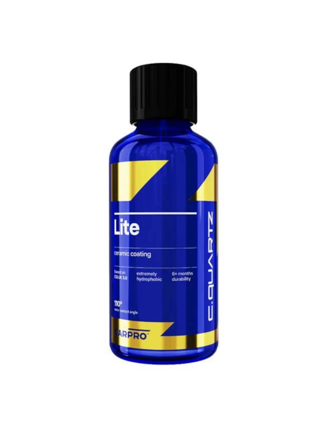 CQuartz Lite Przyjazna dla użytkownika, prosta w aplikacji powłoka ceramiczna. “Lite” bazuje na niesamowitej technologii CQuartz UK Ceramic Coating, która stała się znana na całym świecie. CQuartz Lite można aplikować jako samodzielną powłokę ceramiczną, której trwałość wynosi powyżej 6 miesięcy lub jako wzmocnienie dla już istniejących powłok CQuartz. CQuartz Lite został zaprojektowany dla tych, którzy nie są gotowi na aplikację profesjonalnych powłok ceramicznych, ale pragną korzystać z wielu korzyści, jakie oferują powłoki CQuartz. CQuartz Lite wypełnia lukę pomiędzy trwałymi woskami a powłokami CQuartz, które tak wielu pokochało. CQuartz Lite to łatwiejsze domywanie, odporność na pozostałości po owadach i chemikalia o pH 3-14 oraz szkodliwe promieniowanie UV, a także doskonałe właściwości hydrofobowe. Powłoka może być aplikować na każdej zewnętrznej powierzchni samochodu, w tym lakierze, tworzywach sztucznych, kołach i szkle (z wyjątkiem szyby przedniej), podobnie jak inne produkty CQuartz, CQuartz Lite można stosować na matowe lakiery! Aplikacja powłoki: Upewnij się, że powierzchnia lakieru jest całkowicie czysta i pozbawiona zanieczyszczeń. Użyj Car Pro Iron X, Car Pro Tar X oraz glinki, aby usunąć wszystkie zanieczyszczenia. Przeprowadź korektę lakieru, aby uzyskać wysoki połysk i wydłużyć trwałość powłoki. Odtłuść powierzchnię za pomocą Car Pro Eraser. Nanieś 10-12 kropli na aplikator z mikrofibry i rozprowadź również na powierzchni ok. 60x60cm. Użyj wysokiej jakości mikrofibry, aby usunąć nadmiar produktu. Nie wolno pozostawiać niedotartego CQuartz Lite do utwardzenia na zabezpieczanej powierzchni, dlatego należy go natychmiast usunąć. Sprawdź za pomocą odpowiedniego światła, czy usunąłeś wszelkie plamy i pozostałości powłoki. Uwaga! Niedotarte pozostałości powłoki można usunąć w pierwszych minutach po aplikacji. Nakładając CQuartz Lite na dany obszar i natychmiast wycierając. Powłokę należy pozostawić do wyschnięcia na przynajmniej 4 godziny. W pierwszych 48 godzinach należy unikać kontaktu powłoki z wodą. Wodę usuwać delikatnie za pomocą mikrofibry. Zalecamy aplikację Car Pro Reload godzinę po nałożeniu CQuartz Lite, aby chronić powłokę przed wodą w ciągu pierwszych 48 godzin. Środki ostrożności: Używać rękawiczek ochronnych. Używać ochrony dróg oddechowych. Pojemność: 100ml