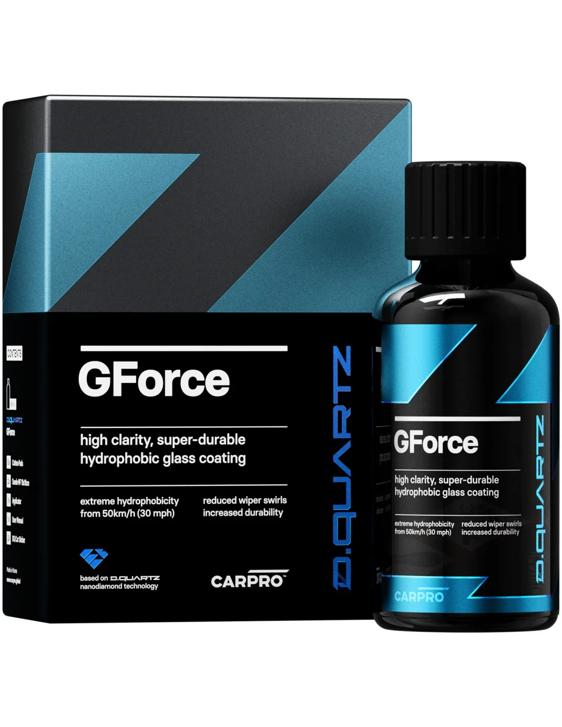CARPRO DQUARTZ GFORCE Niezwykle trwała powłoka do zabezpieczenia szyb o wysokiej transparentności, która bazuje na technologii nanodiamentowej DQuartz. Wznosi ochronę powierzchni szklanych na zupełnie nowy poziom, a także zwiększa komfort podróżowania w deszczowych warunkach atmosferycznych. Dlaczego warto wybrać DQuartz GForce? Przeprojektowana technologia hydrofobowości i przyczepności, aby zapewnić silne połączenie z powierzchnią szkła. Dzięki czemu krople wody swobodnie spływają z szyby już poniżej 50km/h. DQuartz GForce to doskonała widoczność w deszczowych warunkach! Produkt wykorzystuje najnowszą technologię DQuartz z nanocząsteczkami diamentu, zapewniając niespotykaną dotąd odporność na zarysowania. Powłoka nie tylko przywraca blask szybom, ale także chroni je przed zarysowaniami i przywieraniem zanieczyszczeń. Bez względu na porę roku DQuartz GForce to doskonały wybór. Zapewnia długotrwałą ochronę w każdych warunkach atmosferycznych. Produkt zwiększa bezpieczeństwo jazdy niezależnie od warunków panujących na zewnątrz. Najważniejsze cechy: Ekstremalna hydrofobowość, Ekstremalna odporność na ścieranie, Odporność na chemikalia i promieniowanie UV. Pojemność: 50 ml Opakowanie zawiera: 1x DQuartz GForce 50ml 5x pad bawełniany 2x MF 10x10cm 1x aplikator 1x instrukcja 2x DQ naklejka