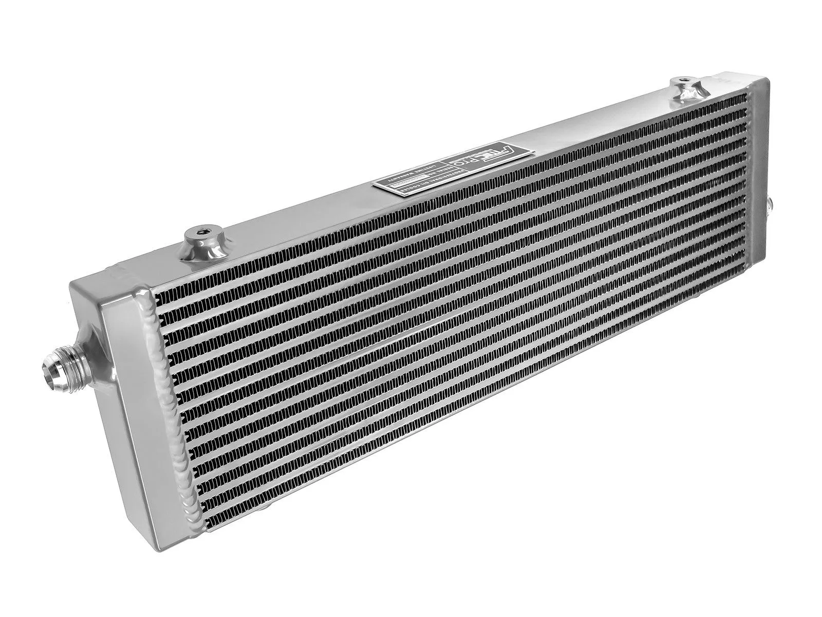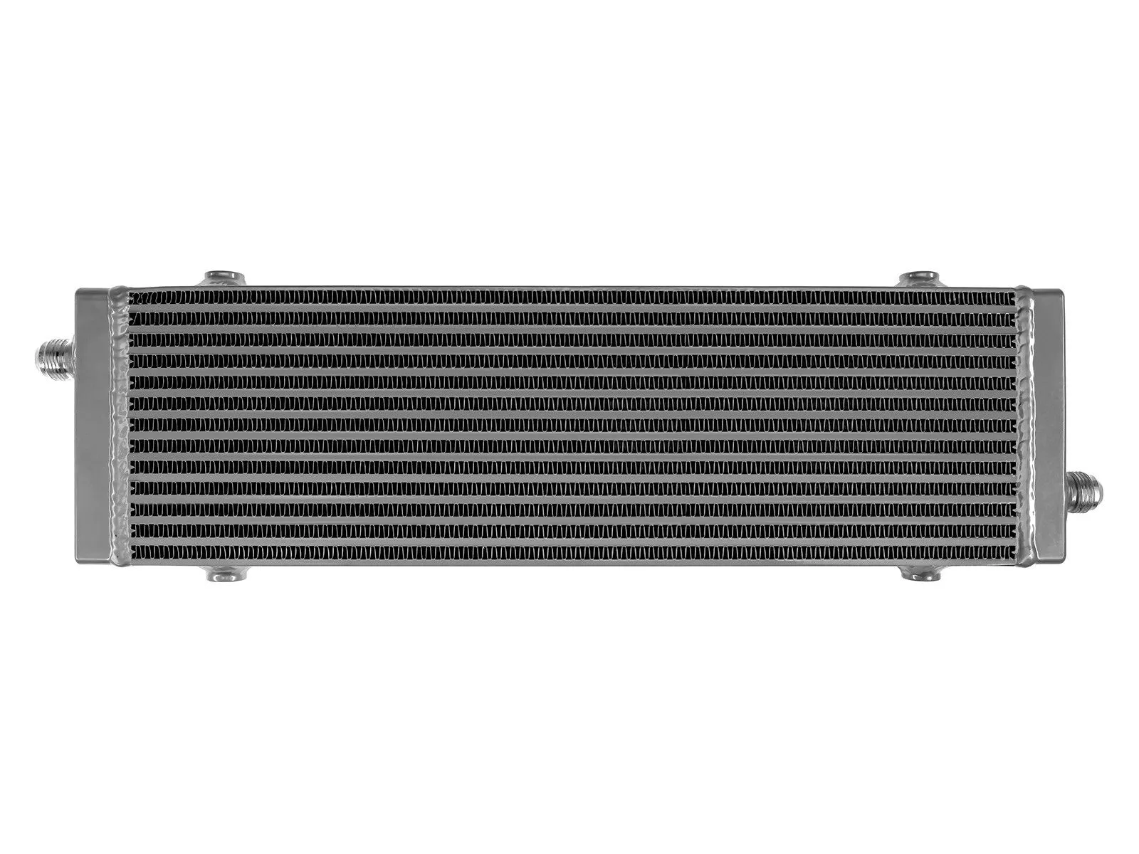 Aluminiowa, niezwykle wydajna chłodnica oleju FMIC.Pro jest niezbędnym elementem tuningowym każdego auta. Jej solidne wykonanie gwarantuje odporność na wysokie ciśnienie (ponad 10B), a odpowiednia gęstość żeberek radiatora zapewnia skuteczne chłodzenie nawet w ekstremalnych warunkach. Rdzeń w chłodnicy FMIC.Pro jest wykonany ze specjalnego stopu aluminium, dzięki któremu szybciej oddaje ciepło, a jej podłużna, pozioma budowa rdzenia znacząco wydłuża czas przepływu oleju, co skutecznie wpływa na obniżenie jego temperatury. Boczki chłodnicy wykonane są w technologii CNC, całość pomalowana farbą odporną na wysokie temperatury. Z powodzeniem można ją stosować w autach przygotowanych do sportu, jak i streetu. Chłodnica wyposażona jest w gwinty męskie AN10 JIC. Taki rodzaj podłączenia umożliwia bezproblemowy dobór złączy oraz przewodów w celu dopasowania i umiejscowienia chłodnicy w dowolnym pojeździe. Poziomy układ króćców wejście/wyjście umożliwia nietypowy montaż chłodnicy, często niezbędny w motorsporcie. Wymiary rdzenia: 470x140x40mm Rozstaw otworów montażowych: 380mm Szerokość całkowita: 520mm Długość króćca: 30mm