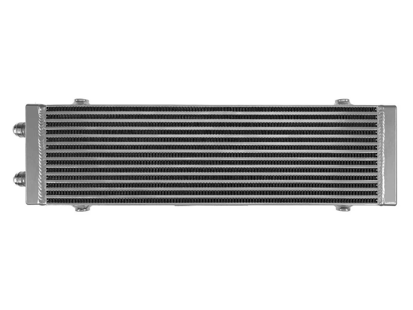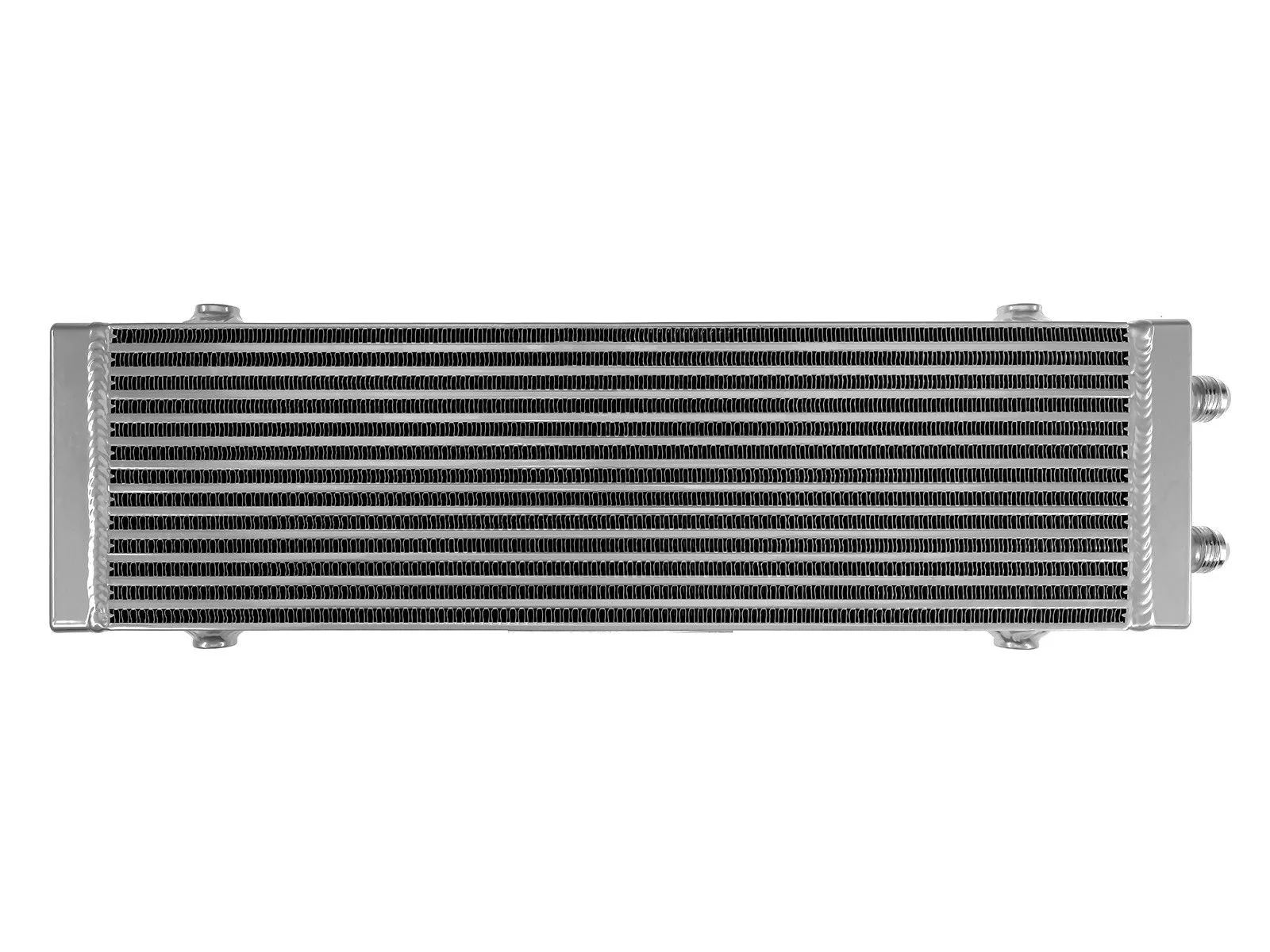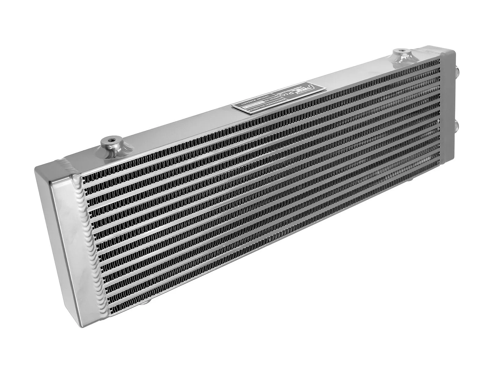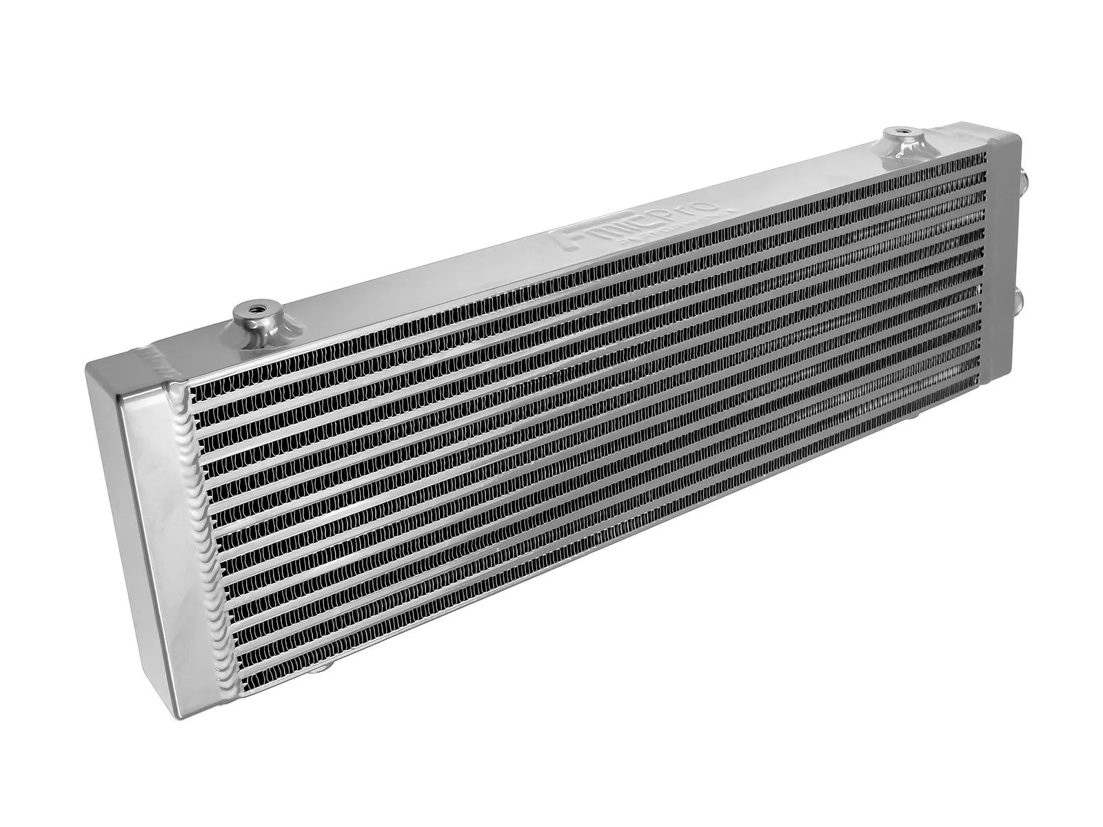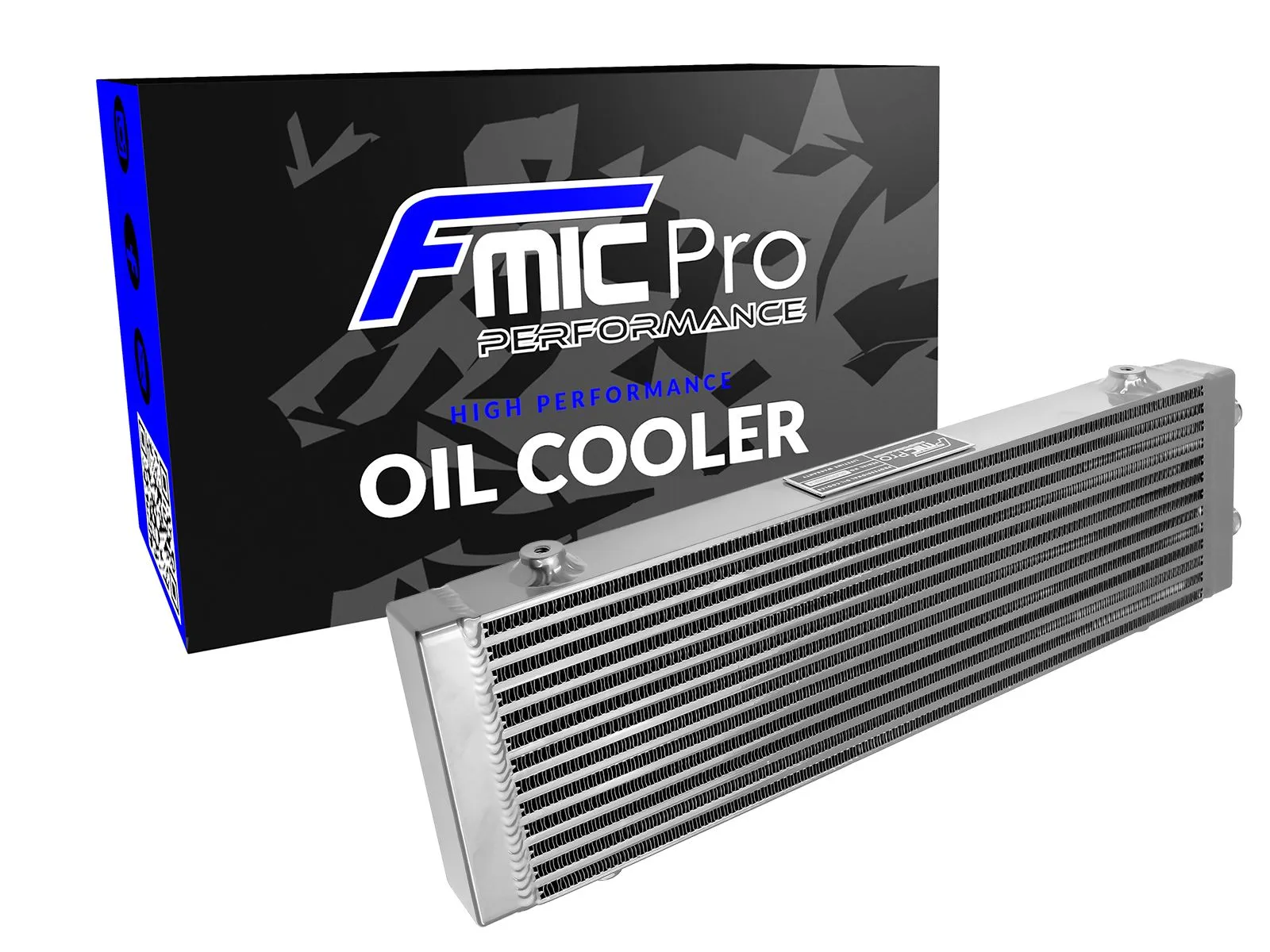 Aluminiowa, niezwykle wydajna chłodnica oleju FMIC.Pro jest niezbędnym elementem tuningowym każdego auta. Jej solidne wykonanie gwarantuje odporność na wysokie ciśnienie (ponad 10B), a odpowiednia gęstość żeberek radiatora zapewnia skuteczne chłodzenie nawet w ekstremalnych warunkach. Rdzeń w chłodnicy FMIC.Pro jest wykonany ze specjalnego stopu aluminium, dzięki któremu szybciej oddaje ciepło, a jej podłużna, pozioma budowa rdzenia znacząco wydłuża czas przepływu oleju, co skutecznie wpływa na obniżenie jego temperatury. Boczki chłodnicy wykonane są w technologii CNC, całość pomalowana farbą odporną na wysokie temperatury. Z powodzeniem można ją stosować w autach przygotowanych do sportu, jak i streetu. Chłodnica wyposażona jest w gwinty męskie AN10 JIC. Taki rodzaj podłączenia umożliwia bezproblemowy dobór złączy oraz przewodów w celu dopasowania i umiejscowienia chłodnicy w dowolnym pojeździe. Poziomy układ króćców wejście/wyjście umożliwia nietypowy montaż chłodnicy, często niezbędny w motorsporcie. Wymiary rdzenia: 470x140x40mm Rozstaw otworów montażowych: 380mm Szerokość całkowita: 520mm Długość króćca: 30mm