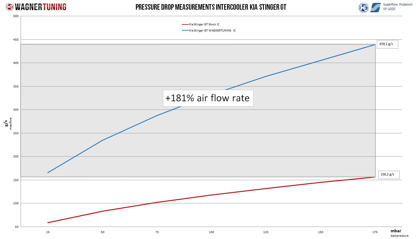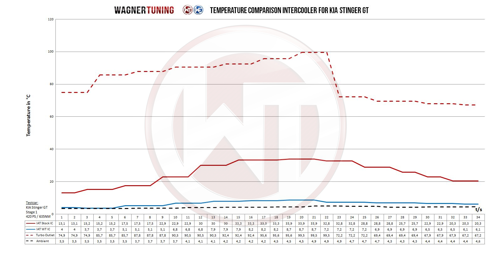 Uwolnij pełny potencjał swojego Kia Stinger GT 3.3T-Gdi AWD (UE) dzięki COMPETITION CHARGE AIR COOLER KIT!Gotowy przesunąć granice możliwości swojego Kia Stinger GT? Wysokowydajny charge air cooler Wagner Tuning z przełomowym Competition core (Tube Fin) wyniesie Twoje wrażenia z jazdy na nowy poziom.Zaprojektowany z myślą o najbardziej wymagającej jeździe Twoim Kia Stinger GT 3.3T-Gdi AWD (UE) – ten wysokowydajny radiator robi różnicę. Innowacyjny Competition core (Tube Fin) o imponujących wymiarach 600 mm x 445(315) mm x 105(60) mm [stepped design] zapewnia aż o 175% większą powierzchnię przepływu i o 183% większą objętość netto w porównaniu z seryjnym intercoolerem.Odlewane aluminiowe komory końcowe zaprojektowano z najwyższą precyzją w CAD i zoptymalizowano w symulacjach CFD, aby uzyskać idealny przepływ wewnętrzny. Zintegrowana przegroda powietrzna przy wlocie chłodnicy gwarantuje równomierne napełnianie intercoolera, a nowo opracowana Competition high-performance mesh zapewnia odpowiedni przepływ powietrza do sąsiednich podzespołów, takich jak chłodnica cieczy. Niska masa spotyka się tu z wydajnością – to idealny wybór do motorsportu.Efekt zwiększenia osiągów jest nie do przeoczenia, wspierany przez powłokę antykorozyjną o znakomitych właściwościach przewodzenia ciepła. Chroni ona intercooler przed wpływem środowiska i zapewnia długotrwałe, optymalne chłodzenie. Dzięki montażowi w oryginalnych punktach mocowania (plug and play) droga do ponadprzeciętnych osiągów jest prosta.Dzięki średnicy wlotu i wylotu Ø76 mm ten intercooler kit oferuje opcjonalne akcesoria, w tym Ø76 mm aluminum charge air tube, aby jeszcze bardziej poszerzyć możliwości tuningu. Przygotuj się, by wykorzystać pełen potencjał swojego Kia Stinger GT 3.3T-Gdi AWD (UE). Wybierz COMPETITION CHARGE AIR COOLER KIT i poznaj nowy wymiar wydajności!core dimensions OEM intercooler:V = 8.75 LA = 972 cm²core dimensions Wagner Tuning intercooler:V = 24,8 LA = 2670 mm²