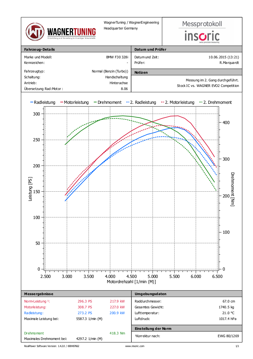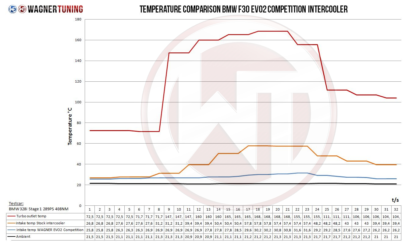 Maximize the performance of your BMW with our EVO 2 High Performance Intercooler Kit!Your BMW deserves the best, and our EVO 2 High Performance Intercooler Kit will ensure you get just that. Here's what you can expect:The Wagner Tuning intercooler offers an amazing 68% larger flow area compared to the factory cooler. This means more fresh air for your engine and a noticeable increase in performance.Our kit offers an amazing 90% more charge air volume than the stock cooler. This results in improved combustion and ultimately more power and efficiency.Despite its impressive size, our intercooler weighs only 8.6 kg. The end boxes of the cooler are made of cast aluminum and were optimized with the help of flow analyses in the CFD system. This guarantees optimal airflow and minimizes backpressure.Our Competition high-performance intercooler core is a high-quality tube-fin core with internal turbulators that ensures excellent cooling properties. All of our intercoolers feature an anti-corrosion coating with excellent heat conduction properties to ensure long-lasting and optimal cooling.Designed for easy installation, our kit is a plug-and-play upgrade. You can still use your original charge air hoses, making installation even easier.The EVO 2 kit is specifically designed to meet the high demands of the BMW and is ready to take your performance to the next level.We put all of our products through rigorous quality monitoring to ensure they meet the highest standards.Don't miss your chance to boost the performance of your BMW. Visit our website for more information and to order your kit.The Competition Intercooler Kit EVO 2 is also plug and play suitable for the following vehicles:BMW 114i F20 / F21 75KW/102PS (2012-2015).BMW 116i F20 / F21 100KW/136PS (2011-2015)BMW 116i F20 / F21 80KW/109PS (2015+)BMW 118i F20 / F21 125KW/170PS (2011-2015)BMW 118i F20 / F21 100KW/136PS (2015+)BMW 120i F20 / F21 130KW/177PS (2014-06/2016)BMW 125i F20 / F21 160KW/218PS (2012-06/2016)BMW M135i(x) F20 / F21 235-240KW/320-326PS (2011-2016)BMW 114d F20 / F21 70KW/95PS (2012+)BMW 116d F20 / F21 85KW/116PS (2011+)BMW 118d(x) F20 / F21 105-110KW/143-150PS (2011+)BMW 120d(x) F20 / F21 135-140KW/184-190PS (2011+)BMW 125d F20 / F21 160-165KW/218-224PS (2012+)BMW 218i F22 100KW/136PS (2015-2020)BMW 220i F22 135KW/184PS (2014-06/2016)BMW 228i(x) F22 180KW/245hp (2014-06/2016)BMW M235i(x) F22 240KW/326HP (2014-2016)BMW M2 F87 272KW/370HP (2016-2018)BMW 218d F22 103-110KW/143-150PS (20142020)BMW 220d(x) F22 135-140KW/184-190PS (2014-2020)BMW 225d F22 160-165KW/218-224PS (2014-2019)BMW 316i F30 / F31 / F34 100KW/136PS (2011-2015)BMW 318i F30 / F31 / F34 100KW/136PS (2015+)BMW 320i(x) F30 / F31 / F34 135KW/184PS (2011-2015)BMW 328i(x) F30 / F31 / F34 180KW/245PS (2011-2015)BMW 335i(x) F30 / F31 / F34 225KW/306PS (2011-2015)BMW 316d F30 / F31 / F34 85KW/116PS (2012+)BMW 318d(x) F30 / F31 / F34 105KW/143PS (2012+)BMW 320d(x) F30 / F31 / F34 135-140KW/184-190PS (2011+)BMW 325d F30 / F31 / F34 160KW/218PS (2013+)BMW 328(x)d F30 / F31 / F34 135KW/184PS (2013+)BMW 330d(x) F30 / F31 / F34 190KW/258PS (2012+)BMW 335d(x) F30 / F31 / F34 230KW/313PS (2013+)BMW 418i F32 / F36 100KW/134PS (2016-)BMW 420i(x) F32 / F36 135KW/184PS (2013-2015)BMW 428i(x) F32 / F36 180KW/245HP (2013-2016)BMW 435i(x) F32 / F36 225KW/306HP (2013-2016)BMW 418d F32 / F36 105-110KW/1143-150PS (2014+)BMW 420d(x) F32 / F36 135-140KW/184-190PS (2013+)BMW 425d F32 / F36 160-165KW/218-224PS (2014+)BMW 430d(x) F32 / F36 190KW/258PS (2013+)BMW 435d(x) F32 / F36 230KW/313hp (2013+)Dimensions original intercooler:510mmx130mmx110mmA= 7.293cm³Dimensions Wagner Tuning intercooler:520mm x215mm x145mm / steppedA= 13.840cm³Part number 200001071Kit comes with:1 intercooler1 mounting material1 assembly instruction