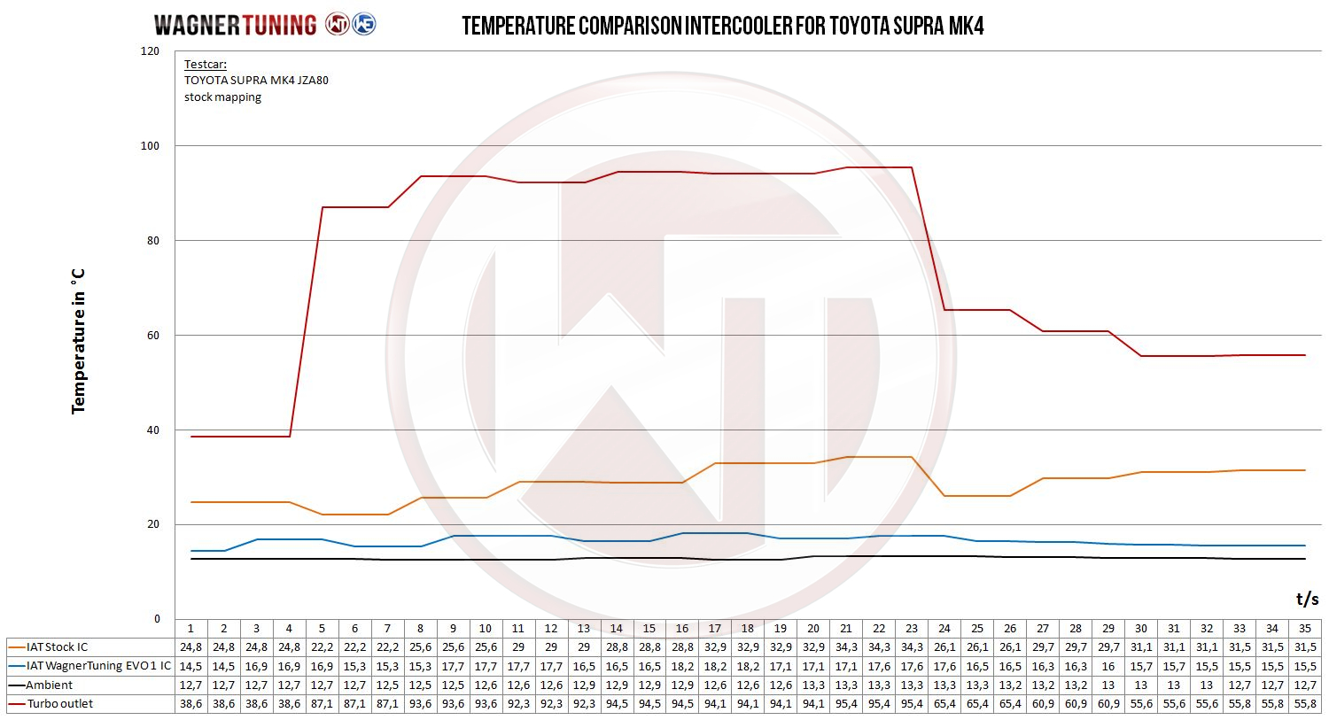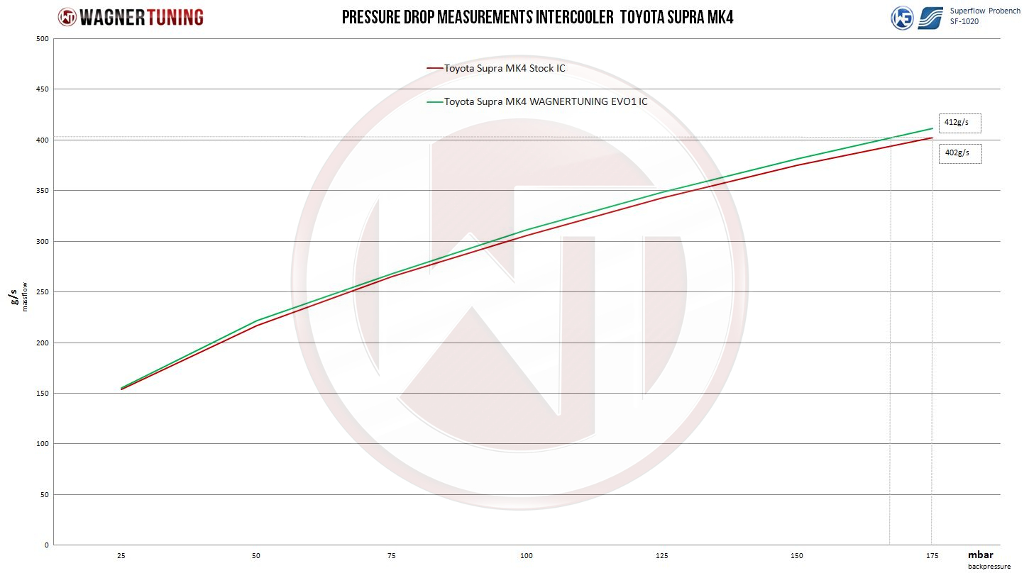 Experience ultimate performance and optimal cooling with the Wagner Tuning high performance intercooler for the Toyota Supra.This technological masterpiece is designed to take your driving experience to a new level and push the limits.The high performance intercooler is equipped with a new type of Competition intercooler core (Tube Fin), whose dimensions of 700 mm x 300 mm x 90 mm offer an impressive external core volume of 18.9 liters. Compared to the standard intercooler, this allows for an amazing 262% larger front flow area and 150% more outer core volume. Feel the difference and maximize the performance of your Toyota Supra. The intercooler's precision CAD-designed cast aluminum end boxes have been optimized through CFD simulations to ensure ideal internal airflow. The result is outstanding cooling characteristics with minimal back pressure. Perfect for racing, this kit provides optimal cooling of the supercharged air with a significant increase in power. To ensure a lasting and optimal cooling effect, the Wagner Tuning intercooler is equipped with an anti-corrosion coating with excellent heat conduction properties. This protects the intercooler from any environmental influences and enables reliable performance. You can rest assured that all our products are subject to constant qualitative monitoring to ensure the highest standards.Installation is hassle-free thanks to the included mounting hardware and is plug and play. However, please note the following important installation instructions:- 100% plug-and-play installation- Conversion from SMIC to FMIC (incl. all required components)- Expansion tank must be repositioned (included in the kit)- Cooling loop for the servo has to be repositioned (included in the kit)- Complete charge air piping must be replaced (included in kit)Dive into the world of high-performance tuning with the Wagner Tuning high-performance intercooler for the Toyota Supra. Increase the performance of your vehicle, feel the power and dominate the road like never before. Treat yourself to the premium quality and advanced technology that only Wagner Tuning can offer.The Competition intercooler kit EVO1 for Toyota Supra JZA80 MK4core Dimensions stock intercooler:270 mm x 215 mm x 130 mm / 10,6 Inch x 8,5 Inch x 5,1 InchV = 7,54 L / 460 Inch³A = 580,5 cm² / 90 Inch²core Dimensions Wagner Tuning intercooler:700 mm x 300 mm x 90 mm / 27,5 Inch x 11,8 Inch x 3,54 InchV = 18,9 / 1153 Inch³ +150%A = 2100 cm² / 325 Inch² +262%Part number: 200001154kit comes with:1 intercooler (black)6 silicone adapter hoses (black)2 Ø2,5 Inch boost pipe aluminum (black)2 Ø3 Inch boost pipe aluminum (black)2 air guides (black)1 expansion tank (black)1 cooling loop for the power steering (black)1 mounting material1 installation instruction