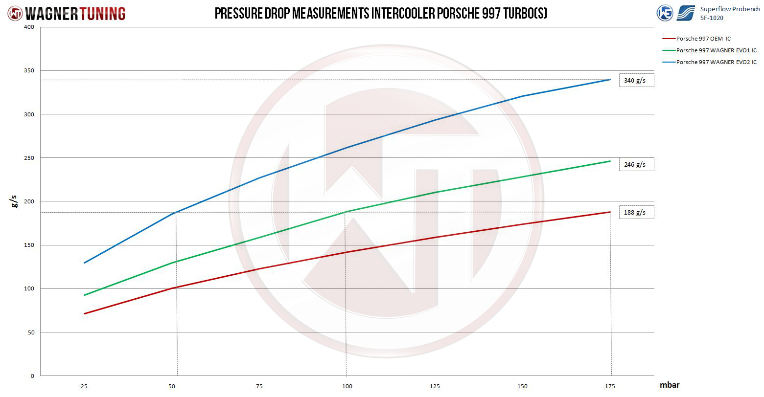 EVO 2 High Performance Intercooler Kit: The ultimate performance upgrade for your Porsche 997 Turbo.Experience the untamed power of your Porsche 997 Turbo with our EVO 2 high-performance intercooler kit. Here's what this kit has to offer.Our EVO 2 high-performance intercoolers (2 x [330mm x 222mm x 145mm] = 21,244cc). Are designed to provide a whopping 77% more charge air volume than the factory intercoolers. This translates into a significant increase in your vehicle's performance. Our specially designed Competition high performance intercooler core ensures excellent cooling characteristics. Even under extreme conditions, your engine will maintain the optimum temperature. Despite its impressive performance, our intercooler kit is surprisingly lightweight. Each of the two coolers weighs just 2x 6.7 kg, which helps reduce weight in addition to increasing performance.CAD designed cast aluminum freeform end boxes provide the best possible internal airflow and high pressure resistance of up to 6 bar (tested). Our kit includes a custom-fit carbon air duct that ensures the intercooler is optimally supplied with fresh air. This is crucial for maximum performance of your vehicle. The kit includes additional silicone hoses with an enlarged cross-section to optimize airflow.Our intercoolers are finished with an anti-corrosion coating that not only ensures durability, but also provides excellent heat conduction properties. Our kit comes complete with new carbon air guides, silicone hoses and aluminum adapters. Installation is simple and replaces the factory intercoolers. This kit is specifically designed for racing and features a 70mm intake and exhaust for maximum performance.Get the most out of your Porsche 997 Turbo with our EVO 2 high performance intercooler kit. Visit our website for more information and to order your kit.The Wagner Tuning Competition Intercooler EVO2 Upgrade Kit for Porsche 997 Turbo (S).Is suitable for the following models :Porsche 997 Turbo (2006-2008) 3,6L;353KW / 480HPPart number: 200001079Kit comes with:2 intercooler4 carbon air ducts4 silicone hoses4 hose clamps1 mounting material