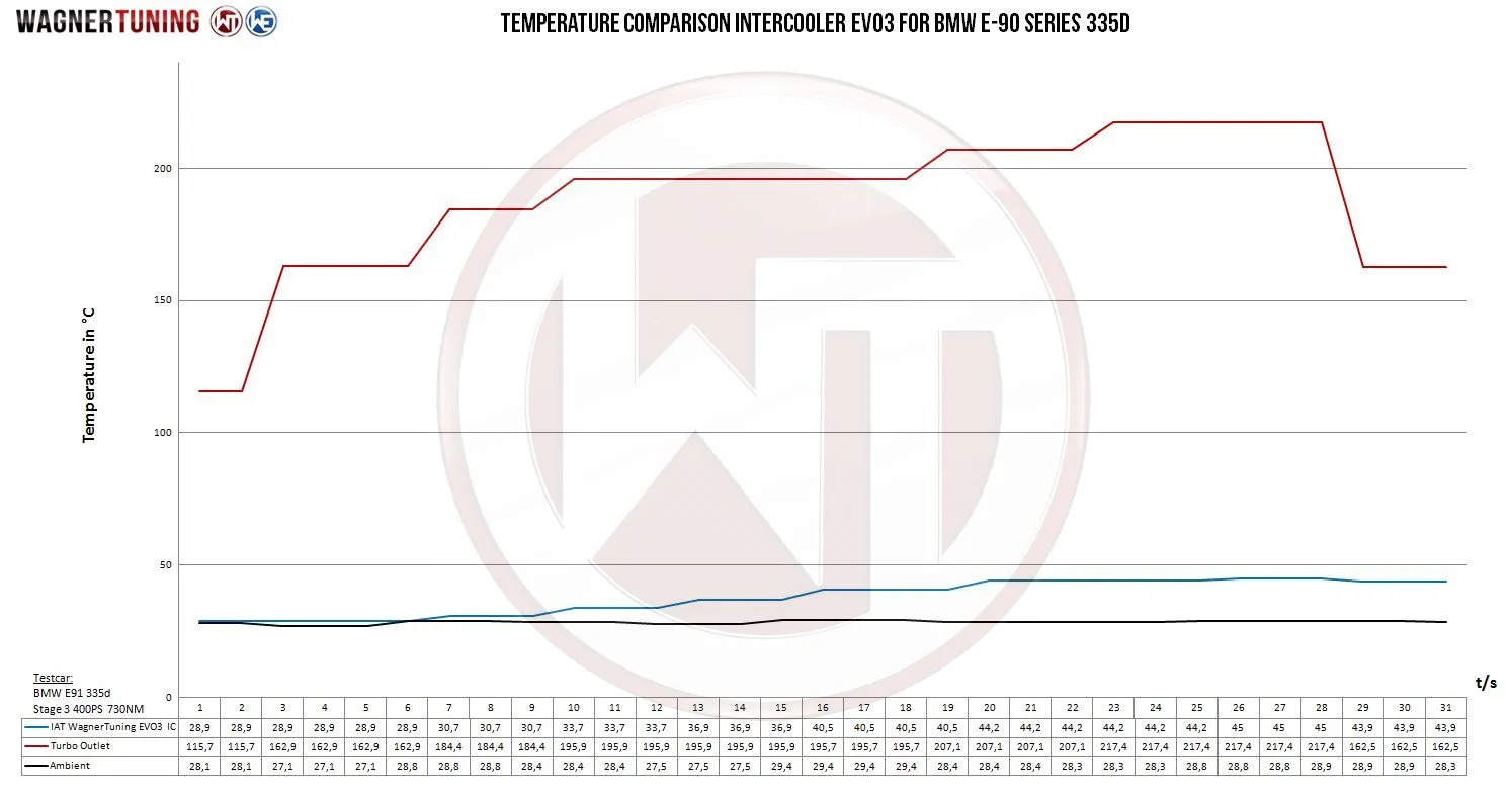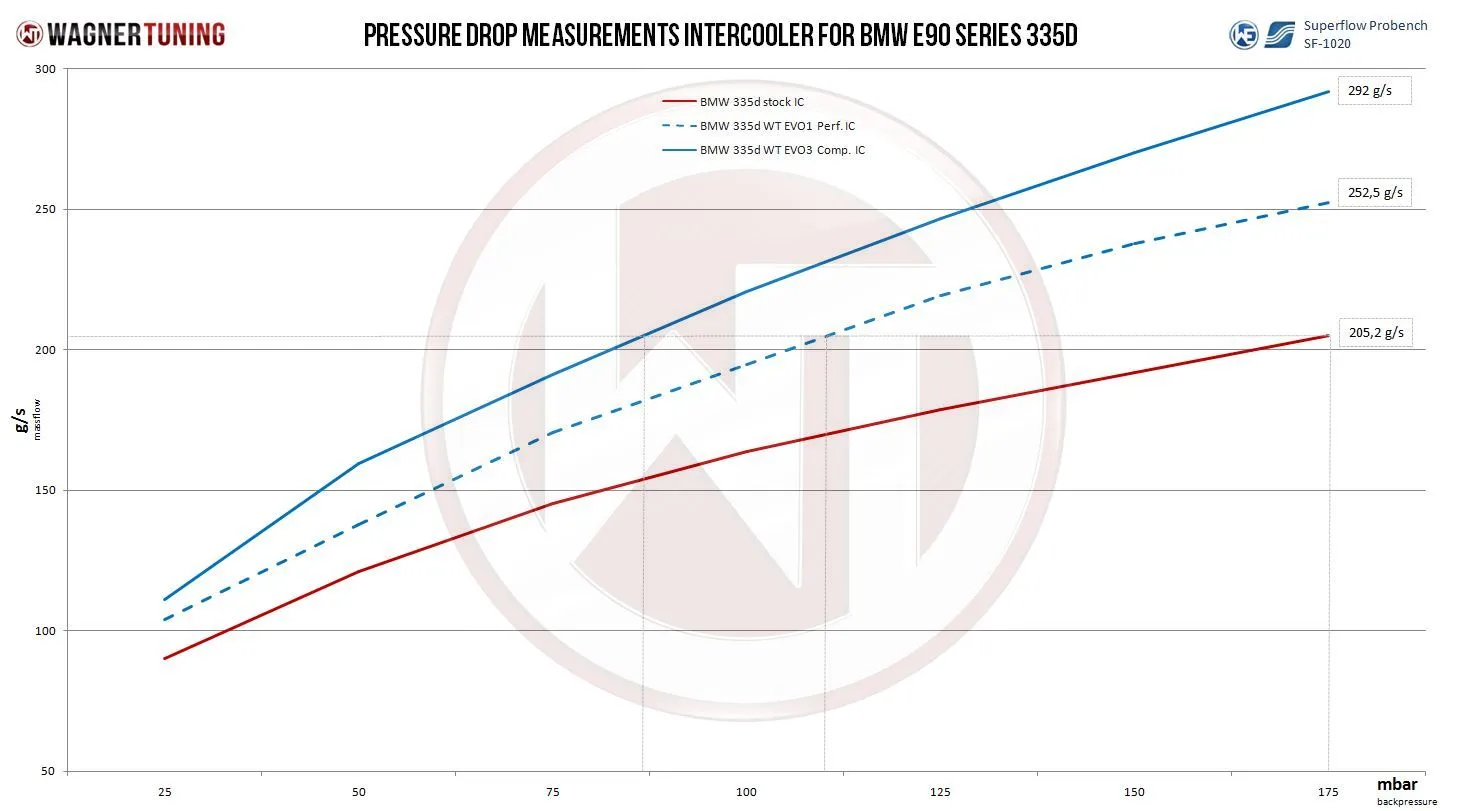 Unleash the full potential of your BMW 335d with the EVO3 high performance intercooler.This cooler exceeds all expectations, with core dimensions of 510mm x 303mm x 180mm (stepped to 20.65L). Compared to the stock intercooler, it offers an impressive 133% larger flow area and a whopping 183% more charge air volume. Our Competition high-performance intercooler core is a masterpiece of engineering, a Tube Fin core with internal turbulators that takes air cooling to a new level. Despite its size, this cooler surprises with a total weight of only 13.2 kg.The EVO3 intercooler kit was specifically designed to meet the extreme demands of the largest tuning levels on the BMW 135i and 335i. Original click connections are a thing of the past, instead we offer generous connection diameters of Ø70 mm, supported by reinforced silicone hoses. The result? Excellent cooling with minimal back pressure.All of our charge air coolers feature an anti-corrosion coating that not only prevents corrosion, but also offers excellent heat conduction properties. This ensures lasting and optimal cooling performance with a noticeable increase in power. This kit is completely ready to install and can be easily replaced with your stock intercooler. However, due to its size, some minor adjustments to the radiator support will be required. This intercooler has been tested up to 6 bar and is absolutely pressure stable. You can rely on the quality of our products. Whether on the track or on the street, the EVO3 high performance intercooler is designed for racing and provides the power and cooling you need.Boost the power and cooling of your BMW 335d with the EVO3 high performance intercooler.The EVO III Competition intercooler kit is suitable for the following vehicles:BMW 335d E90/91/92/93 (2005-2013)* (without ACC).*Adjustments to the vehicle are necessary (see installation instructions)Only fits for cars without ACC-unitcore dimensions OEM intercooler:V = 7,29 LA = 663 cm²core dimensions Wagner Tuning intercooler:V = 20,65 LA = 1545 cm²Part number 200001130Kit comes with:1 intercooler (black coated)3 silicone hoses1 aluminum adapter (black anodized)1 aluminum charge air pipe ( black anodized)1 mounting material1 assembly instruction