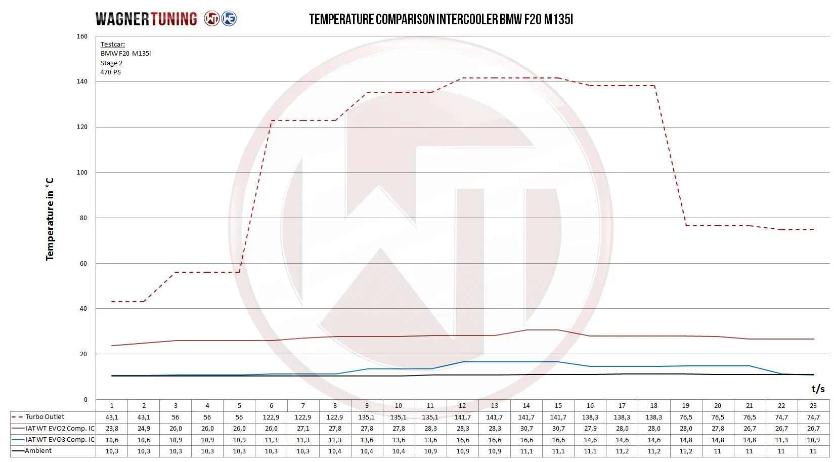 Experience the ultimate performance upgrade with our high performance intercooler for the BMW M135i and M235i.This impressive intercooler sets new standards and is specifically designed to meet the high demands of the big tuning levels.With intecooler core dimensions of 510mm x 345mm x 180mm (stepped 23.56L), our intercooler offers a 165% larger flow area and a whopping 223% more charge air volume than the original intercooler. The high-quality Competition high-performance core with internal turbulators ensures optimum cooling performance. Despite its imposing size, the entire intercooler weighs just 13.8 kg, highlighting its efficiency and lightweight construction. The cast aluminum end boxes of the charge air cooler were optimized using flow analyses in the CFD system to ensure outstanding cooling properties with minimal backpressure. Our kit EVO3 eliminates the original click connections and expands the connection diameters to Ø65mm at the inlet and Ø76mm at the outlet. Additionally, the kit includes reinforced silicone tubing and an aluminum charge air tube in Ø76mm. The result is unmatched cooling performance with a significant increase in power.Our intercoolers are all coated with a high-quality anti-corrosion coating, which not only ensures protection against environmental influences, but also has excellent heat conduction properties. This ensures long-lasting and optimal cooling. Our intercooler kit is supplied complete and is ready for installation. Replacing it with the stock parts is easy thanks to the modified crossmember that comes with it. Due to the extreme size of the intercooler, minor adjustments to the radiator support may be required.Our high performance intercooler has been tested under extreme conditions and is pressure stable up to 6 bar. Each of our products is subject to constant qualitative monitoring to ensure the highest reliability. This intercooler is the perfect choice for racing and lets your vehicle set new standards in power and performance.The intercooler kit EVO III Competition fits the following vehicles with N55 engine:BMW F30 / F31 / F34 / F35 335i 225KW/306hp (2012-2015)BMW F32 / F36 435i 225KW/306PS (2013-2016)Not suitable for xDrive models.core dimensions original intercooler:510mm x 130mm x 110mmV=7,3 literA=663 cm²core dimensions Wagner Tuning intercooler:510mm x 345mm x 180mm [stepped].V=23,56 LiterA=1759,5 cm²Part number: 200001183Comes with:1 intercooler1 Ø76mm charge air pipe1 external air duct2 silicone hoses1 aluminum adapter1 crossbar1 mounting material1 assembly instruction