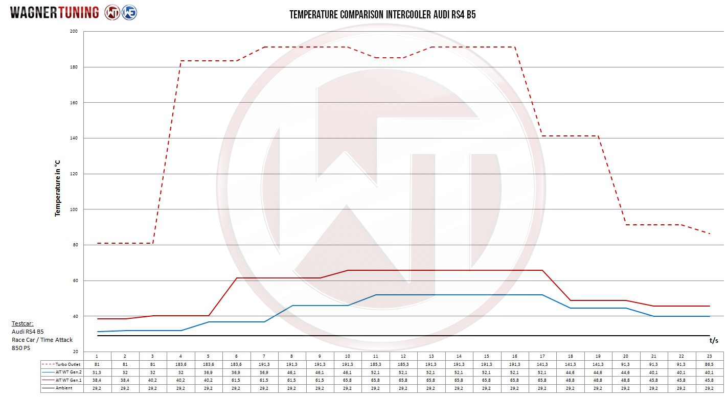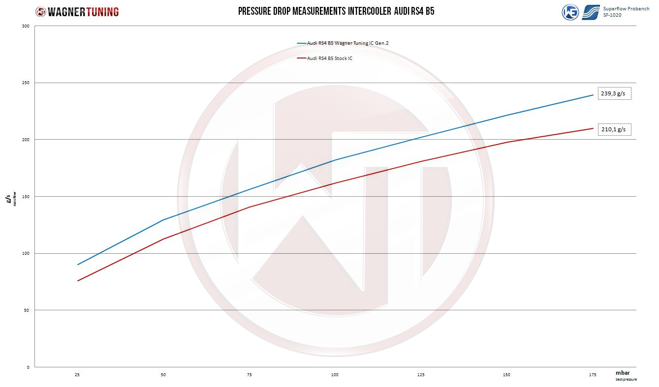 Przygotuj się na przekraczanie granic. Zestaw Wagner Tuning Gen2 Competition Intercooler wyniesie Twoje Audi RS4 B5 na wyższy poziom osiągów i zapewni niezrównane wrażenia z jazdy.Nowe, wysokowydajne intercoolery imponują wymiarami rdzenia: 255 mm x 265 mm x 90 mm. Oznacza to aż o 46% większą powierzchnię czołową i ogromny, 89% wzrost objętości powietrza doładowującego, co wyraźnie odróżnia RS4 B5 od seryjnych intercoolerów.Doświadcz rewolucyjnej wydajności chłodzenia dzięki nowo opracowanemu rdzeniowi Competition high-performance intercooler, bazującemu na najnowszej technologii tube-fin. Odlewane aluminiowe komory końcowe intercoolera zoptymalizowano w systemie CAD z użyciem zaawansowanej analizy przepływu, aby zapewnić idealny przepływ wewnętrzny i zminimalizować przeciwciśnienie.Ten zestaw intercoolera został zaprojektowany specjalnie pod wysokie wymagania Audi RS4, aby dostarczyć szczytowe osiągi spełniające wymogi toru wyścigowego.Zapewnij optymalne chłodzenie sprężonego powietrza i poczuj wyraźny wzrost mocy. W porównaniu z Performance Gen.1 intercooler ponownie widać znaczącą poprawę.W zestawie znajdują się karbonowe kierownice powietrza, które nie tylko poprawiają osiągi, ale też stanowią atrakcyjny akcent wizualny w komorze silnika. Montaż odbywa się bezproblemowo w oryginalnych punktach mocowania, dzięki czemu szybko skorzystasz z zalet. Zestaw łączący wydajność i wygodę.W WAGNERTUNING jakość jest na pierwszym miejscu. Każdy nasz produkt, w tym Gen2 Competition Intercooler Kit, przechodzi rygorystyczną kontrolę jakości, aby zagwarantować najwyższą doskonałość. Gotowy na kolejny poziom? Chcesz uwolnić pełen potencjał swojego Audi RS4 B5? Wybierz Wagner Tuning Gen2 Competition Intercooler Kit i doświadcz osiągów, na które zasługujesz.