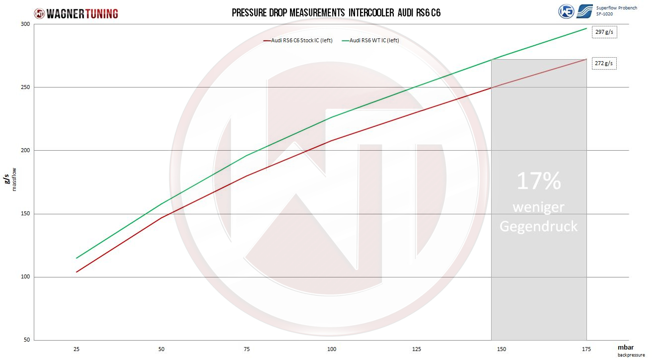Revolutionary high performance intercooler for the Audi RS6 C6.Prepare to push the performance limits of your Audi RS6 C6. The Wagner Tuning high performance intercooler is designed with a groundbreaking competition mesh (Tube Fin) that is specifically engineered to meet the demanding needs of your vehicle. With our newly developed HD-Fin type insert, you will achieve the best possible performance and set new standards.The outer dimensions of the intercooler mesh are 283 mm x 225 mm x 90 mm + 283 mm x 193 mm x 55 mm (stepped mesh: 8.73 liters). This high performance mesh adds a whopping 79% more external mesh volume compared to the original intercooler. With a precise focus on size and efficiency, we bring you a powerhouse that optimizes airflow and takes cooling to a new level.Technology for racing: mature design for maximum performance. Our cast aluminum end boxes were developed in CAD and perfected through extensive CFD simulations. The result is remarkable cooling properties with minimal back pressure. If you are striving for peak performance on the race track, this kit is your perfect choice. Optimal cooling of the supercharged air is accompanied by a significant increase in power.The original air ducts can still be used, while the original auxiliary water coolers are replaced by the water coolers included in the kit. The installation is done on the original mounting points and is very easy (plug and play). So you can quickly benefit from the advantages of this high performance intercooler.An anti-corrosion coating with excellent heat conduction properties protects the Wagner Tuning intercooler from the effects of the environment. This means you can rely on a lasting and optimal cooling effect that enhances your performance. We rely on constant quality monitoring to ensure that our product meets the highest standards.Get the Wagner Tuning Competition CHARGE AIR COOLER KIT for Audi RS6 C6 4F 426KW/580PS (2008-2010) and experience performance at a new level.Inlet diameter: Ø64mm (same as OEM) and exhaust diameter: Ø60mm (same as OEM).core dimensions OEM intercooler:V = 4.88 LA = 637 cm²core dimensions Wagner Tuning intercooler:V = 8,73 L (+79%)A = 637 cm²Part number: 200001146Kit comes with:2 intercoolers black coated (right/left)1 water cooler black coated1 crossbeam black coated4 water hoses1 mounting material1 installation instruction