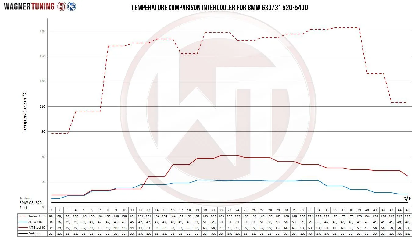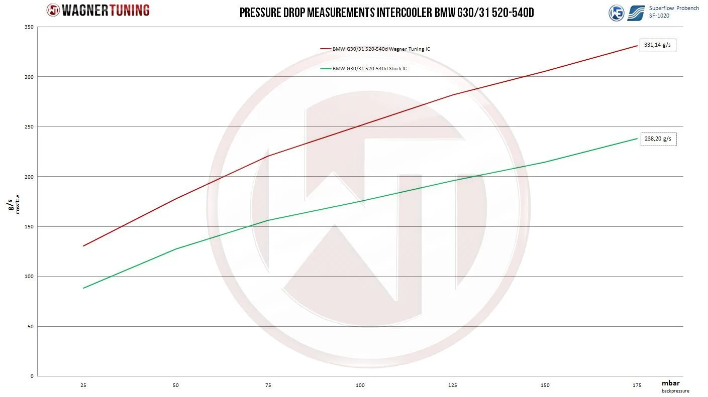 Optimize the performance of your BMW with our Competition high-performance intercooler!Want to unleash the full potential of your BMW? Our Competition high-performance intercooler is the answer to your performance needs and offers:Our intercooler sets new standards. With impressive intercooler core dimensions of 570 mm x 236 mm x 150 mm (stepped), it offers an astonishing 70% larger flow area and a substantial 112% more charge air volume compared to the standard intercooler. This results in a noticeable increase in power and a better overall driving experience.Our high performance Intercooler core is specially designed and stands out for its quality. It consists of a Tube Fin core with internal turbulators, which provides optimal airflow and heat dissipation.Although our intercooler is large, it weighs only 10.5 kg. This means that you can increase the performance of your BMW without increasing the weight, which has a positive effect on driving dynamics.Through extensive flow optimization in the CAD system, the cast aluminum end boxes of our intercooler ensure excellent cooling performance with minimal back pressure. This is crucial for efficient performance enhancement. All our charge air coolers are equipped with an anti-corrosion coating that not only prevents rust, but also has heat conduction properties. This provides durable and optimal cooling, which in turn improves performance.Our intercooler comes as a complete ready-to-install kit that allows for easy replacement with the stock intercooler - plug and play. It is still possible to use the original intercooler hoses. We subject all of our products to rigorous quality monitoring to ensure you receive only the best.It's time to take your BMW's performance to a new level. With our Competition high-performance intercooler, you can expect more power, better cooling and an overall improved driving experience.Experience the future of performance enhancement. Invest in quality and boost your BMW's performance with our Competition high-performance intercooler!Competition Intercooler Kit for BMW G30/31 518-540d G32 620-640dBMW G30/G31 518d MKB: B47 110KW/150PS (2018+) *.BMW G30/G31 520d MKB: B47 140KW/190PS (2017-2020) *BMW G30/G31 525d MKB: B47 170KW/231PS (2017-2019) *BMW G30/G31 530d MKB: B57 195-210KW/265-286PS (2017-07/2020) *BMW G30/G31 540d MKB: B57 235-250KW/320-340HP (2017-07/2020) *BMW G32 620d MKB: B47 140KW/190PS (2018-2020) *BMW G32 630d MKB: B57 195-210KW/265-286PS (2017-07/2020) *BMW G32 640d MKB: B57 235-250KW/320-340PS (2017-07/2020) *BMW G11/12 740d MKB: B57 235-250KW/320-340PS (2017-07/2020) *BMW G14/15/16 840d MKB: B57 235-250KW/320-340PS (2017-07/2020) **not suitable for facelift vehicles with XD5O engine.*not suitable for facelift vehicle from 07/2020 onwardsCore Dimensions original intercooler:545mm x 145mm x 96mmV=7,6 literA=790 cm²Core Dimensions Wagner Tuning intercooler:570mm x 236mm x 150mm / steppedV=16,2 LiterA=1345 cm²