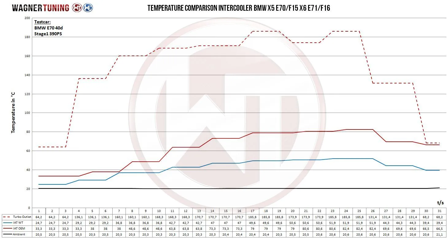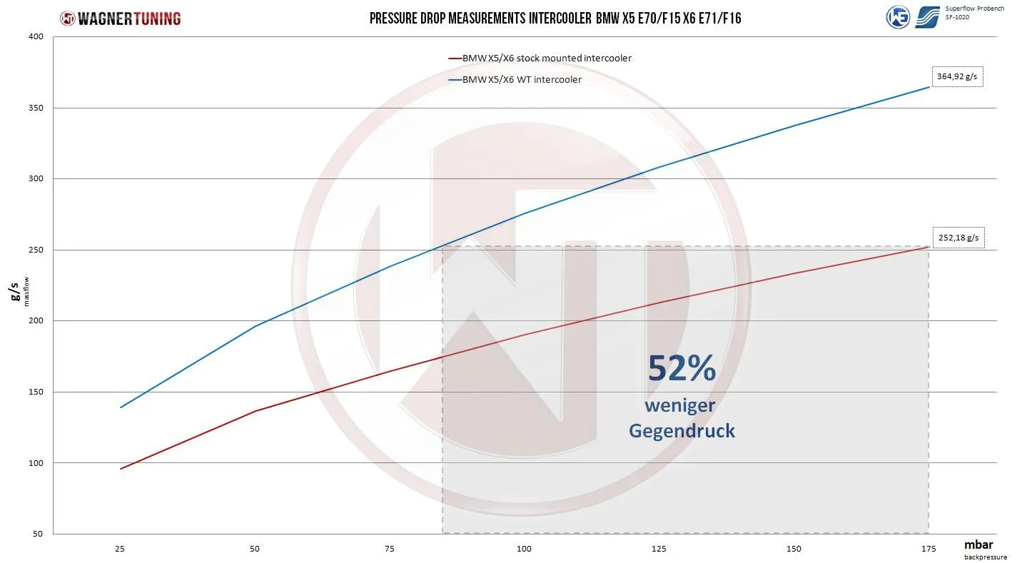 Unleash the full power of your BMW X5 - The Competition high-performance intercooler.Are you dreaming of a noticeable increase in performance in your BMW X5 3.0d or 3.0sd? Our Competition high-performance intercooler makes this dream a reality.With impressive intercooler core dimensions of 535 mm x 332 mm x 150 mm (stepped up to 19.2 liters), our intercooler offers a mind-blowing 113.5% larger flow area and an incredible 120% more charge air volume compared to the original.Our Competition high performance core is based on Tube Fin technology with internal turbulators. Despite its considerable size, the entire intercooler weighs only a light 12.5 kg. The cast aluminum end boxes have been optimized using flow analysis in the CFD system to reduce backpressure to a minimum. The result: outstanding cooling properties. Our intercoolers feature an anti-corrosion coating with outstanding heat conduction properties that ensure lasting and optimal cooling. Count on a continuous increase in performance. Our kit is completely ready to install and requires only the replacement of the stock intercooler - a plug-and-play experience. The original intercooler hoses can still be used. Our intercooler has been tested to an impressive 6 bar pressure and has proven its pressure stability.Trust in our constant qualitative monitoring. This intercooler was developed specifically for racing and meets the highest standards.Unleash the true power of your BMW X5 - with the Wagner Tuning Competition high-performance intercooler.The Competition intercooler fits the following vehicles:- BMW X5 E70 3.0d / 3.0sd (2006-2010).- BMW X5 E70 LCI 30dX / 35dX / 35iX / 40dX / 40iX (2009-2013)- BMW X6 E71 30dX / 35dX / 35iX / 40dX / 40iX (2007-2014)- BMW X5 F15 25d / 25dX / 28iX / 30dX / 35dX / 35i / 35iX / 40dX / 40eX (2012-2018)- BMW X6 F16 28iX / 30dX / 35i / 35iX / 40dX (2013-2018)Part number 200001125Kit comes with :1 intercooler1 mounting material1 assembly instruction