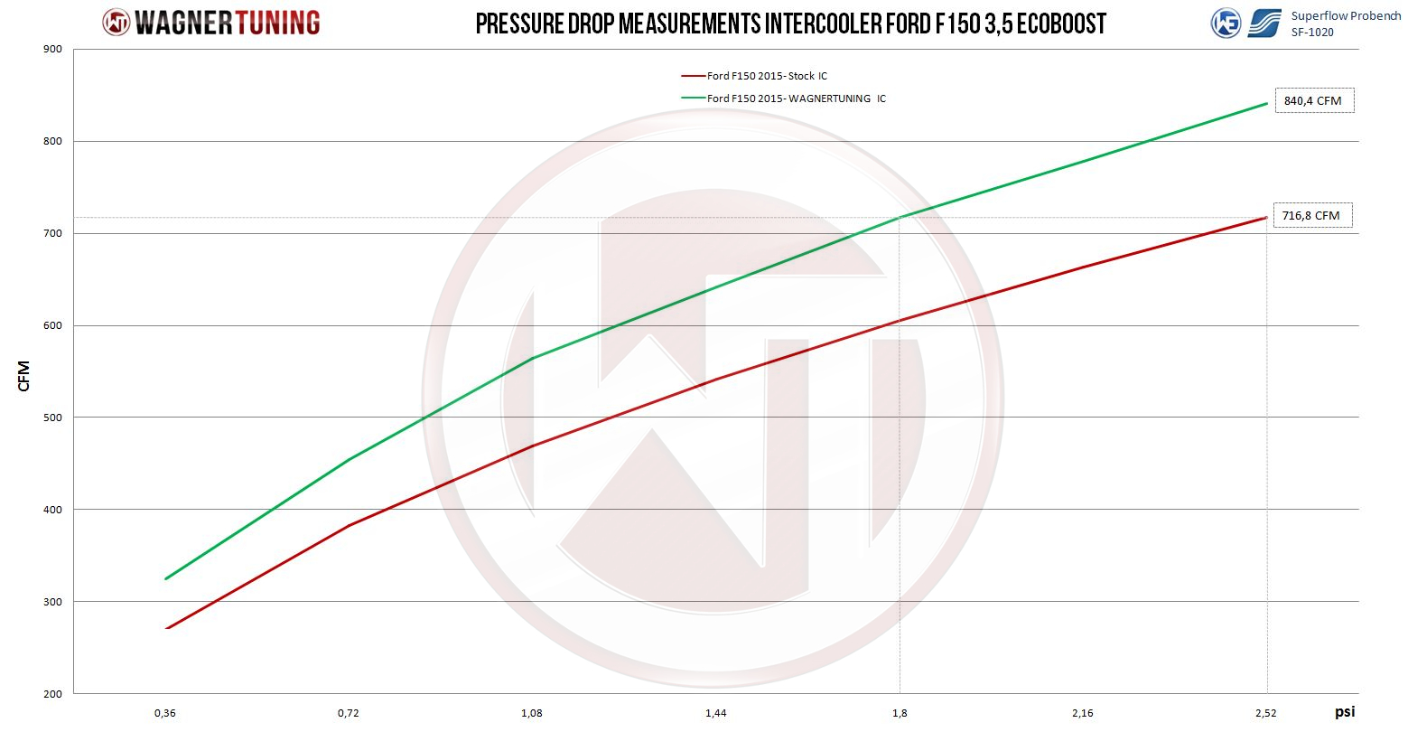 Increase the performance of your Ford F150 EcoBoost with our high performance intercooler.Your Ford F150 EcoBoost deserves the best performance, and that's exactly what our high-performance intercooler provides. Here are the stunning details:With mesh dimensions of 500mm x 388mm x 125mm (stepped), this intercooler offers an amazing 62% larger flow area and an impressive 108% more charge air volume compared to the factory intercooler. Our new Competition high performance mesh not only ensures high efficiency, but is also extremely lightweight. It improves the overall performance of your vehicle without weighing it down unnecessarily. The end boxes of the charge air cooler are made of cast aluminum and have been optimized down to the smallest detail using flow analyses in the CAD system. This enables significantly lower backpressure, which is particularly advantageous at low intake temperatures.The installation of this high-performance charge air cooler is uncomplicated and does not require any complex adjustments. Quality is our number one priority, and we ensure that every product meets our high standards. With our high-performance charge air cooler, we guarantee optimal cooling of the charged air. The result? A noticeable increase in performance that takes your driving experience to a new level. Like all our products, this intercooler is subject to strict qualitative monitoring. We do our best to make sure you get only the best.Ready to boost the performance of your Ford F150 EcoBoost? Install our high-performance intercooler today and experience the improvements firsthand. Visit our website for more information and to place an order.Intercooler Upgrade Kit for Ford (USA)F-150 3.5l ecoboost (2015-2016)F-150 2.7 liter EcoboostOEM intercooler:Cooling surface 1200cm²Charge air volume 9,6LWagner Tuning intercooler:Cooling surface 1940cm²Charge air volume 19,9LPart number 200001087Kit comes with:1 intercooler1 silicone hose
